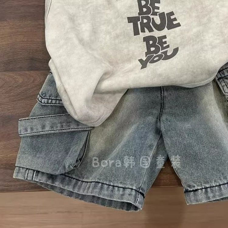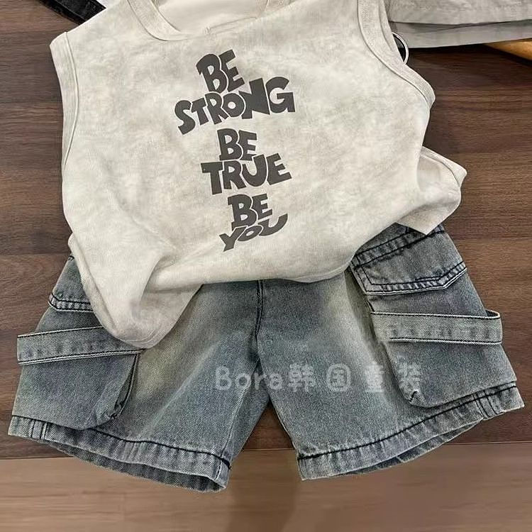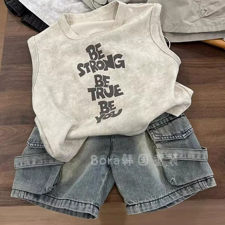 소년 세트 2025 년 여름 새 어린 시절 편안한 올 매치 민소매 조끼 느슨한 데님 반바지 투피스 세트