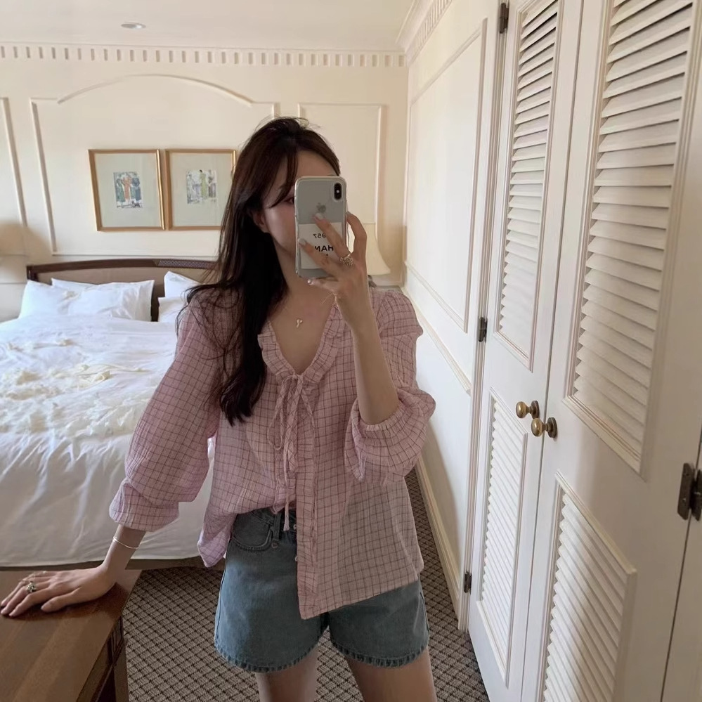 재고 있음】2026년 봄 신상품 한국 동대문 PTY 귀마개형 레이스업 체크 셔츠 BL16306