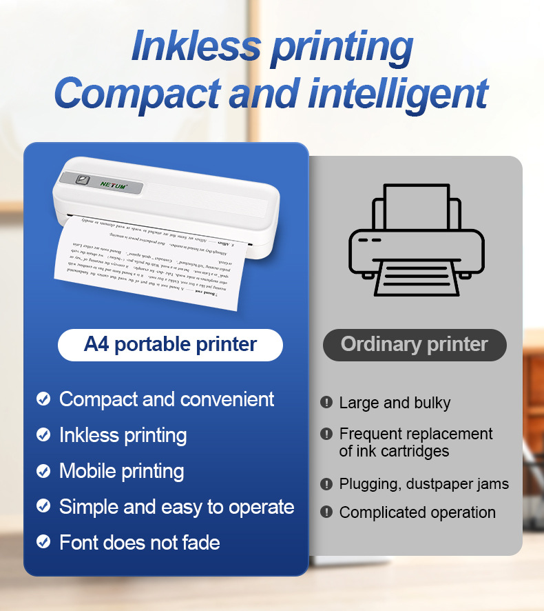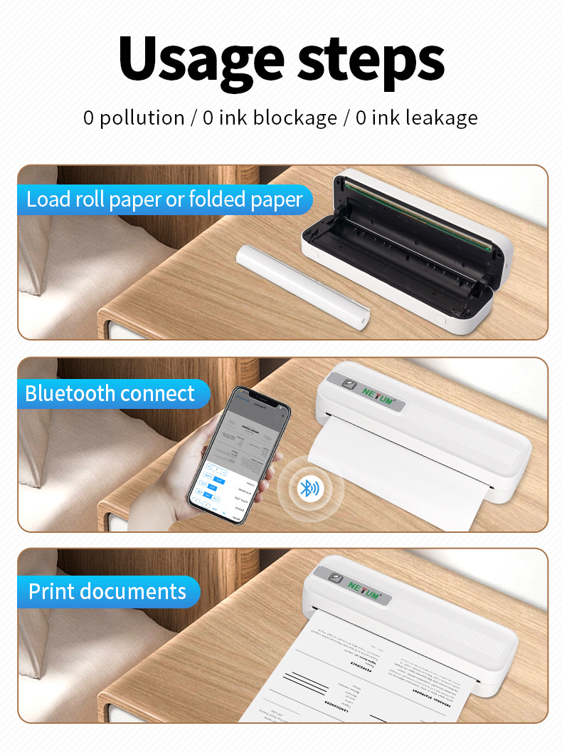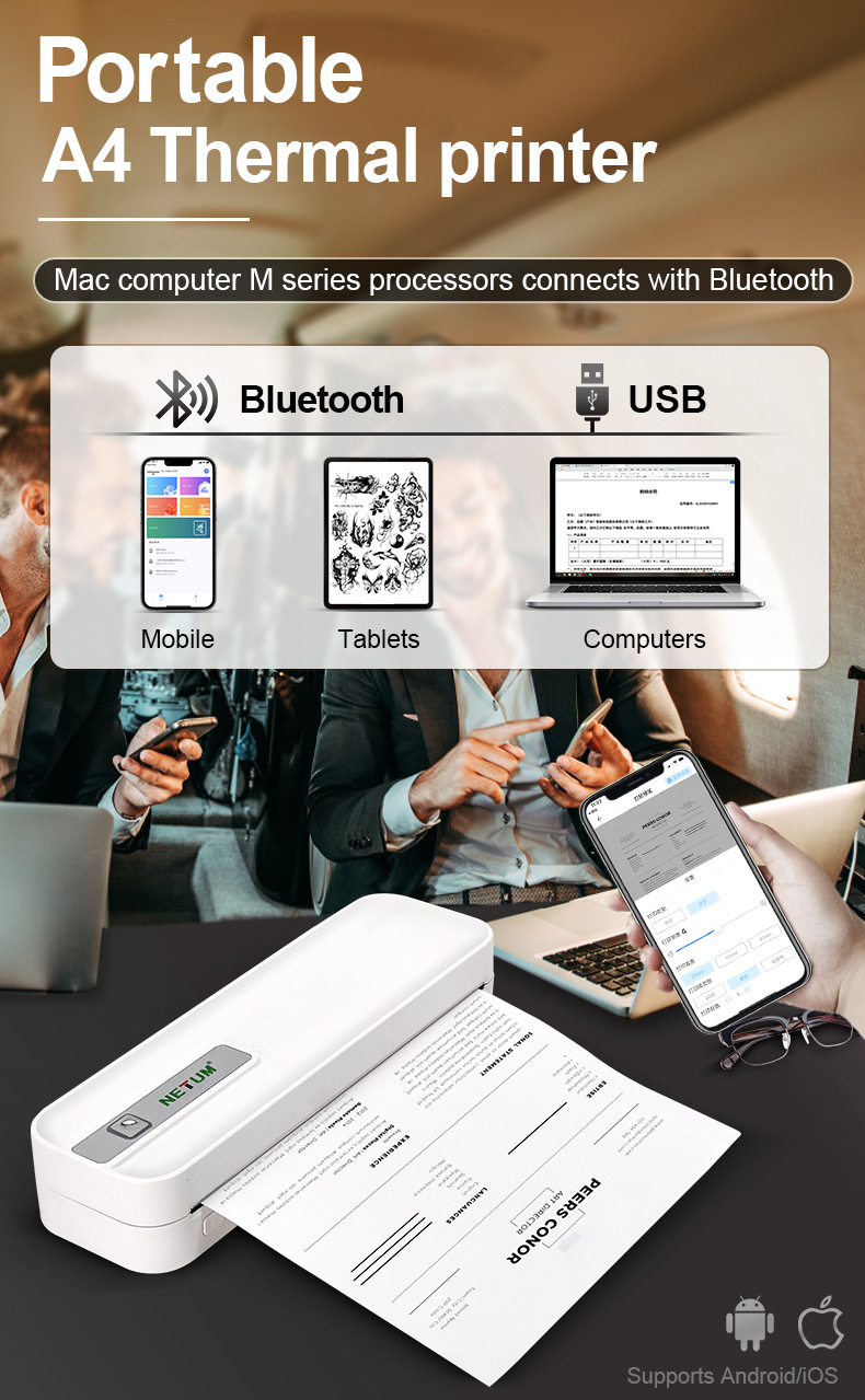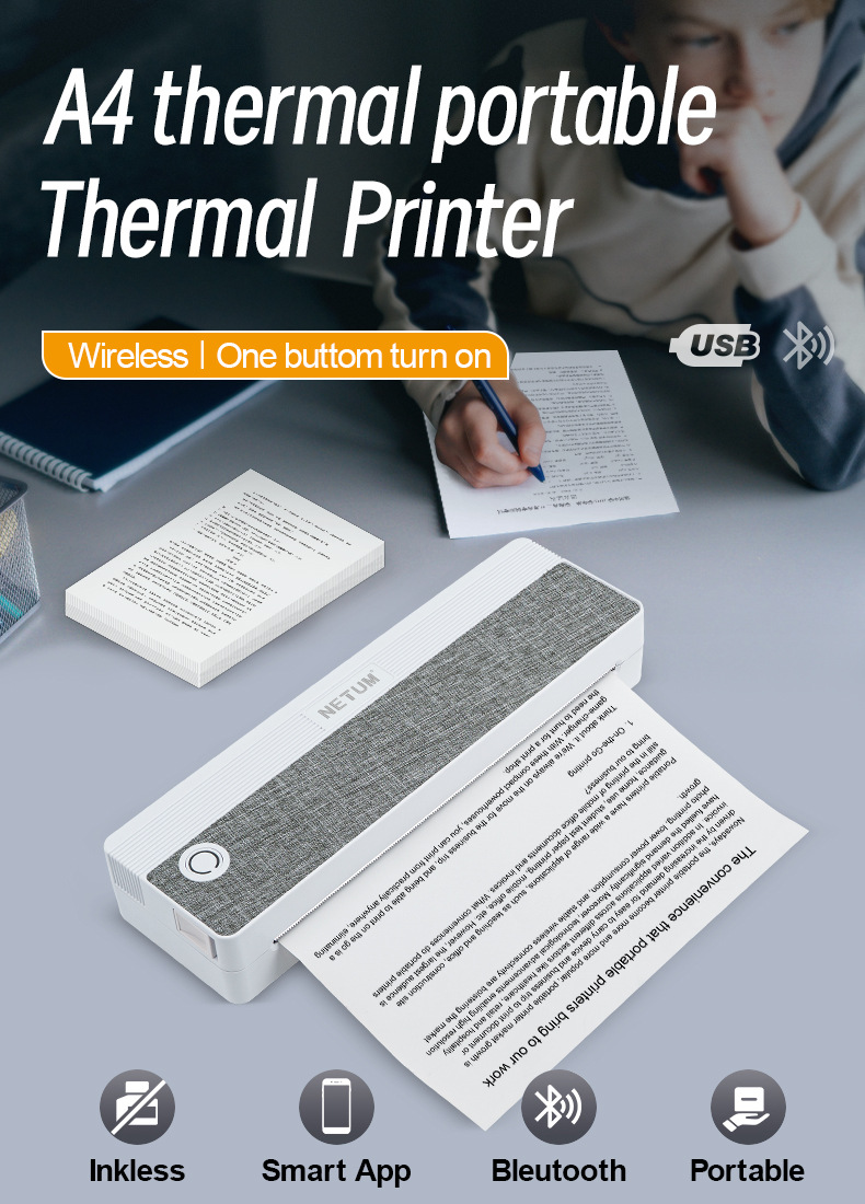 A4 Inkless Printer Easy Carry Wireless Portable Thermal Direct Printer Bluetooth Document Printer for Travel Business Office Home