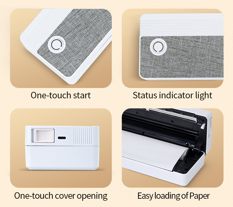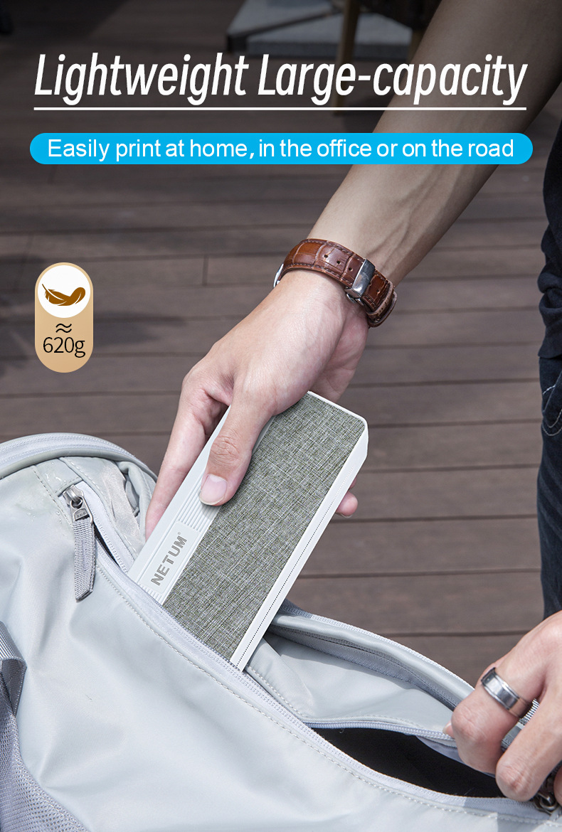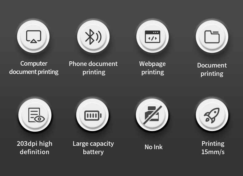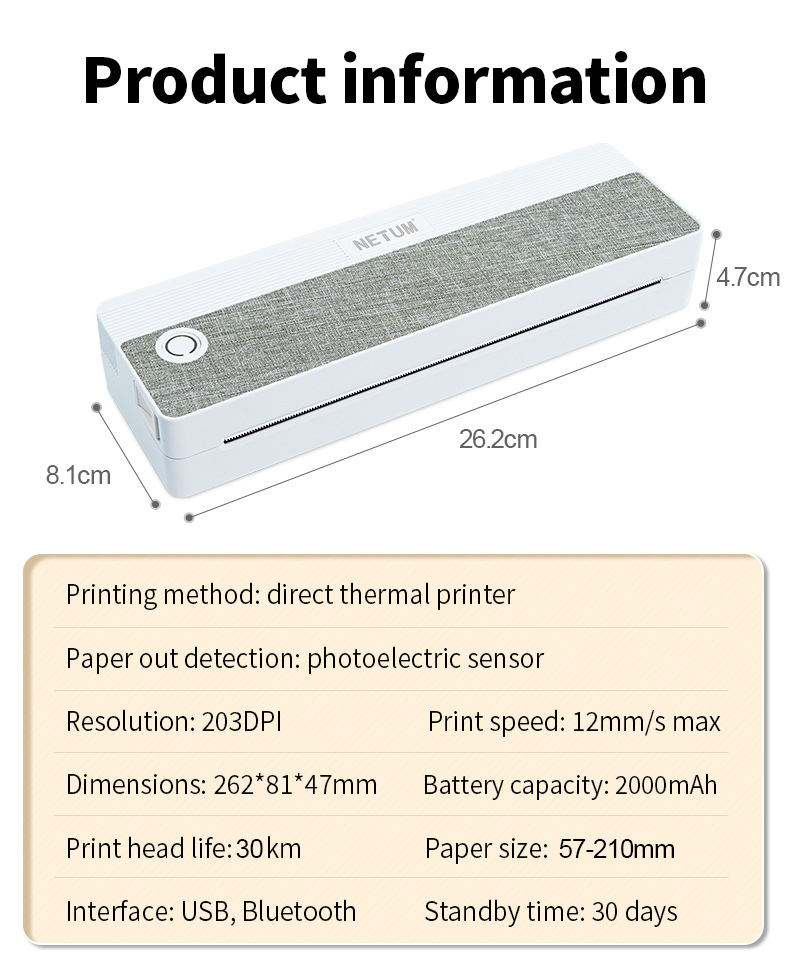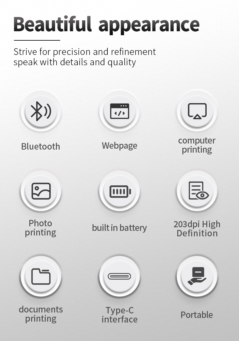 小巧便携,携带方便,随时打印,203dpi分辨率,先进的热敏技术,字迹清晰,保存时间长(5年以上),可锂电池供电,待机时间长,满电的情况状态下连续打印约200张A4纸,随机出厂配套可下载IOS和安卓系统APP,可打印PDF.word.网页.照片,合同.试卷等