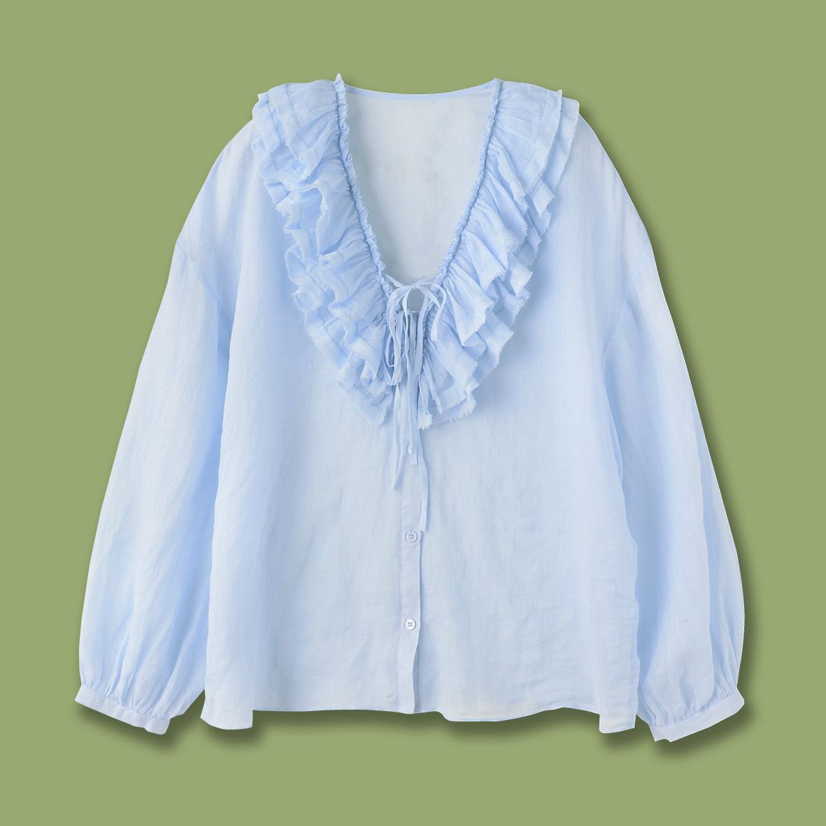 26 봄 여름 신상 긴팔 셔츠 로맨틱한 러플 V넥 얇은 탑 여성용 루즈핏 자외선 차단 셔츠 3J2C4021R스토어 가기