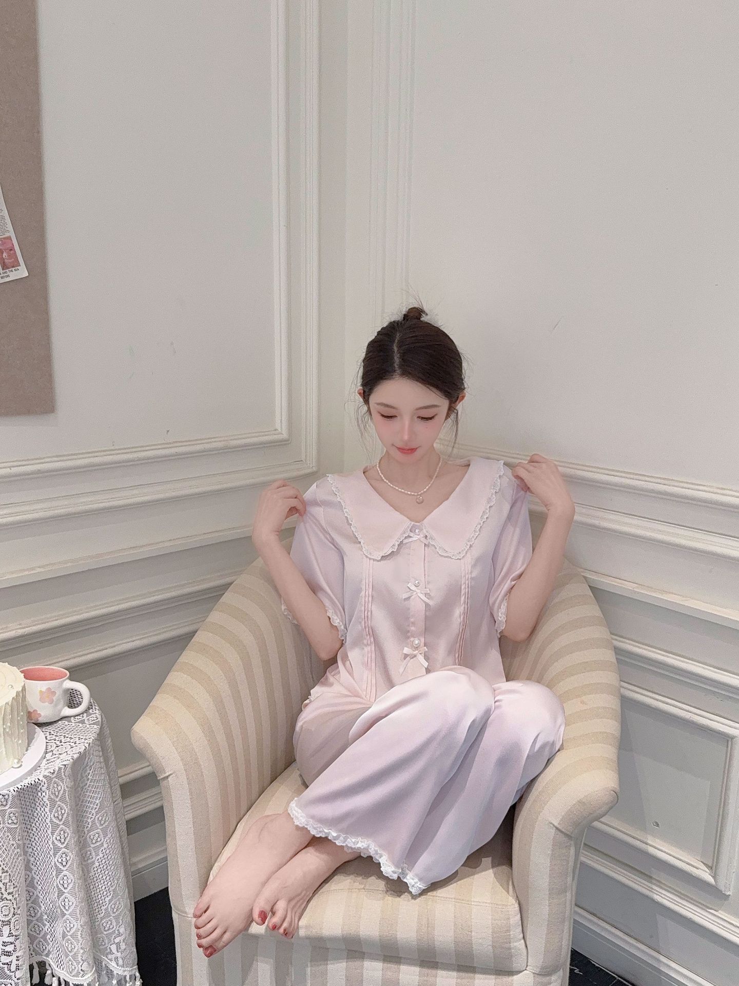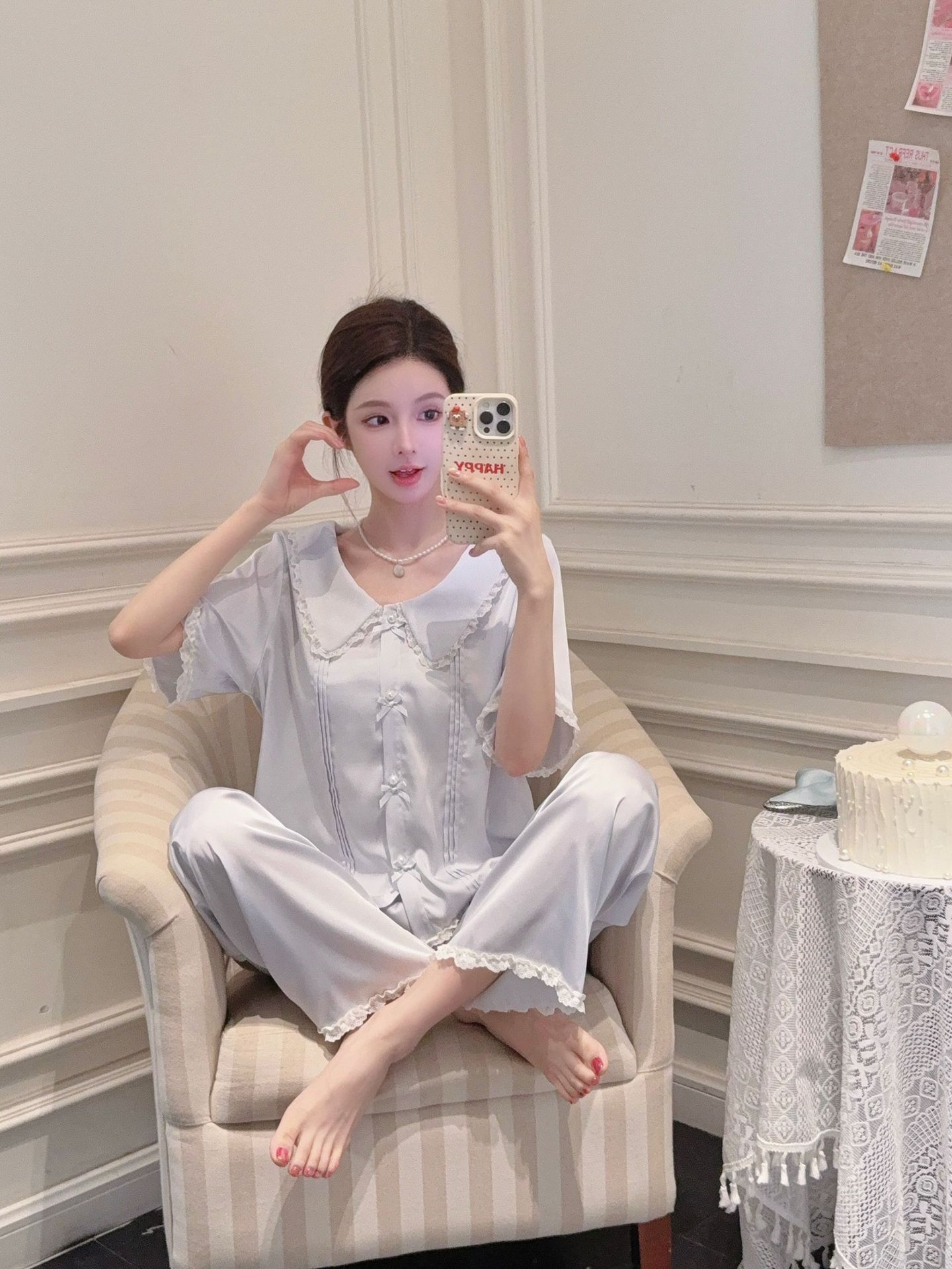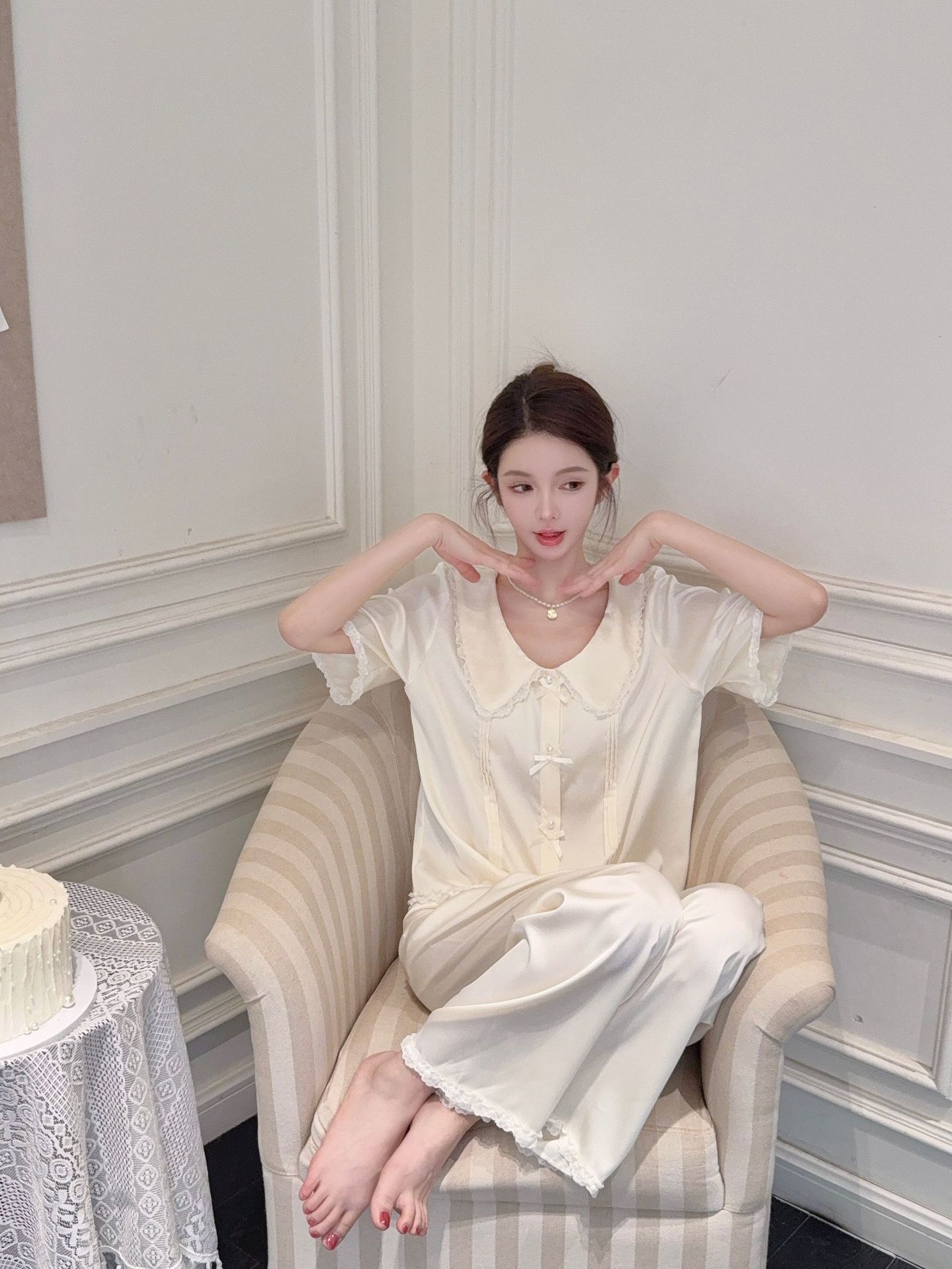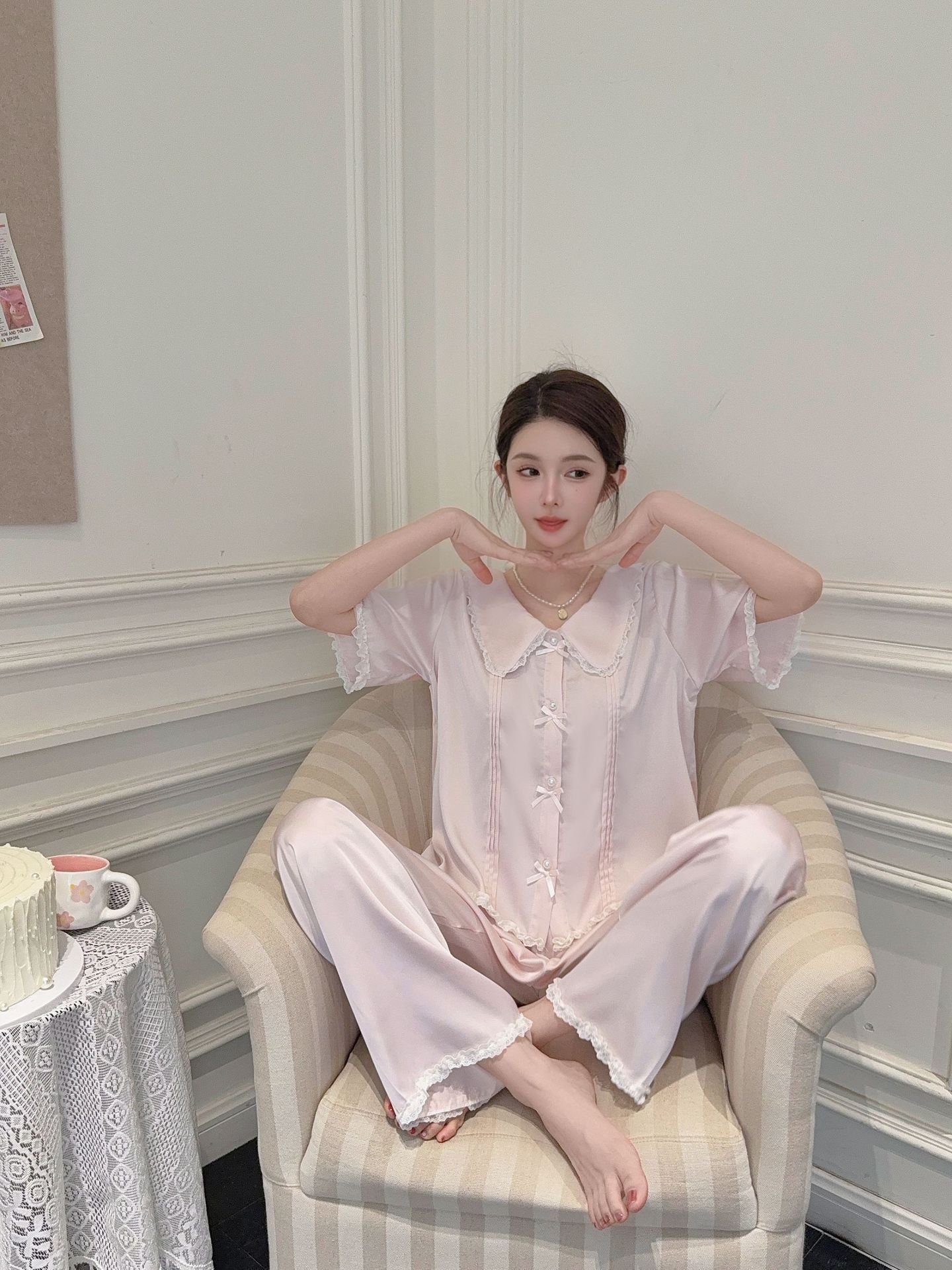 2025 새로운 잠옷 여성 여름 얼음 실크 반팔 바지 정장 독특하고 아름다운 한국 소녀 홈웨어스토어 가기