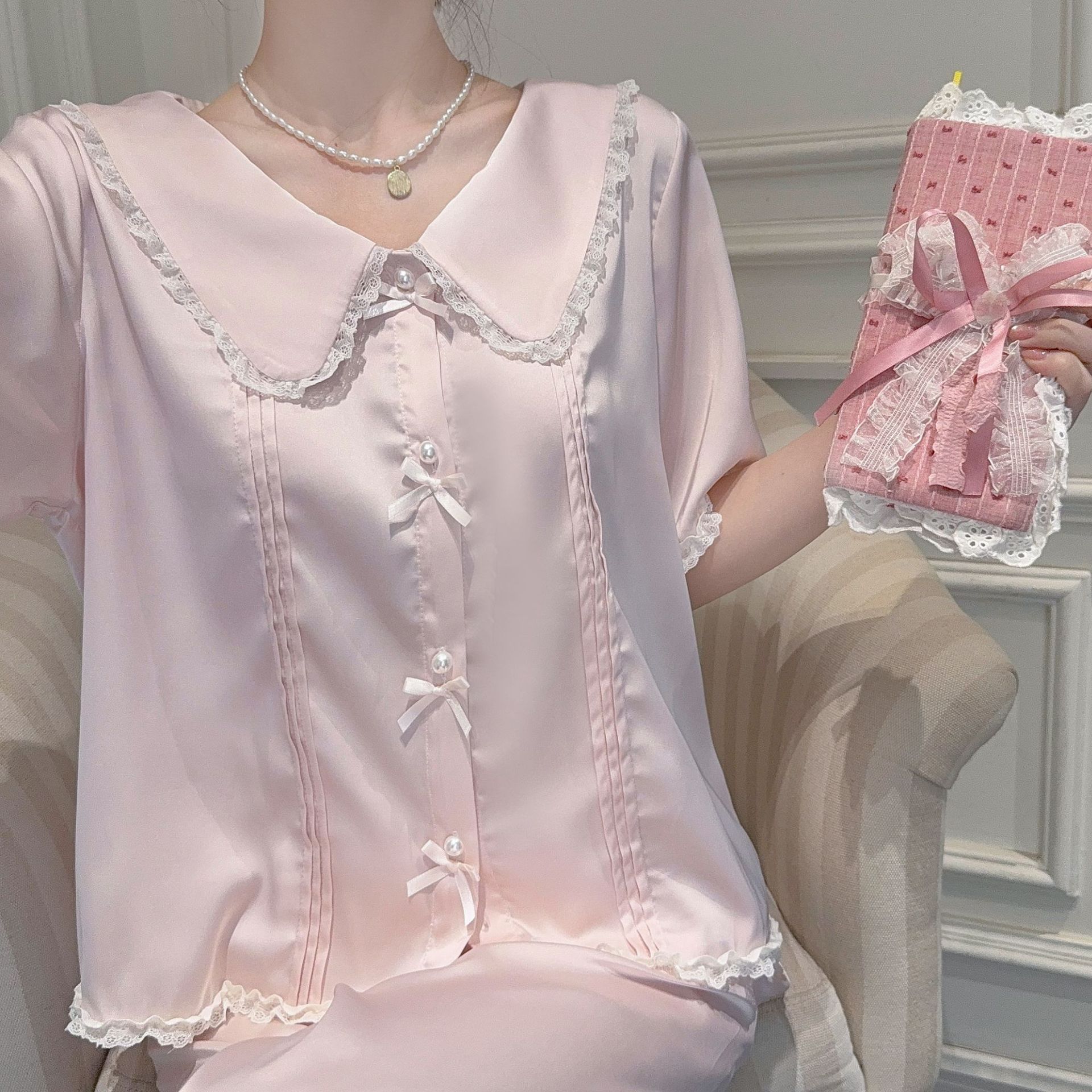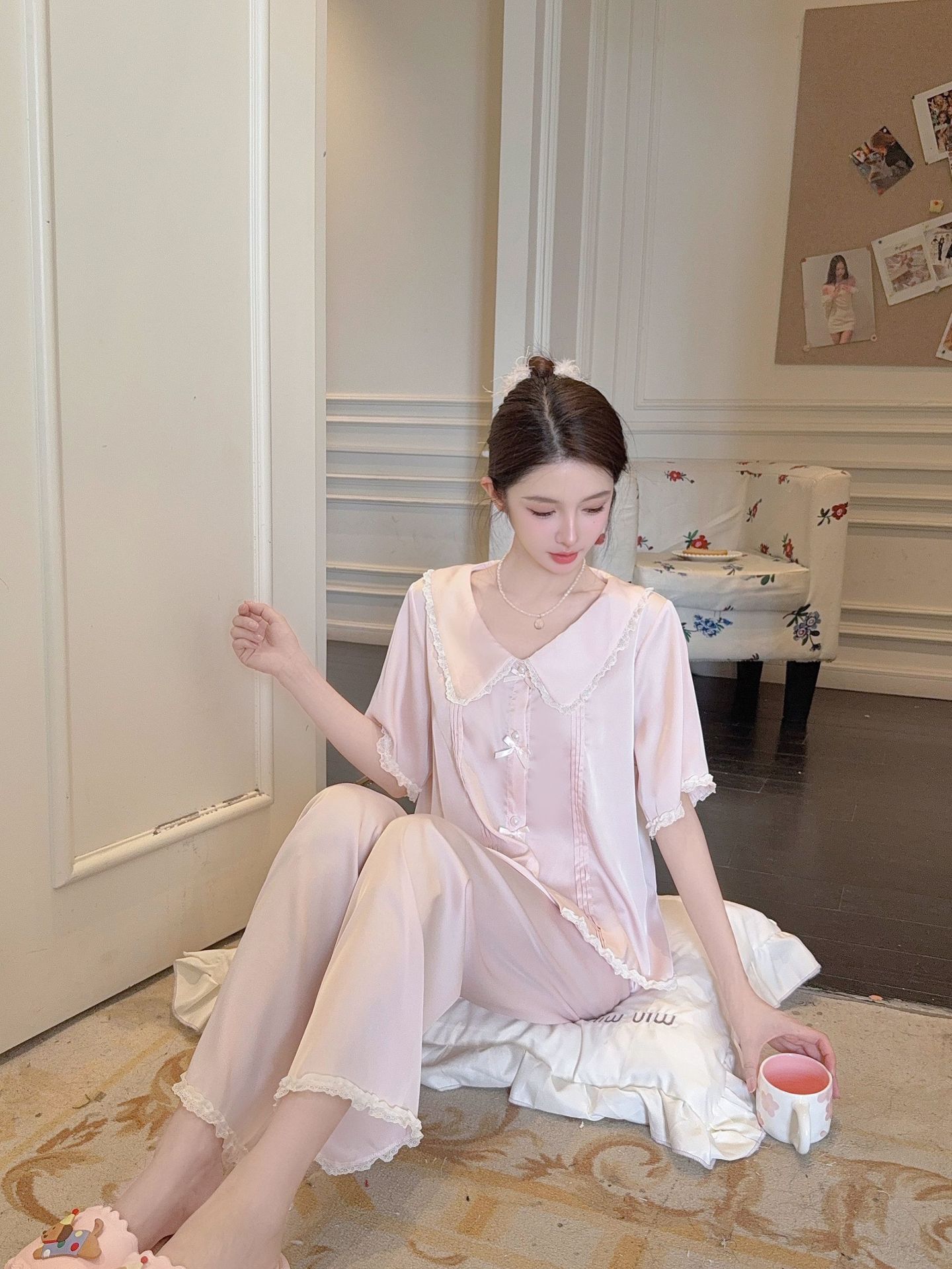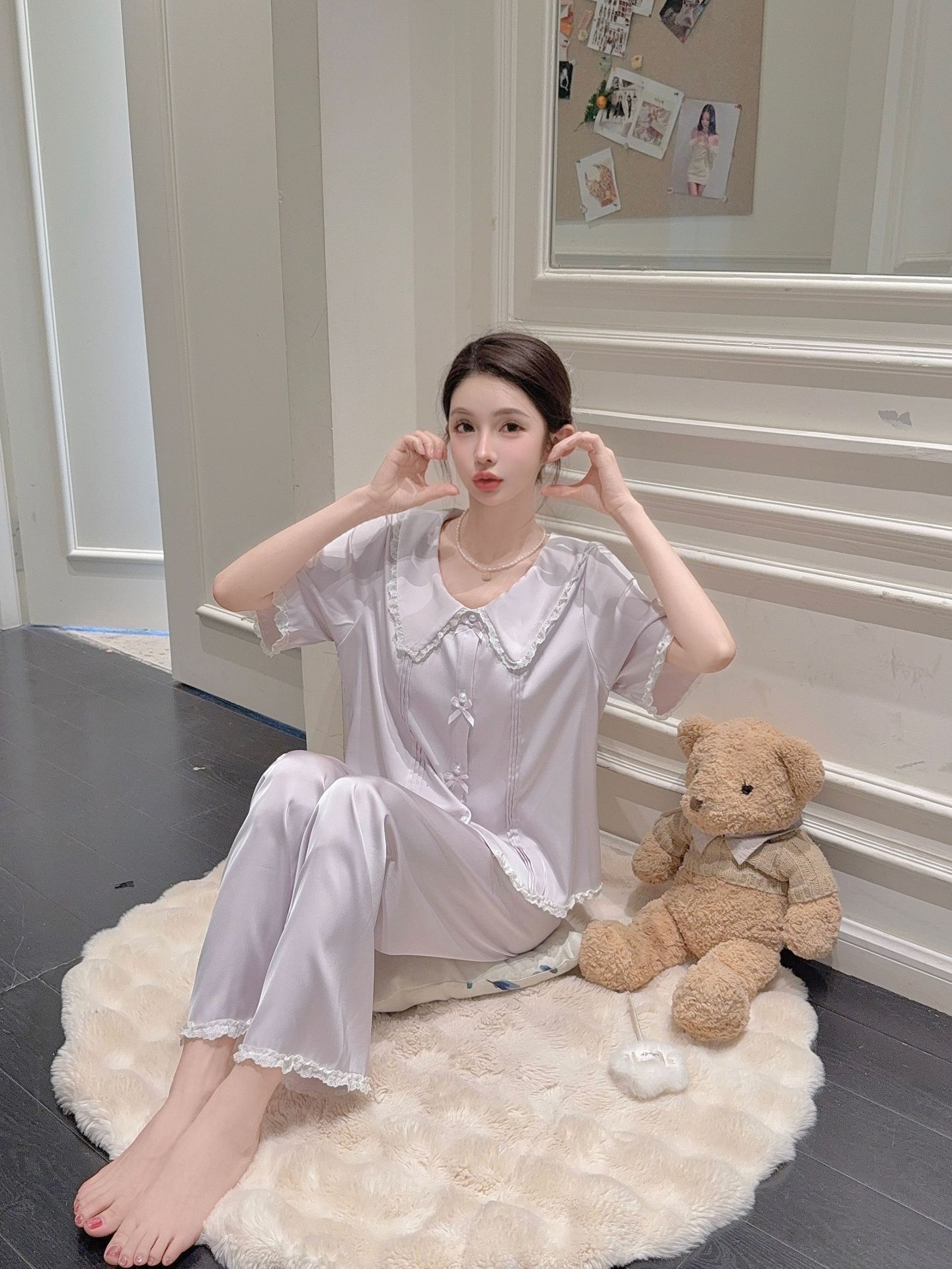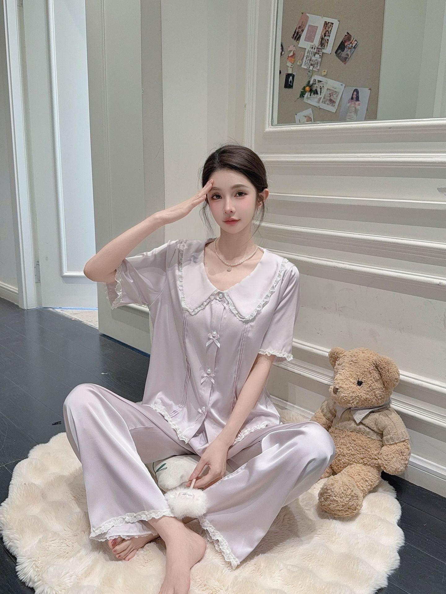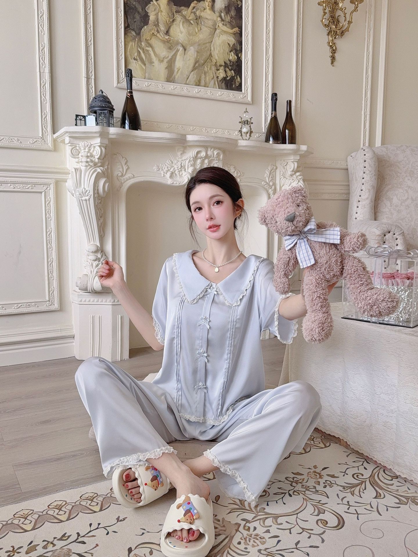 2025 새로운 잠옷 여성 여름 얼음 실크 반팔 바지 정장 독특하고 아름다운 한국 소녀 홈웨어스토어 가기