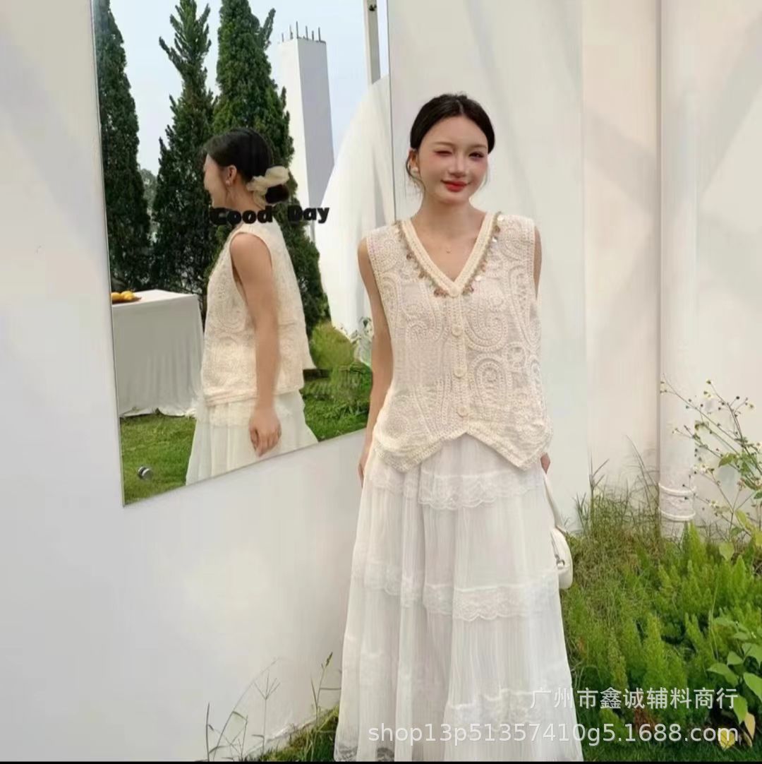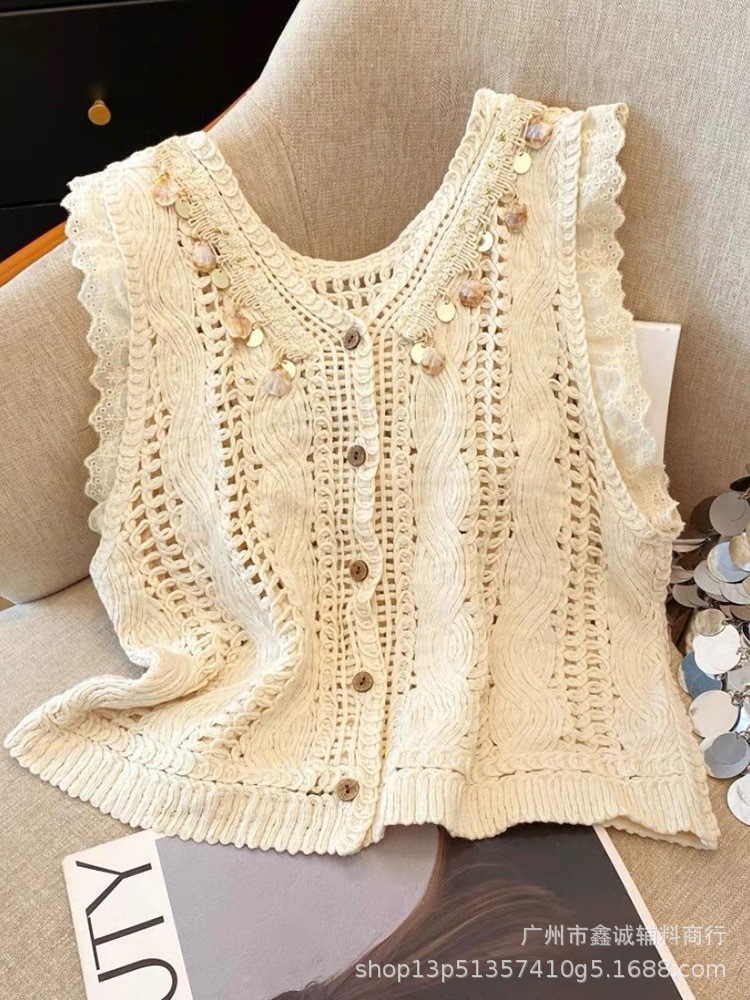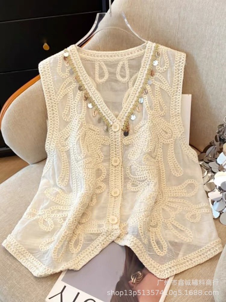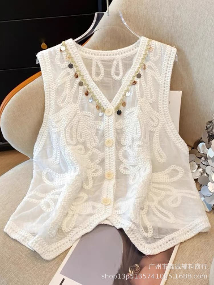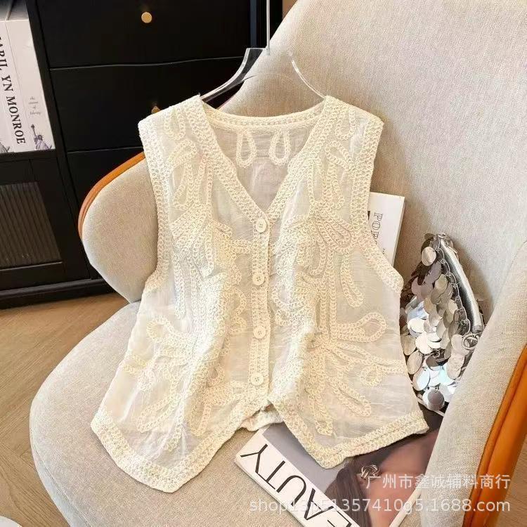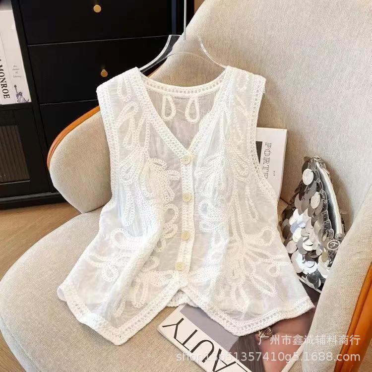 여성을위한 자수 니트 카디건 조끼 봄과 여름 새로운 핫 스타일 얇은 외부 조끼 디자인 중공 탑