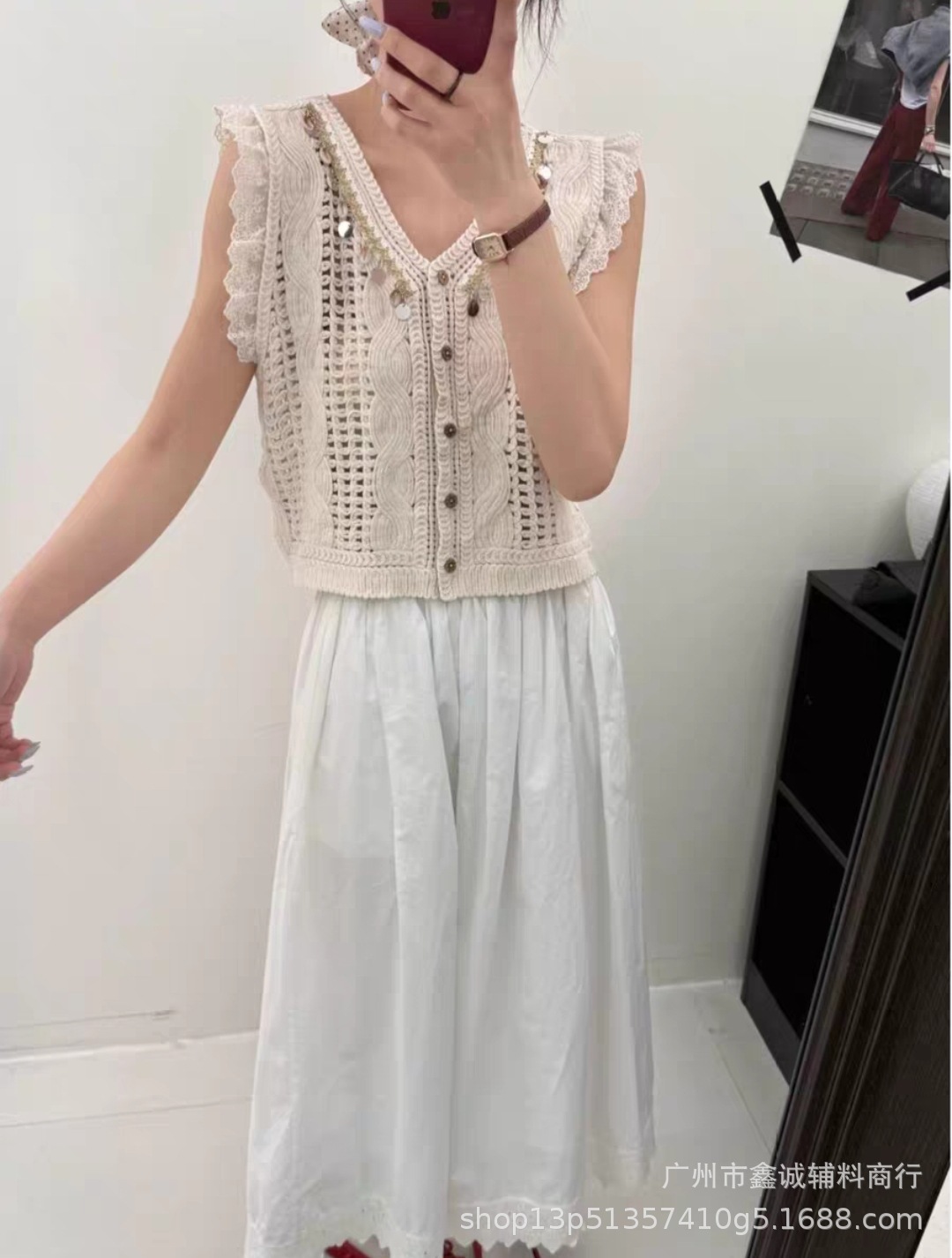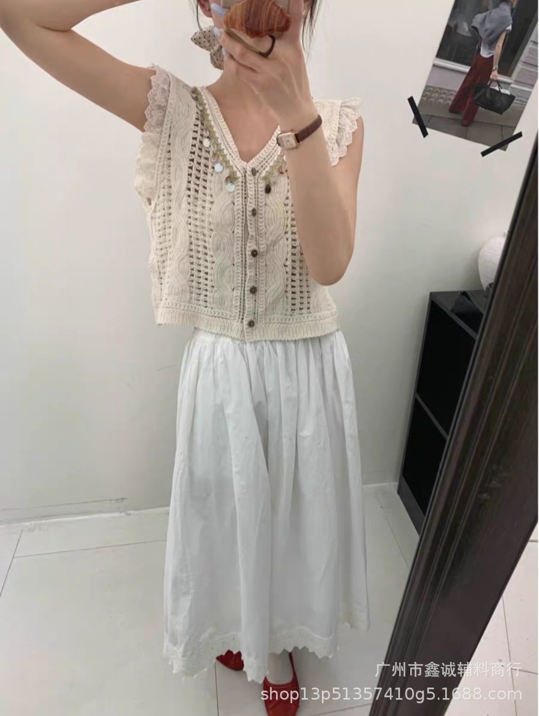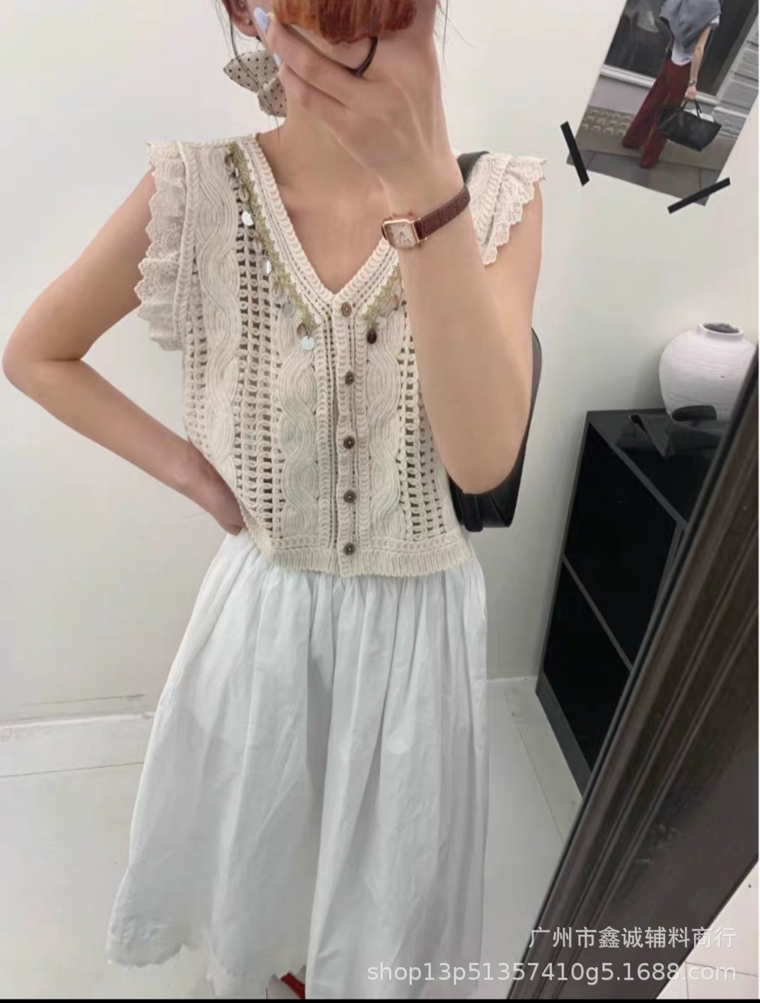 여성을위한 자수 니트 카디건 조끼 봄과 여름 새로운 핫 스타일 얇은 외부 조끼 디자인 중공 탑스토어 가기