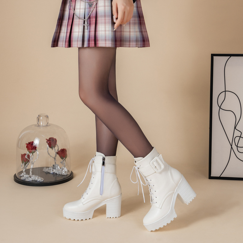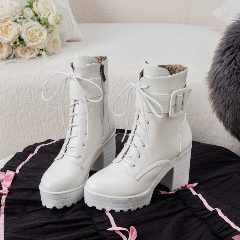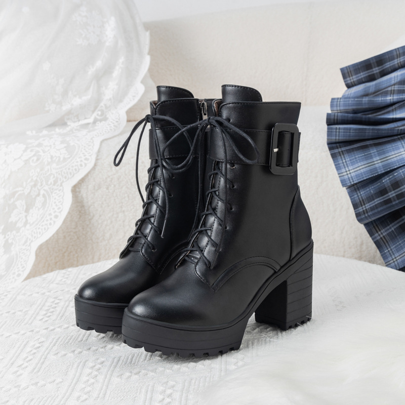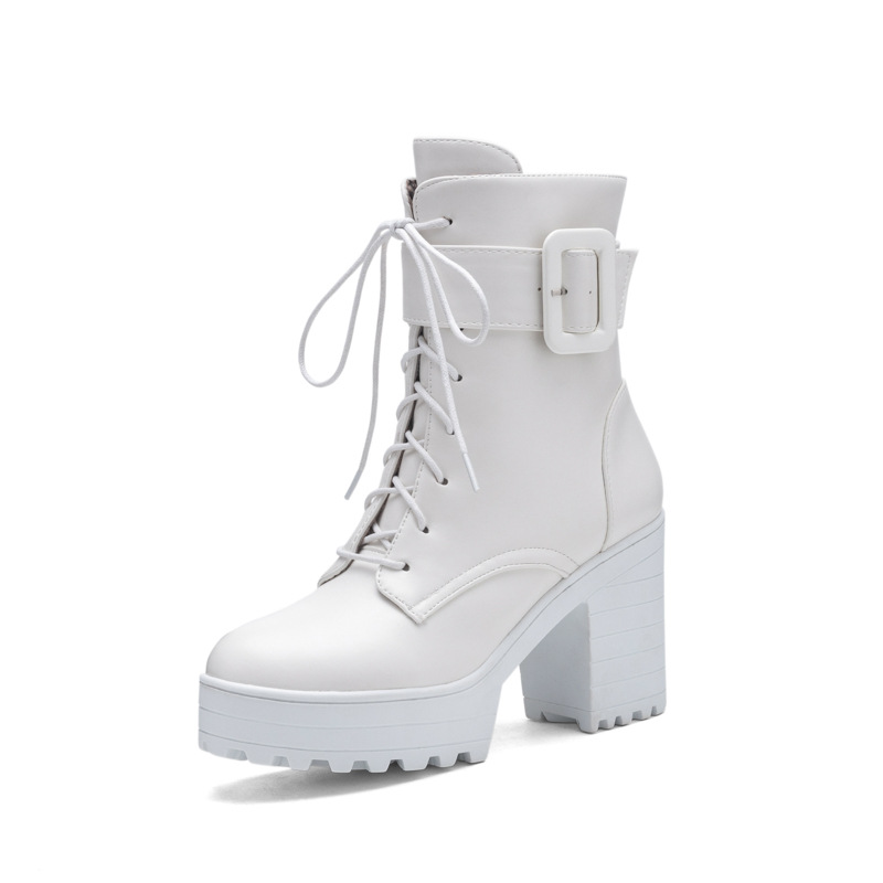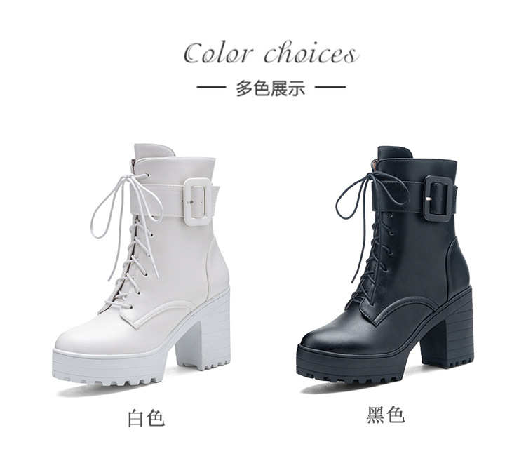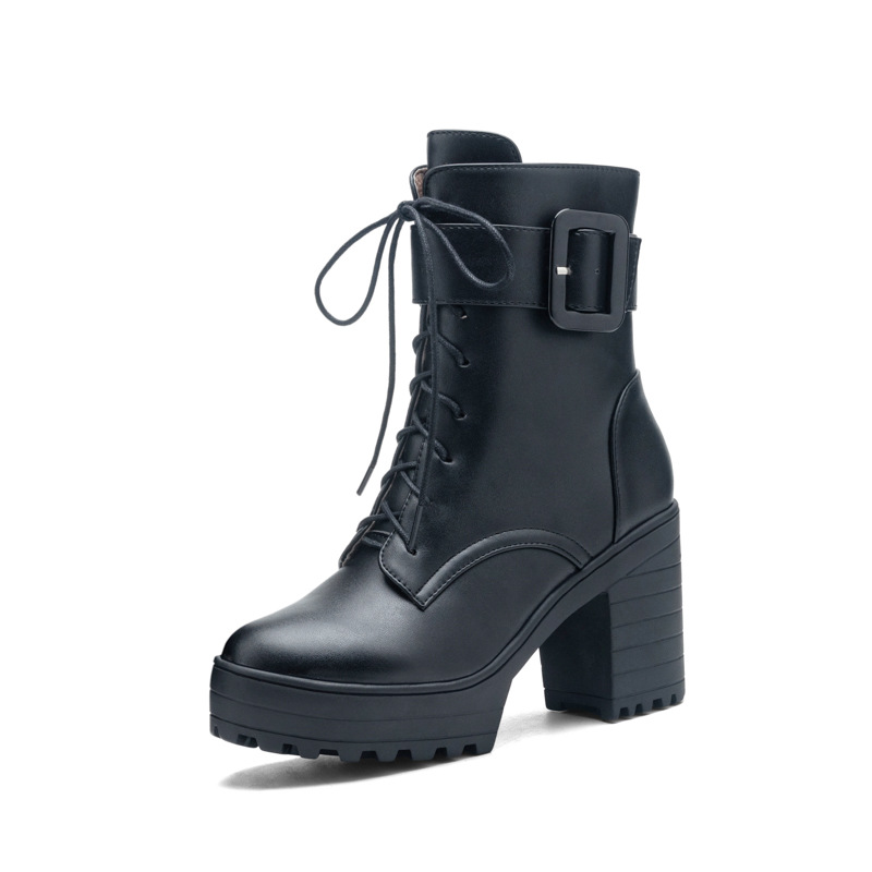 새로운 유럽과 미국의 가을, 겨울 여성 부츠 벨트 버클 레이스 업 짧은 마틴 부츠 플랫폼 두꺼운 하이힐 부츠 40-43 대외 무역 부츠