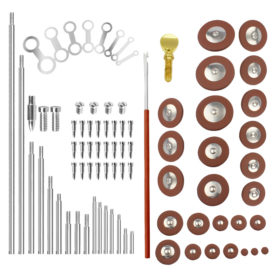 包装清单:螺纹轴杆*16 螺丝*32 锥形轴钉*1 压垫工具*8 颈部螺丝*1 簧针*1 萨克斯皮垫*26
