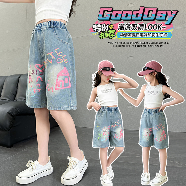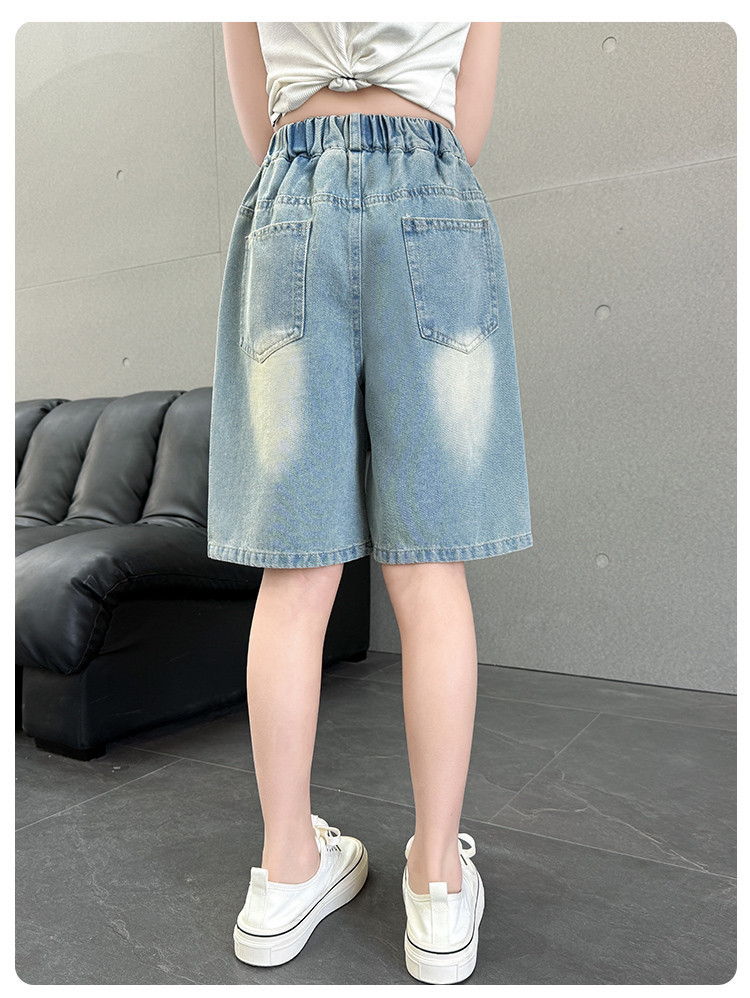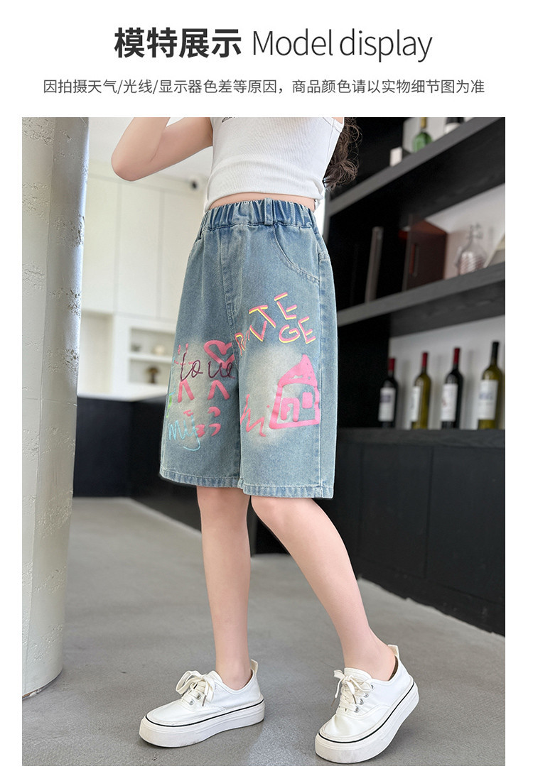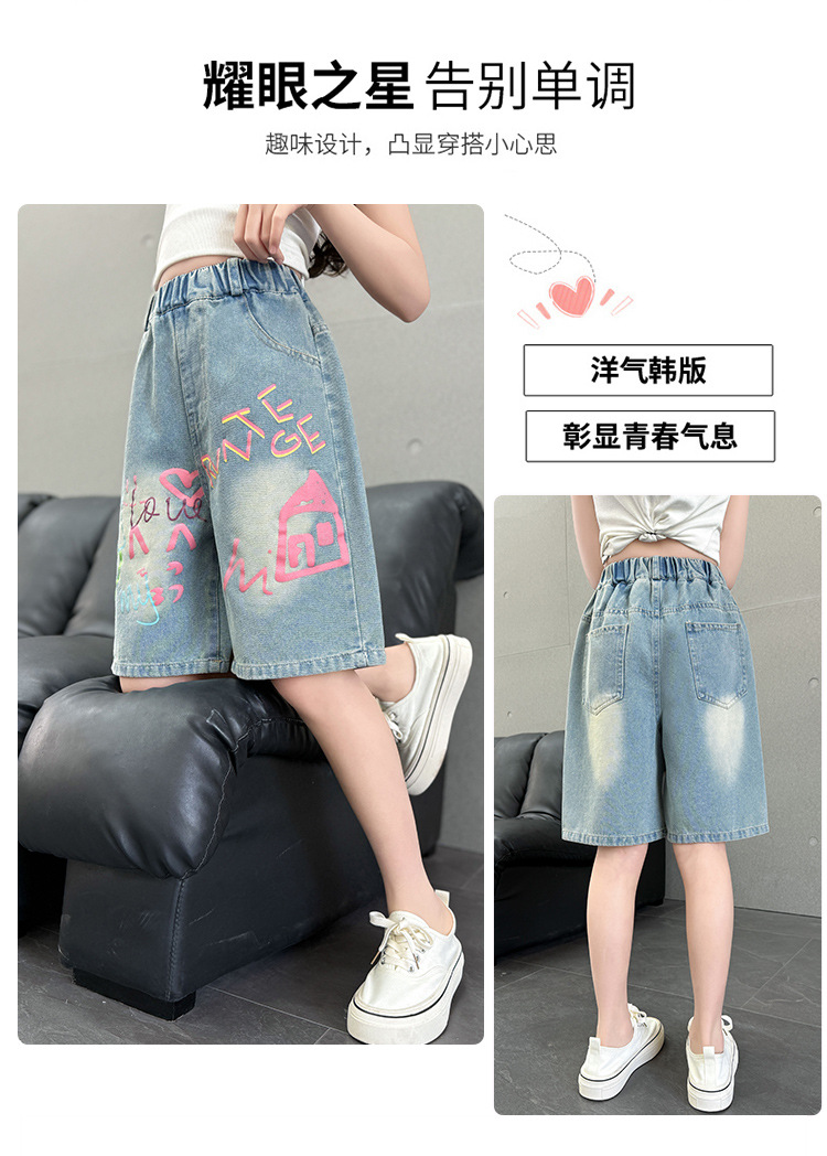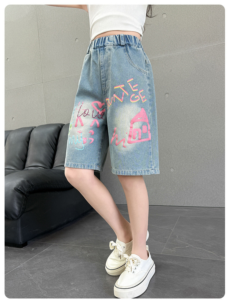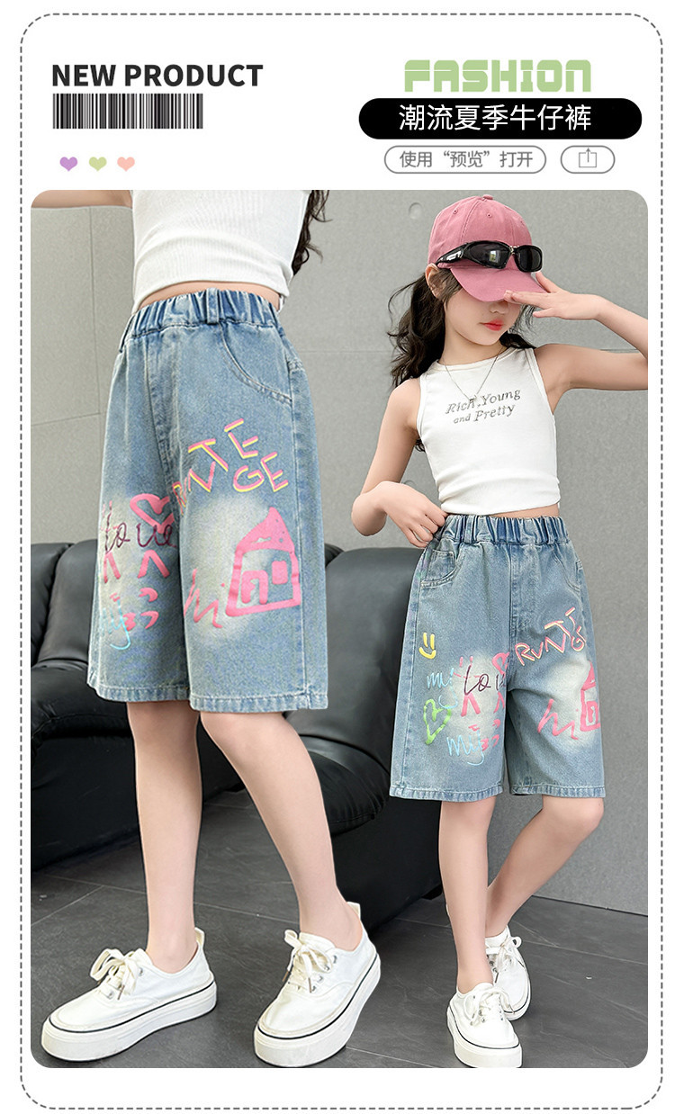 새로운 여름 소녀 중 큰 키즈 만화 패션 서양 스타일 올 매치 데님 반바지 소녀 느슨한 5 점 바지 얇은스토어 가기