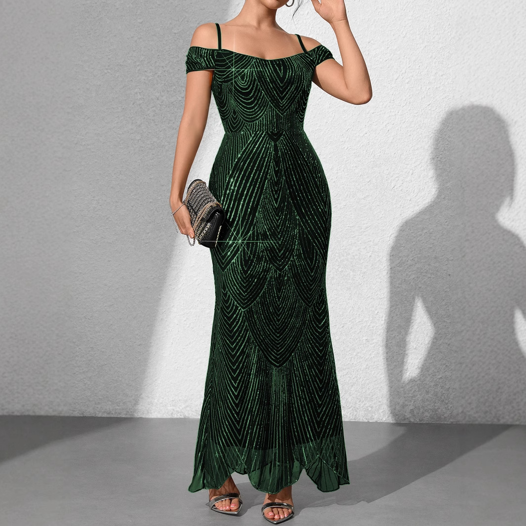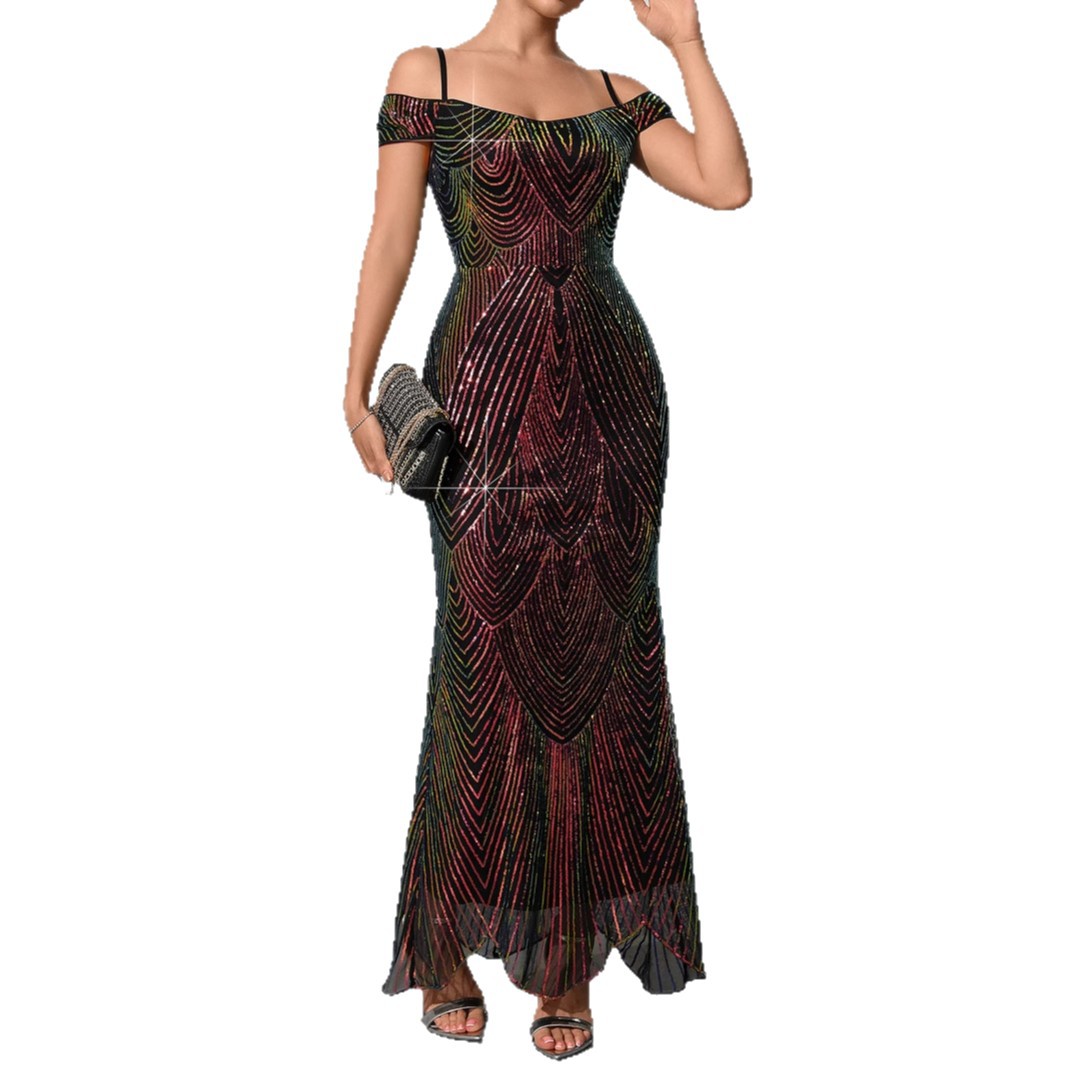 새로운 2025 유럽과 미국 여성의 원라인 칼라 오프 숄더 섹시한 스팽글 드레스 서스펜더 롱 피쉬 테일 스커트 9372