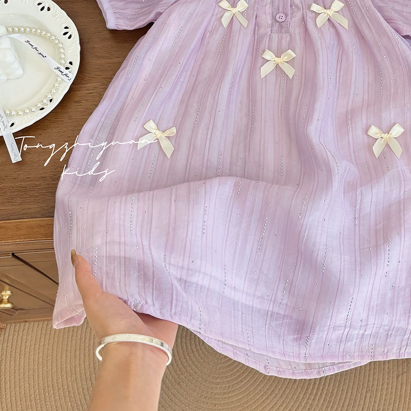 여자 여름 새로운 보라색 고급 반짝이 보우 드레스 아기 소녀 캐주얼 패션 외국 스타일 품질 아동 의류 유행