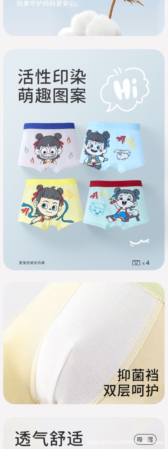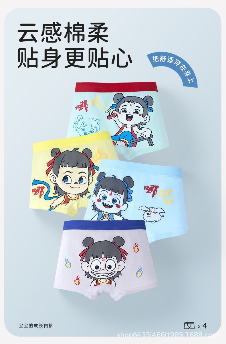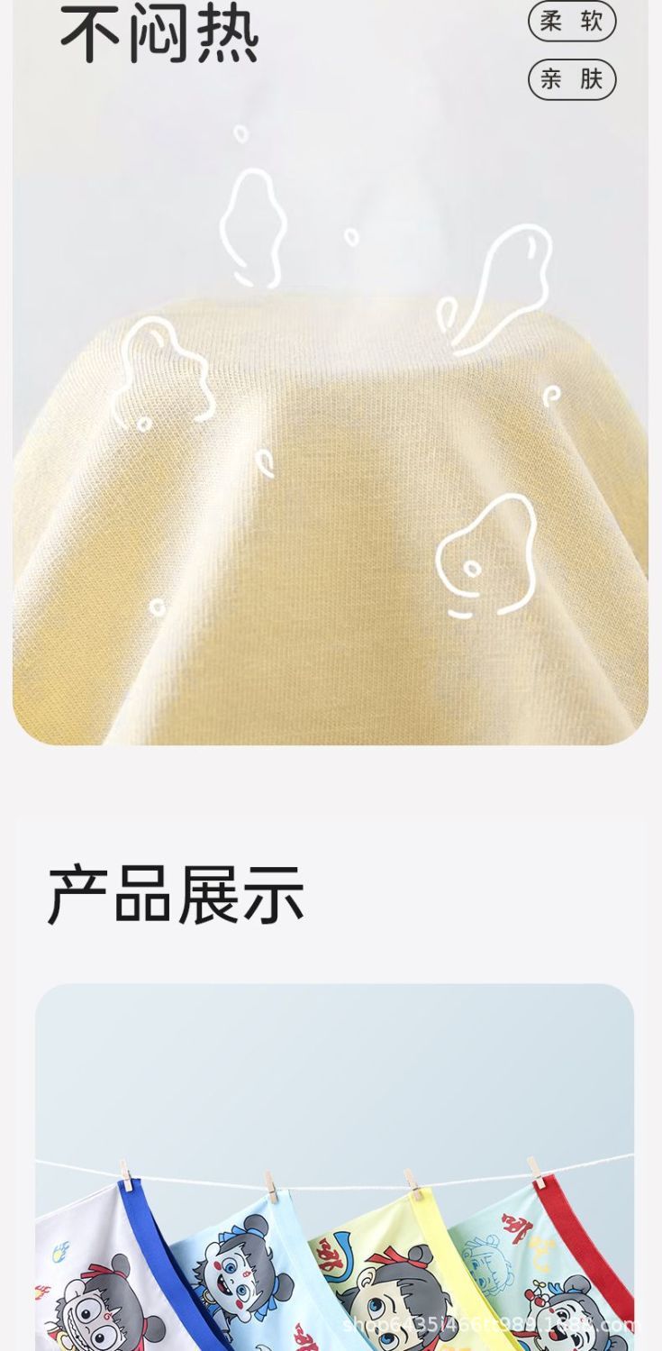 可爱的哪吒卡通图案,萌趣又吸睛。是宝贝喜欢的动画形象,穿上它,仿佛化身小英雄,自信满满。不仅是内裤,更是童年美好陪伴,让宝贝快乐成长每一刻!