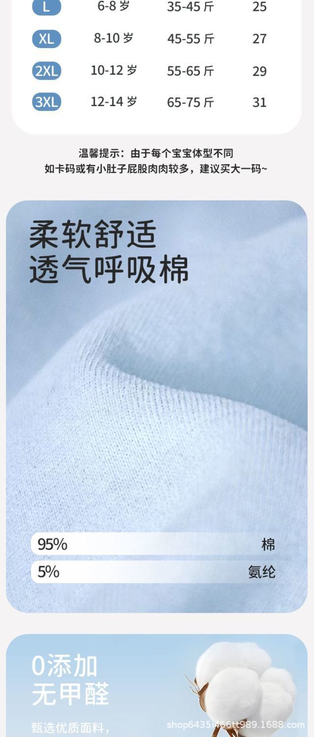 家有宝贝,贴身衣物的选择至关重要!这款儿童内裤,达到A类标准,安全无虞,甲醛、pH值等指标严格管控,给孩子娇嫩肌肤最温柔的呵护。