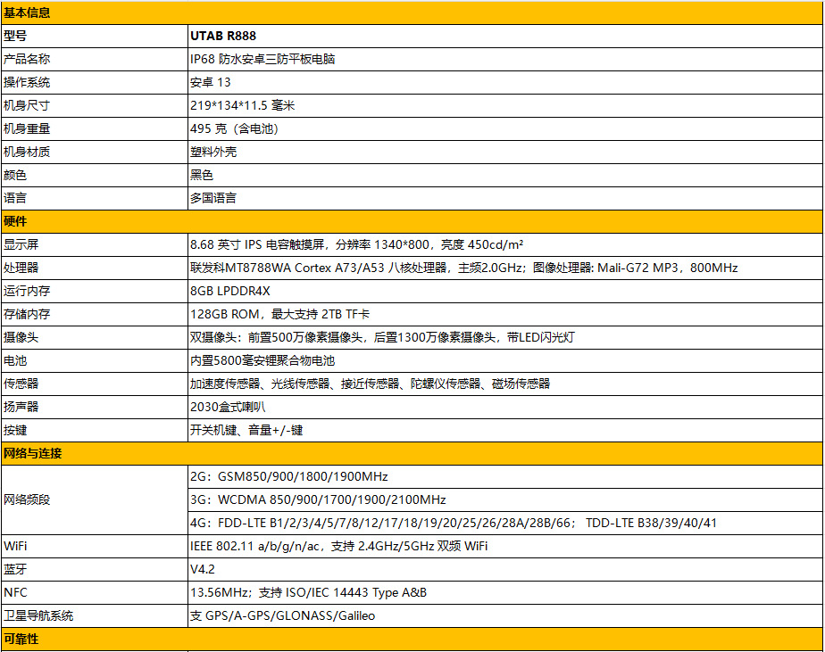 UTAB R888 8英寸便携式8GB RAM 128GB ROM 4G NFC GPS智能安卓坚固平板电脑