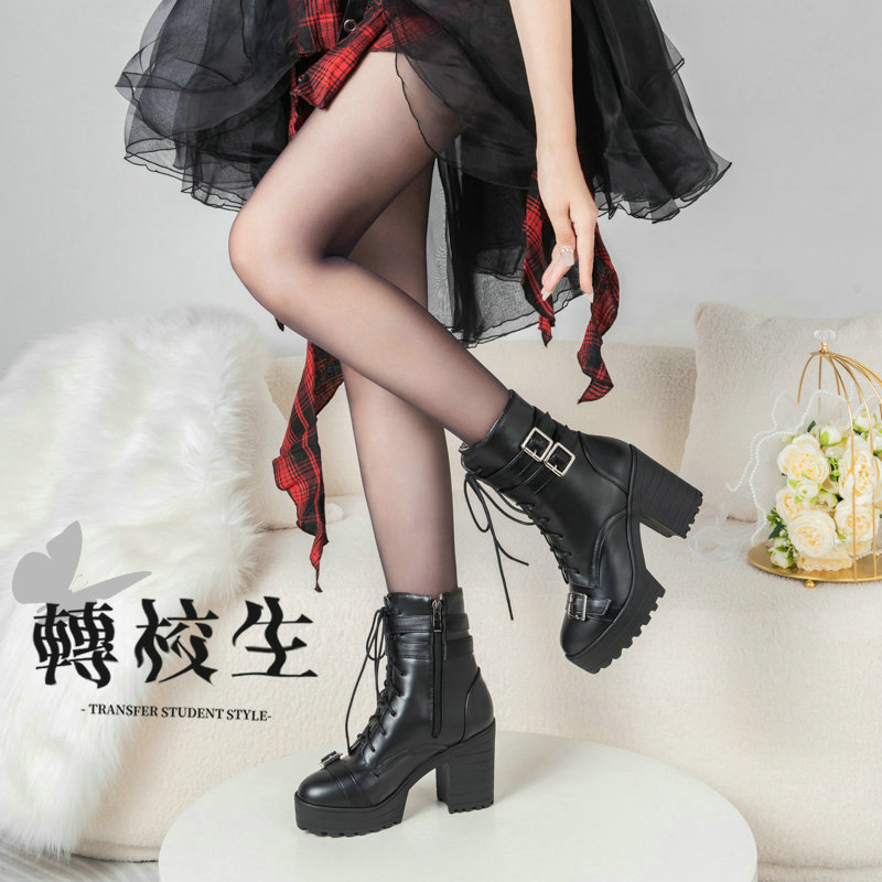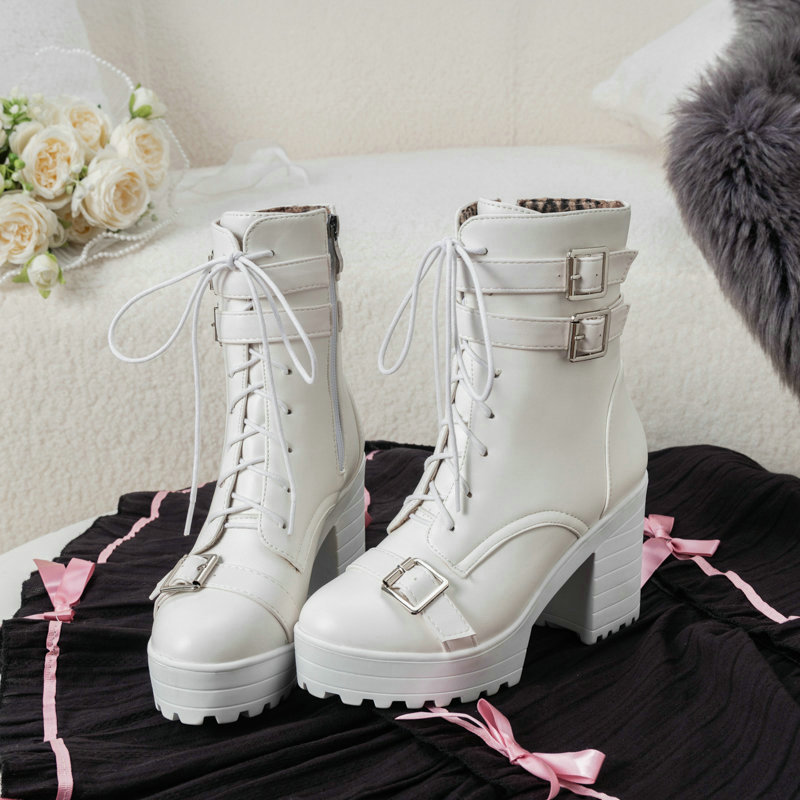 마틴 부츠 여성 가을 겨울 라운드 발가락 두꺼운 밑창 두꺼운 굽 슈퍼 하이힐 벨트 버클 앞 레이스 업 앵클 부츠 패션 짧은 부츠스토어 가기