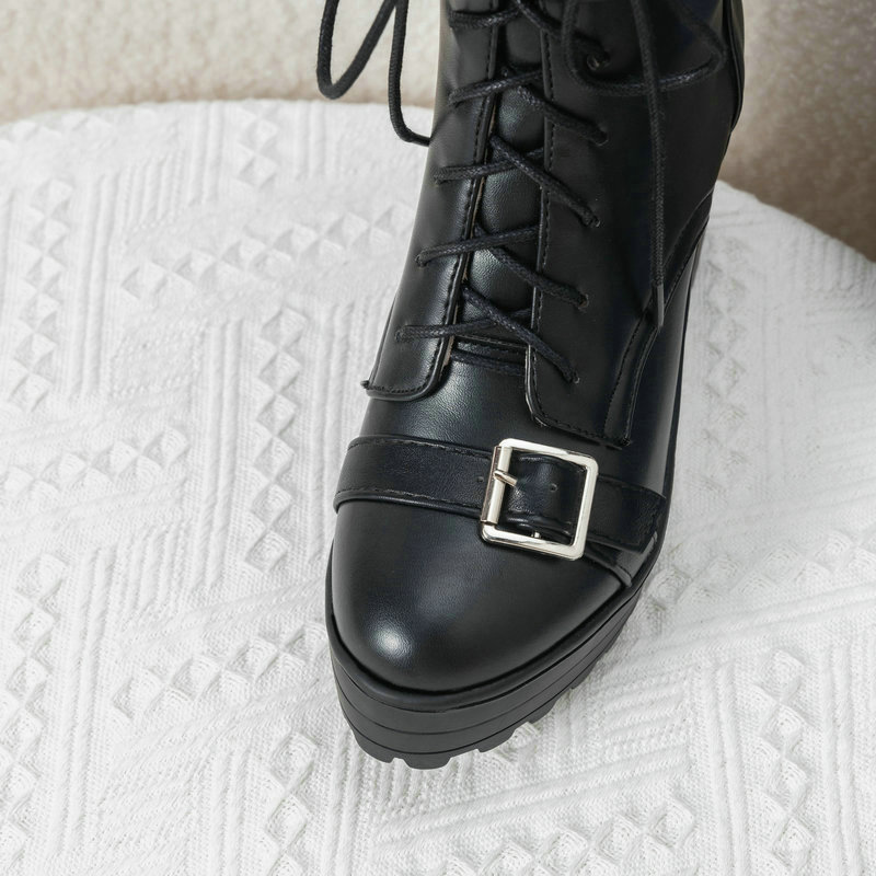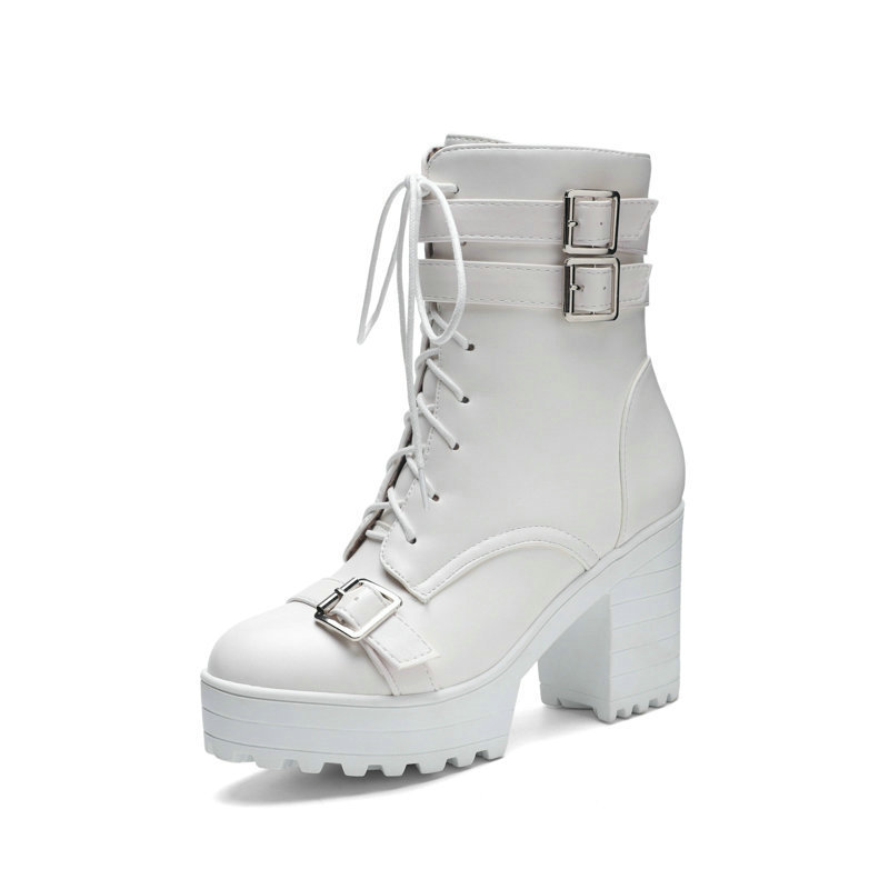 마틴 부츠 여성 가을 겨울 라운드 발가락 두꺼운 밑창 두꺼운 굽 슈퍼 하이힐 벨트 버클 앞 레이스 업 앵클 부츠 패션 짧은 부츠