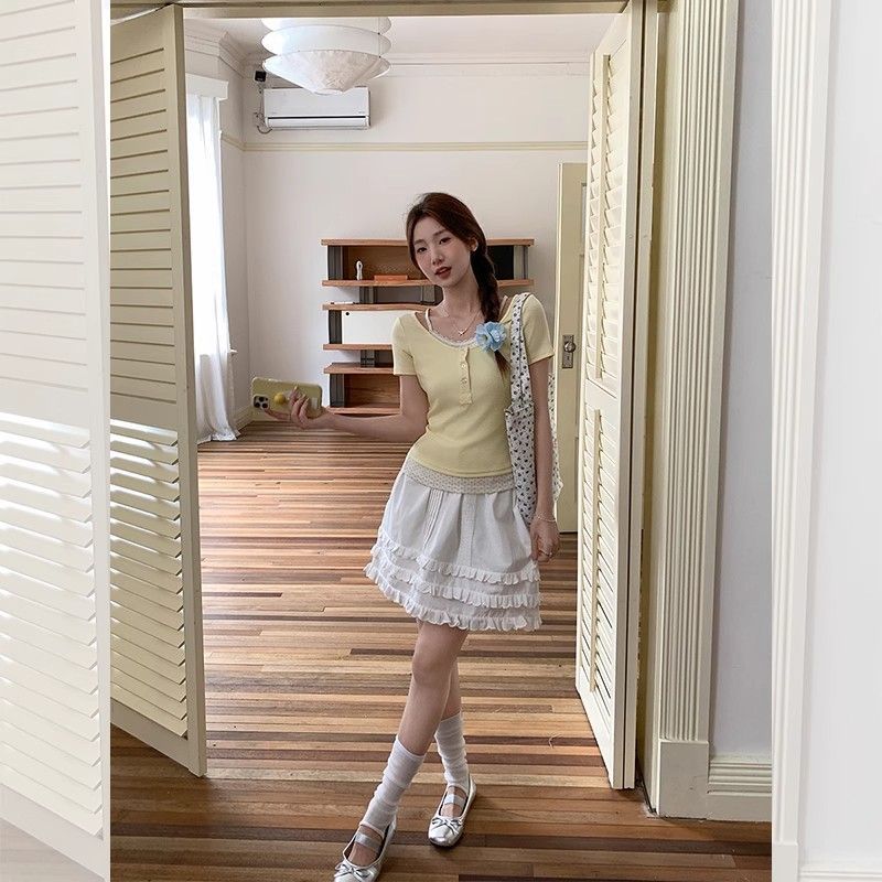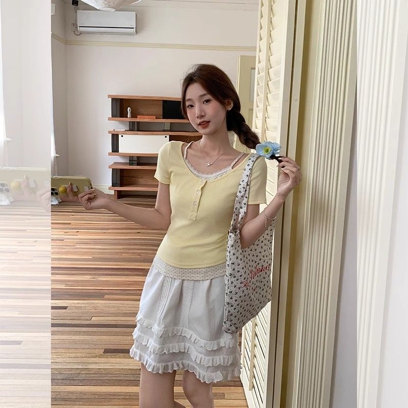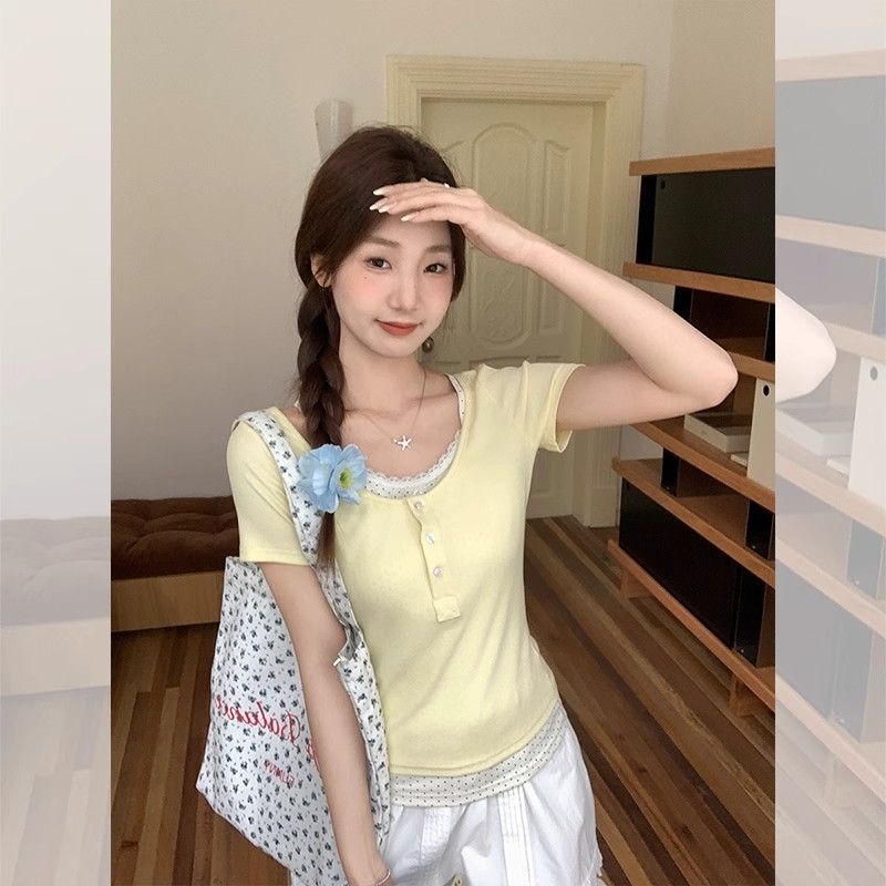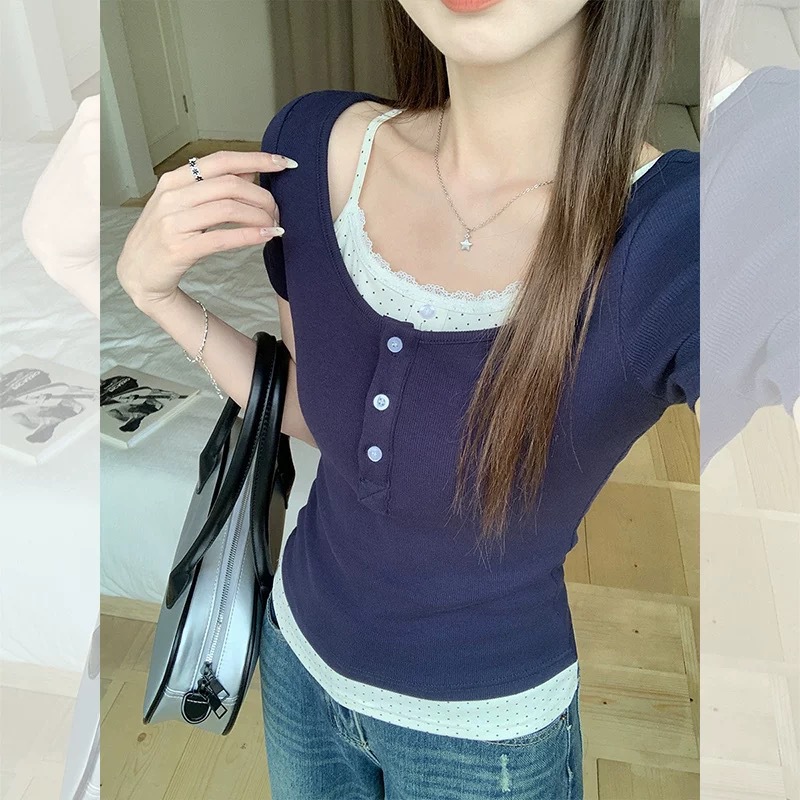 레이스 폴카 도트 가짜 투피스 반팔 티셔츠 여성 여름 슬리밍 독특한 작은 탑