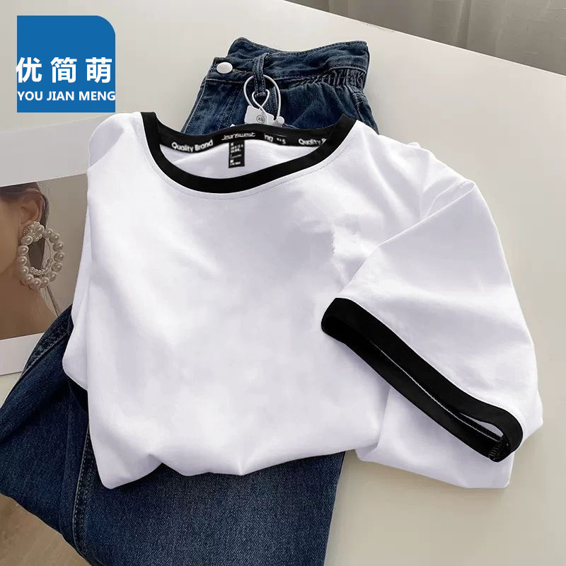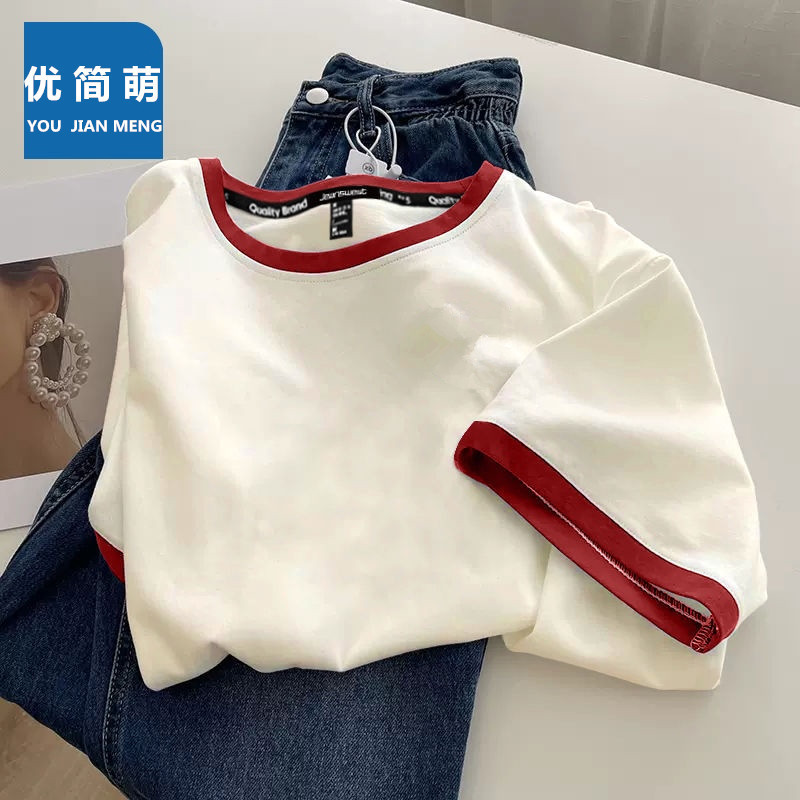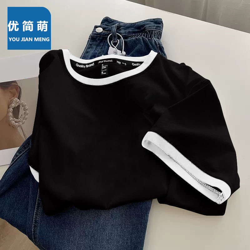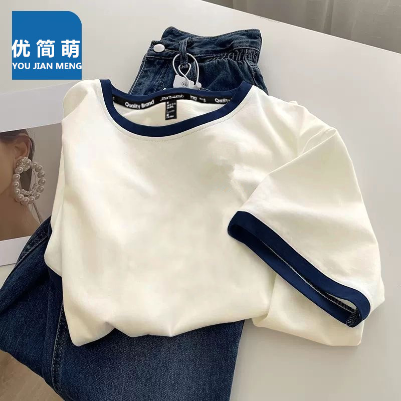 여성용 면 반팔 셔츠 2025 뉴 여름 아메리칸 레트로 티셔츠 대비 색상 스플 라이스 라운드 넥 슬림 탑 셔츠스토어 가기
