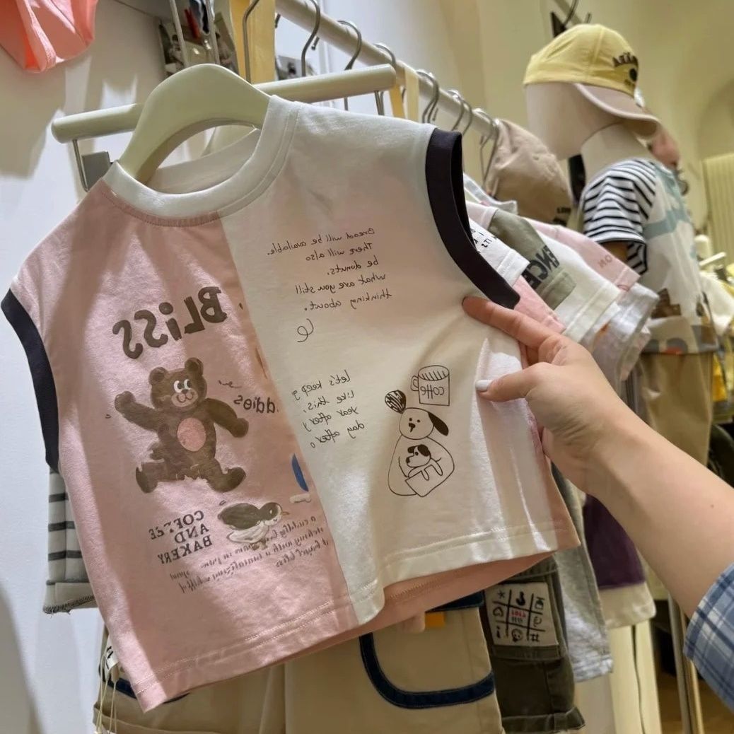 어린이 스플 라이스 민소매 티셔츠 여름 새 스타일 코튼 소년과 소녀 귀여운 라운드 넥 탑 얇은 짧은 T 조끼 바닥스토어 가기