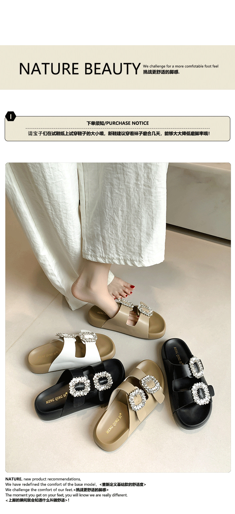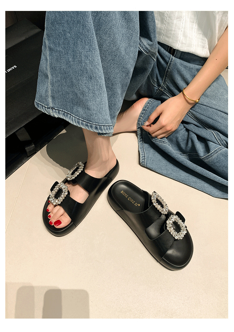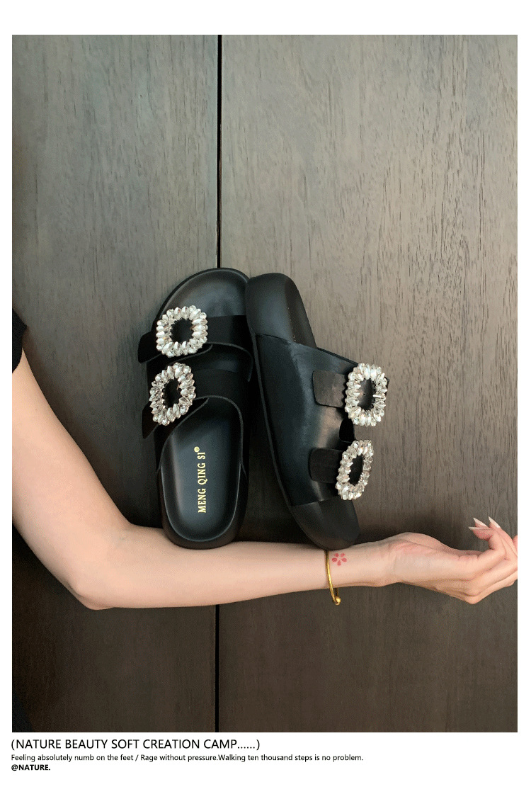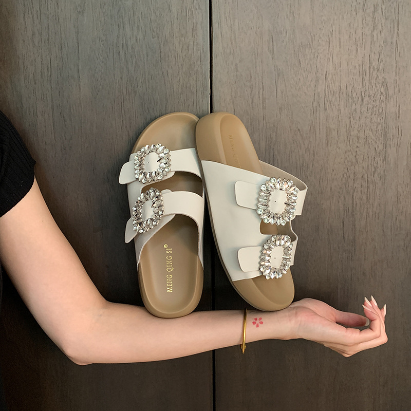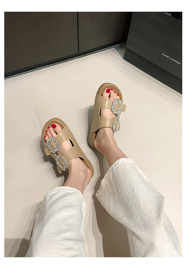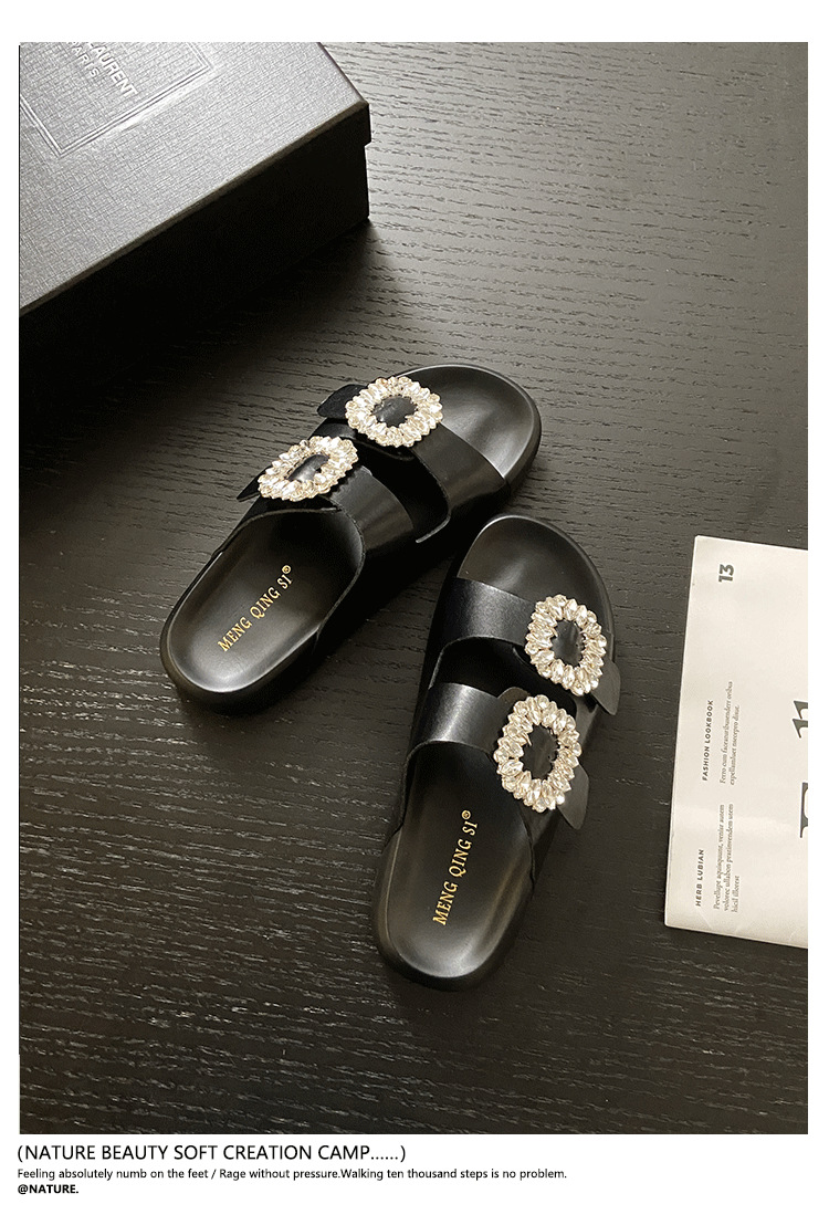 여름 아우터로 입기 좋은 여성용 사각 버클 라인스톤 천연가죽 더블 스트랩 작은 사이즈 32 하프 슬리퍼