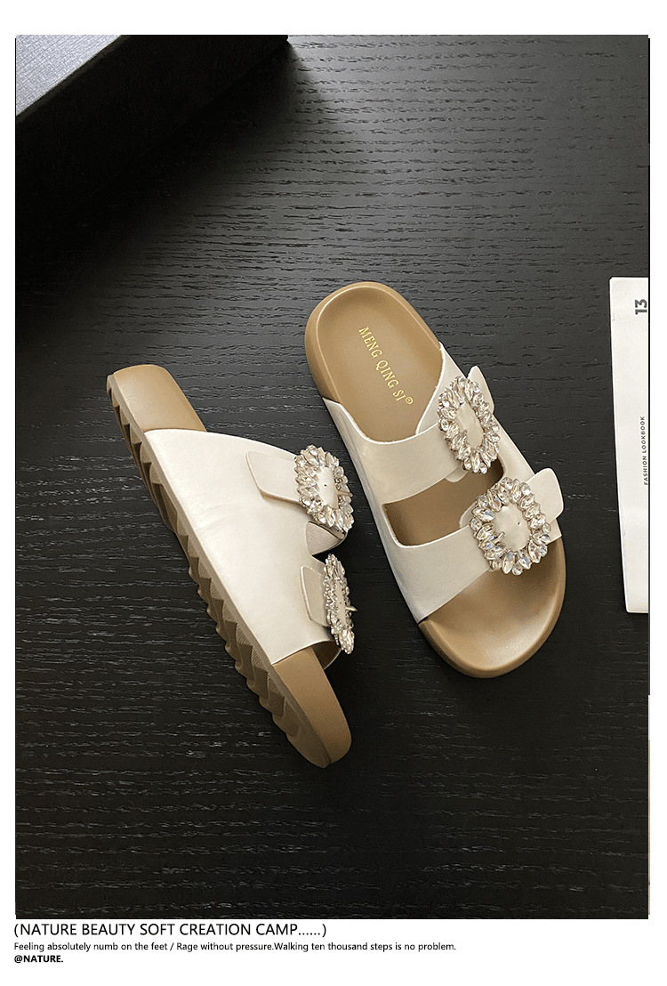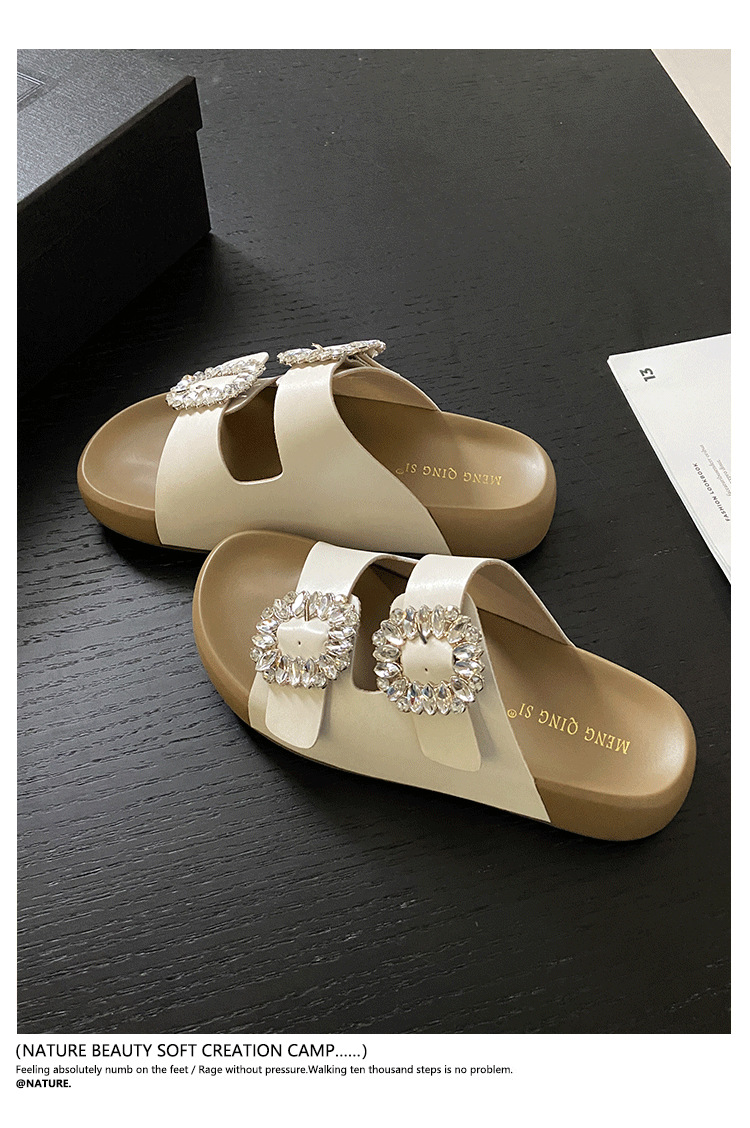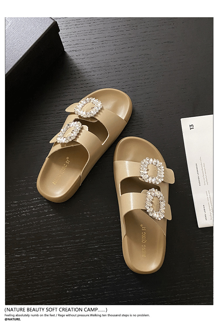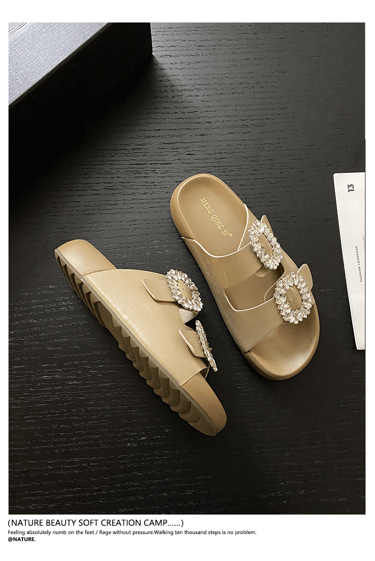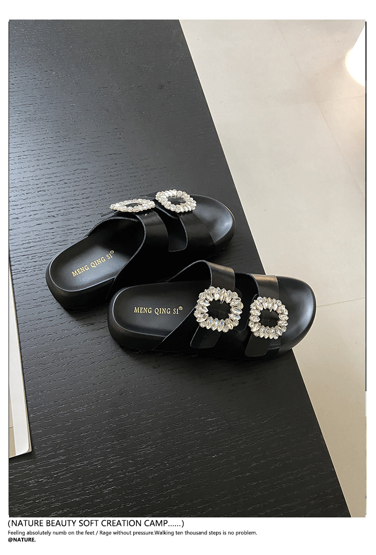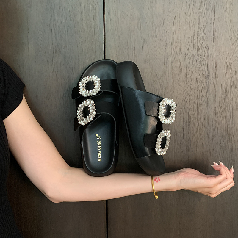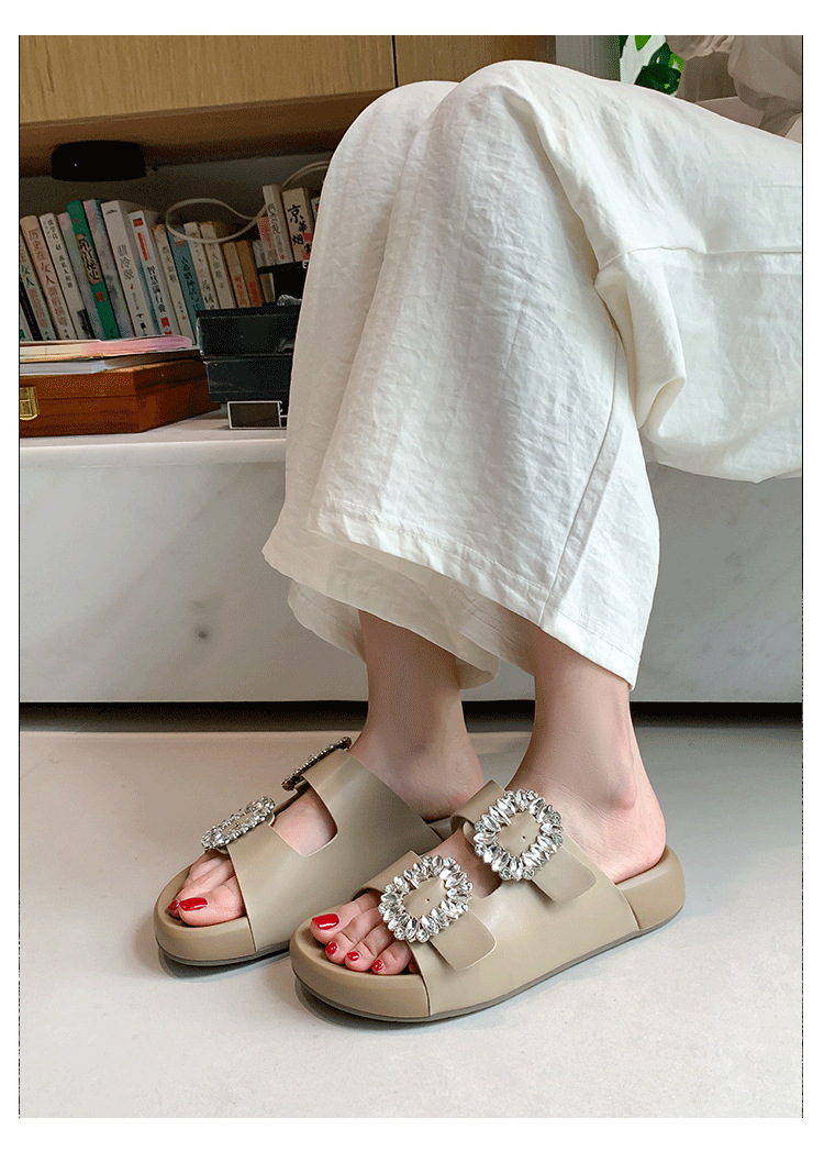 여름 아우터로 입기 좋은 여성용 사각 버클 라인스톤 천연가죽 더블 스트랩 작은 사이즈 32 하프 슬리퍼