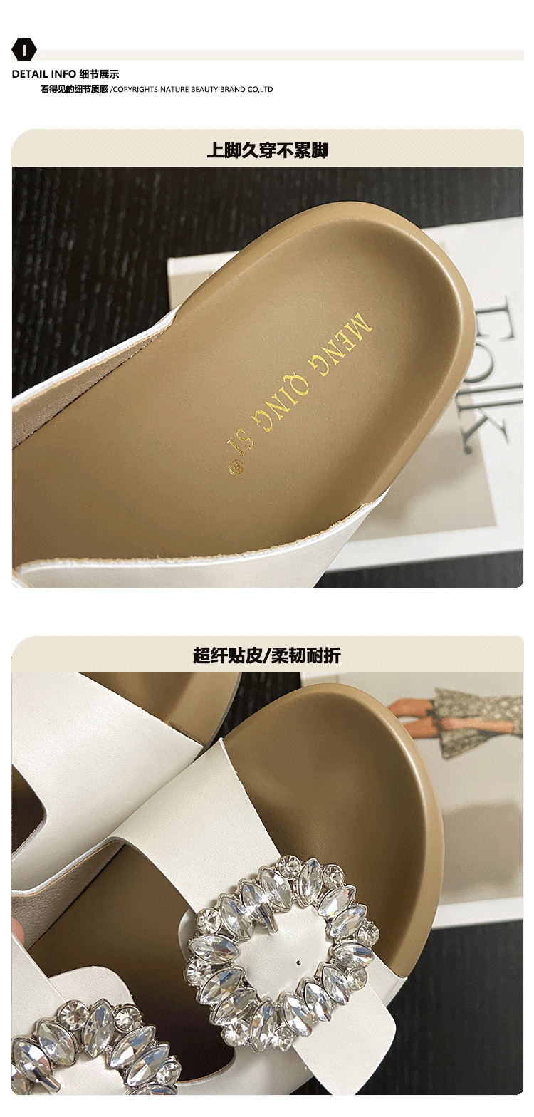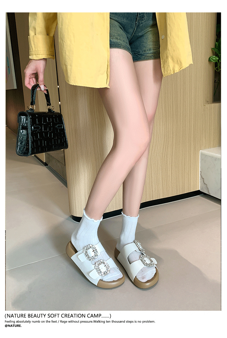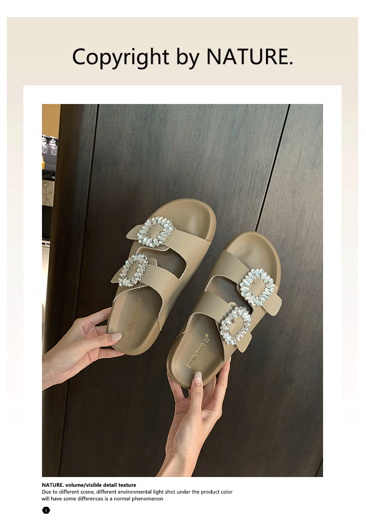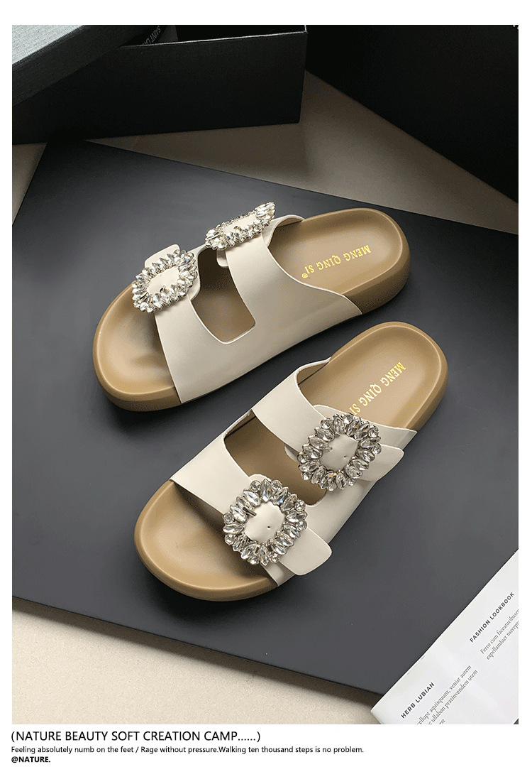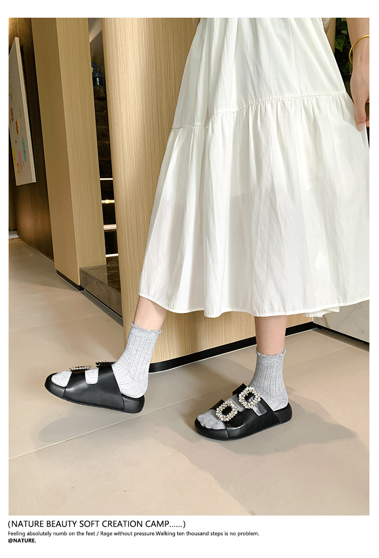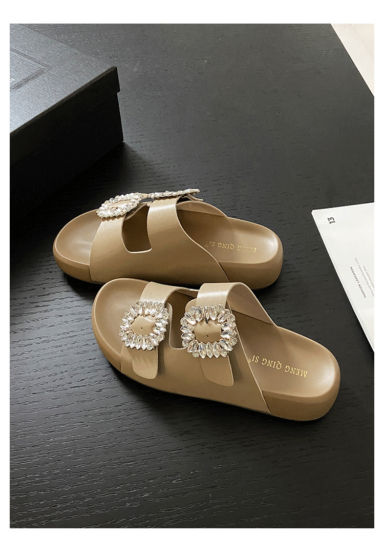 여름 아우터로 입기 좋은 여성용 사각 버클 라인스톤 천연가죽 더블 스트랩 작은 사이즈 32 하프 슬리퍼