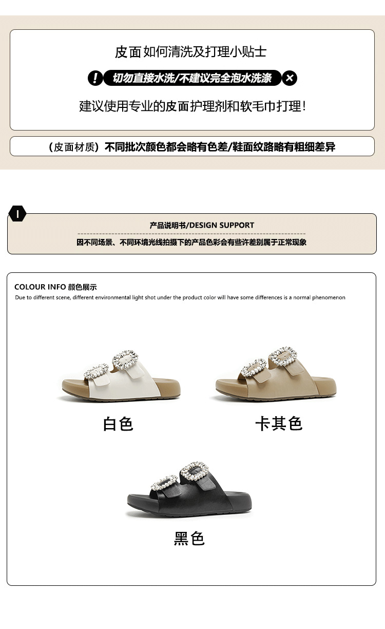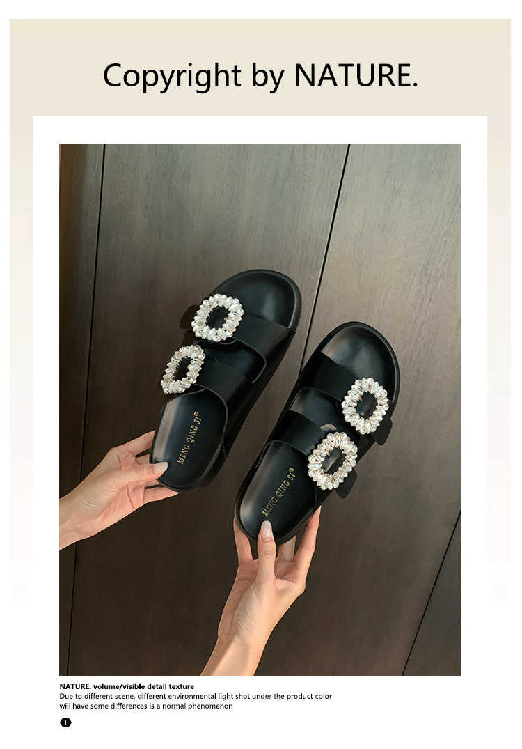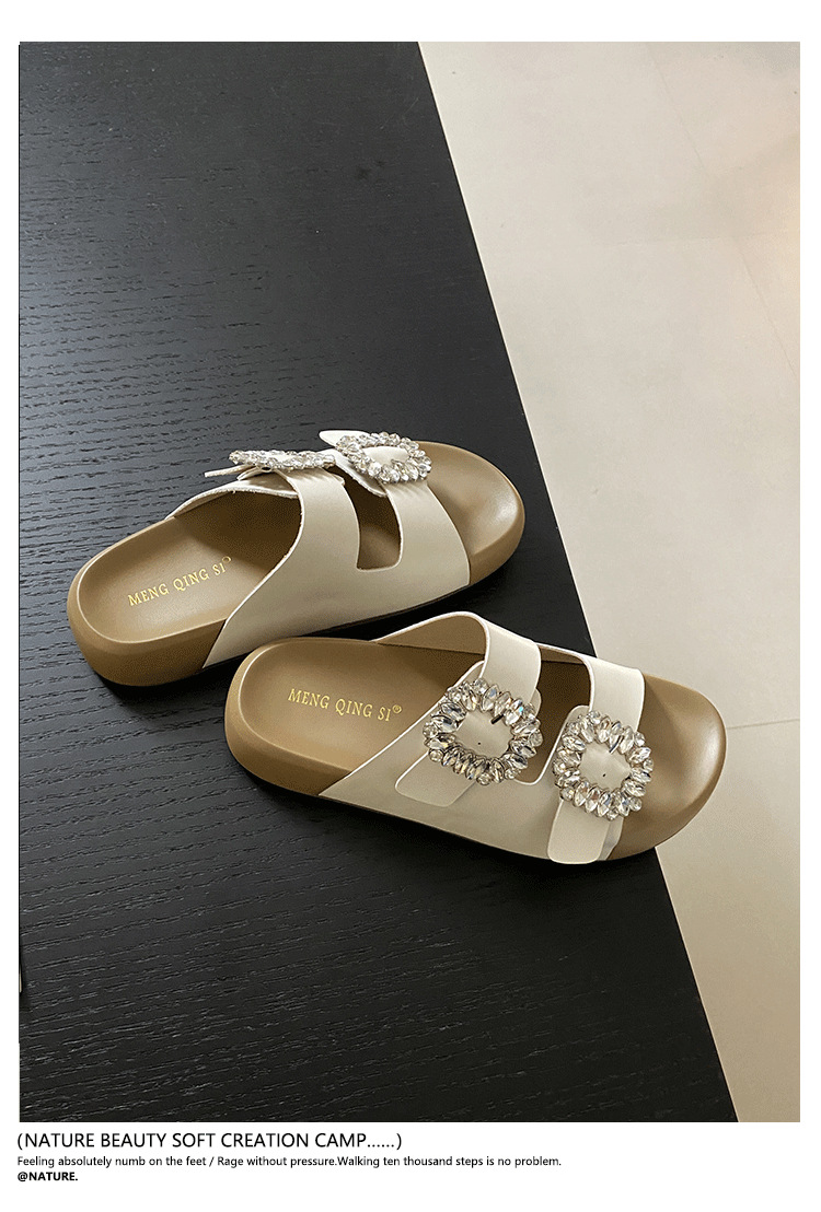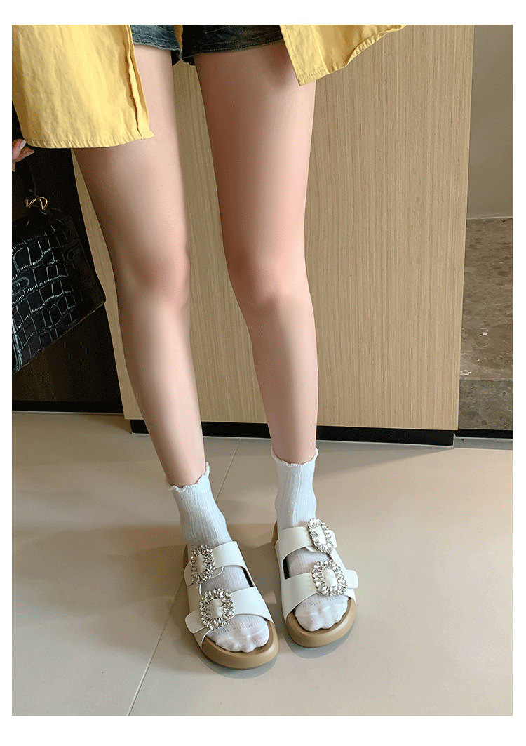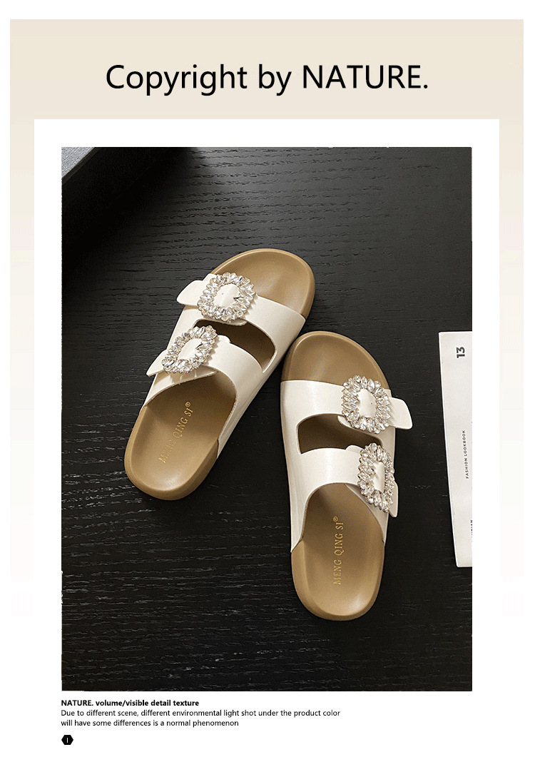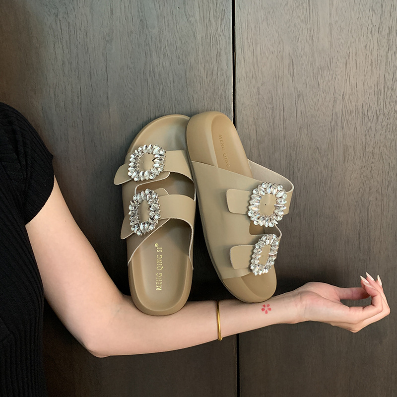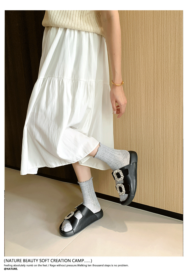 여름 아우터로 입기 좋은 여성용 사각 버클 라인스톤 천연가죽 더블 스트랩 작은 사이즈 32 하프 슬리퍼