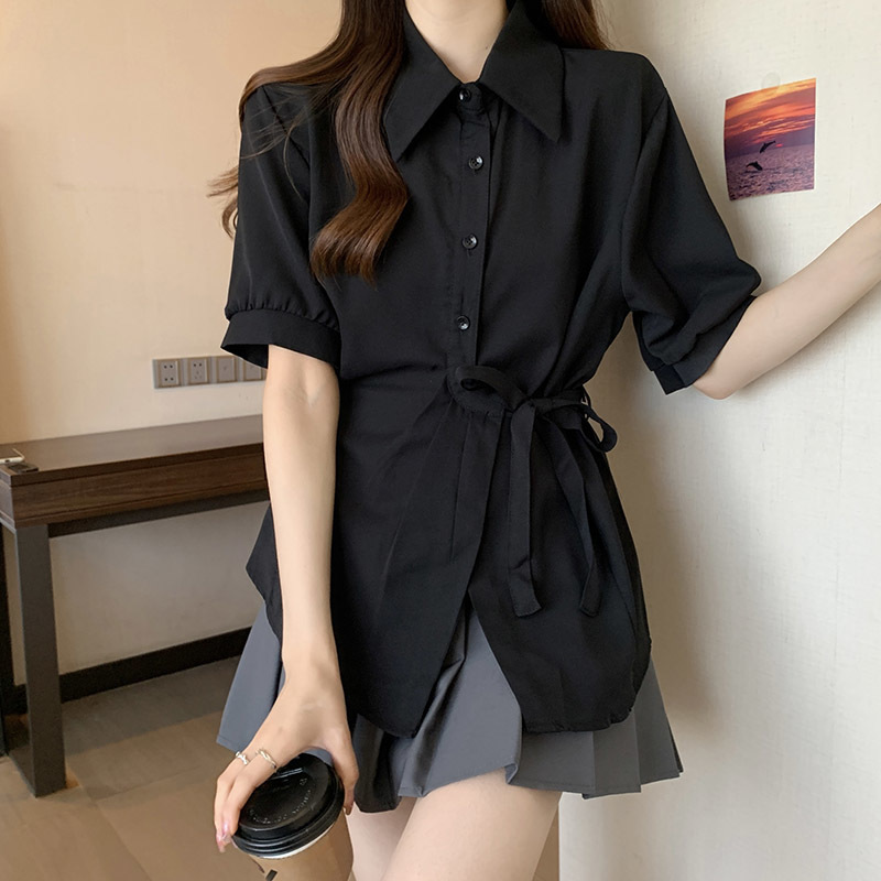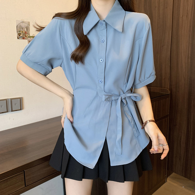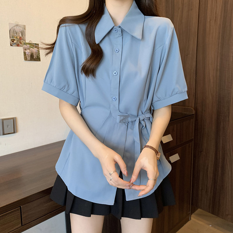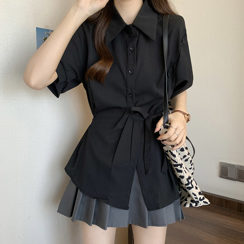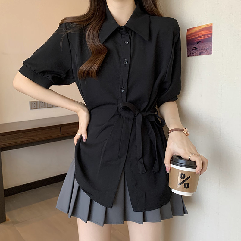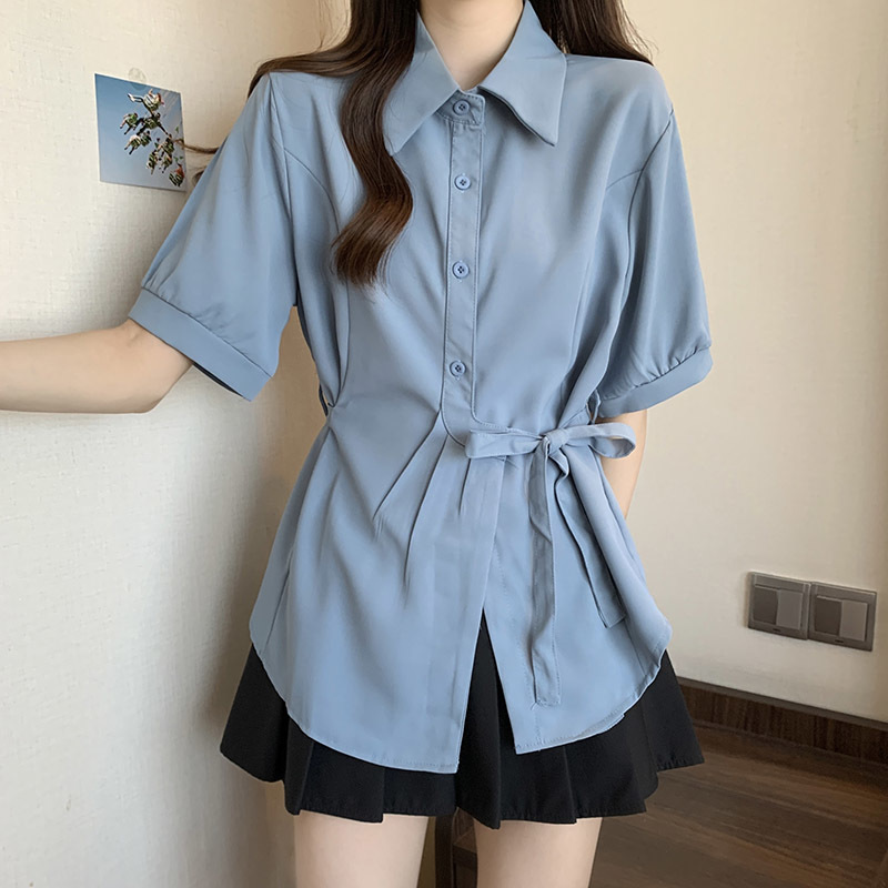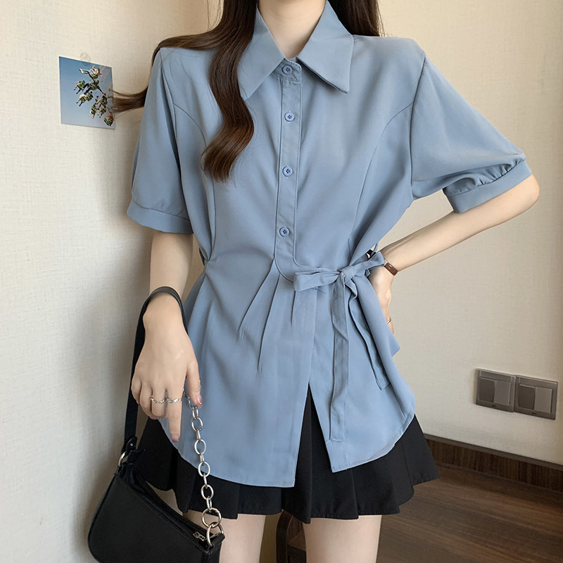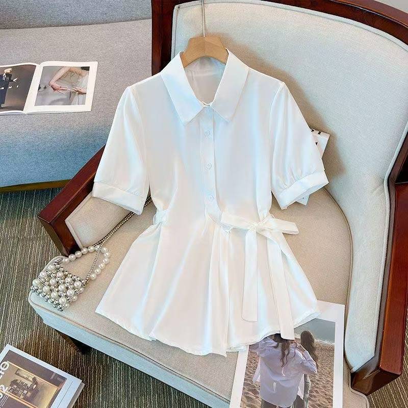 여름 프렌치 미드기장 허리 쉬폰 반팔 셔츠, 뚱뚱하고 날씬해 보이는 배를 커버해주는 반팔 탑
