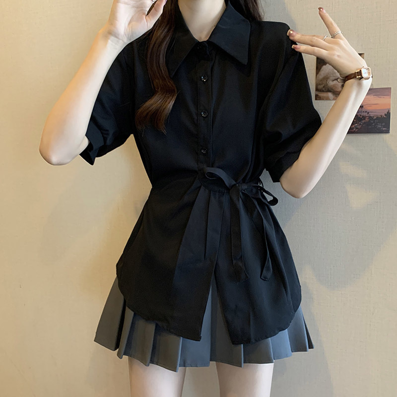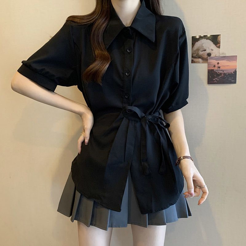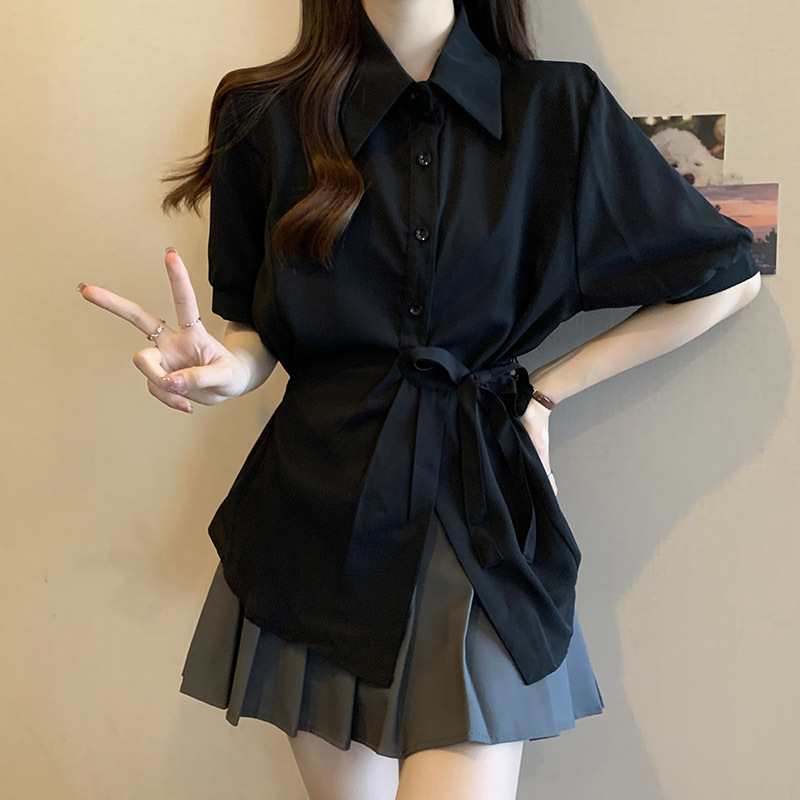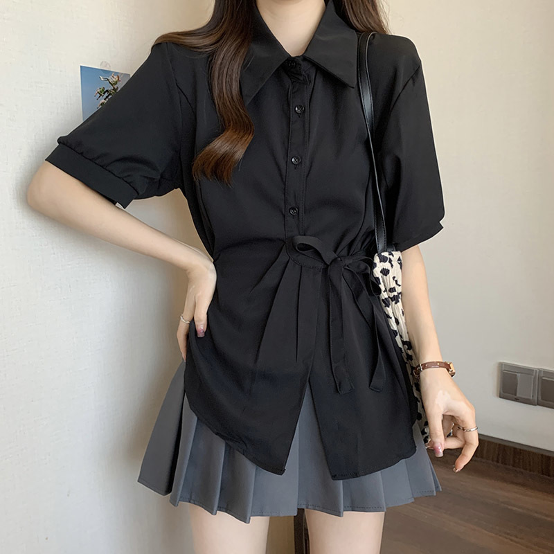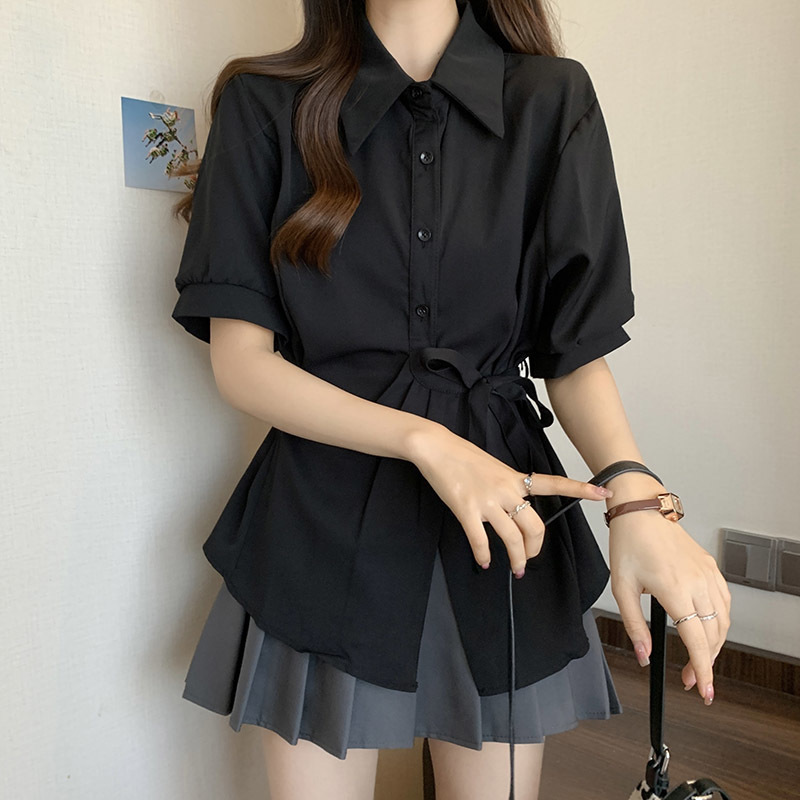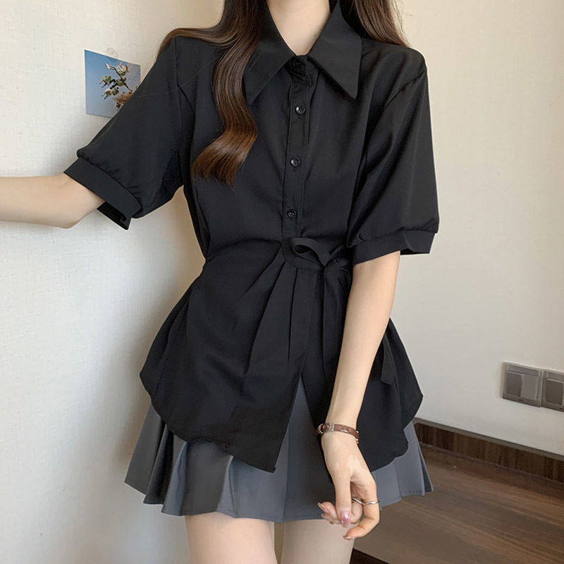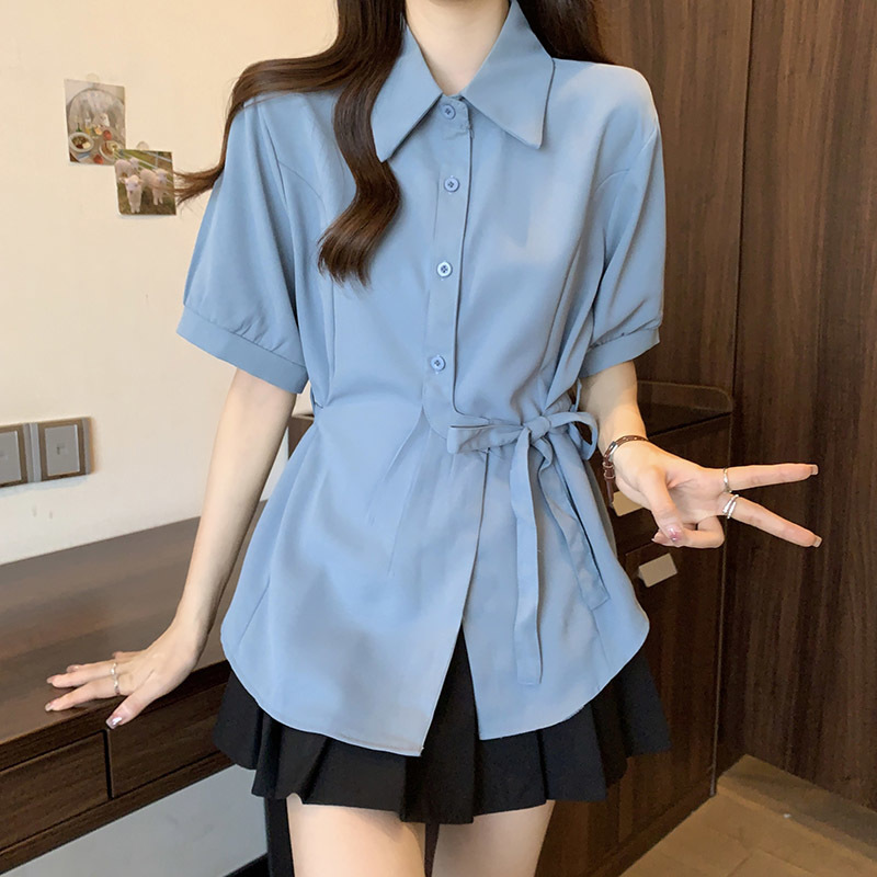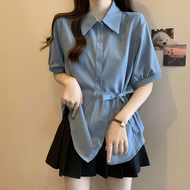 여름 프렌치 미드기장 허리 쉬폰 반팔 셔츠, 뚱뚱하고 날씬해 보이는 배를 커버해주는 반팔 탑