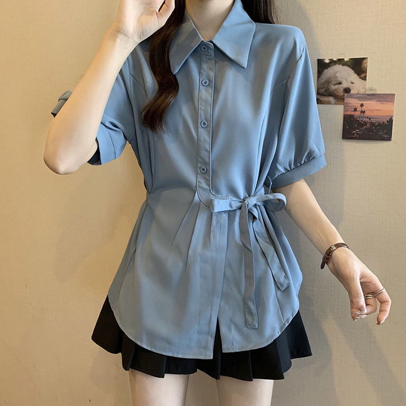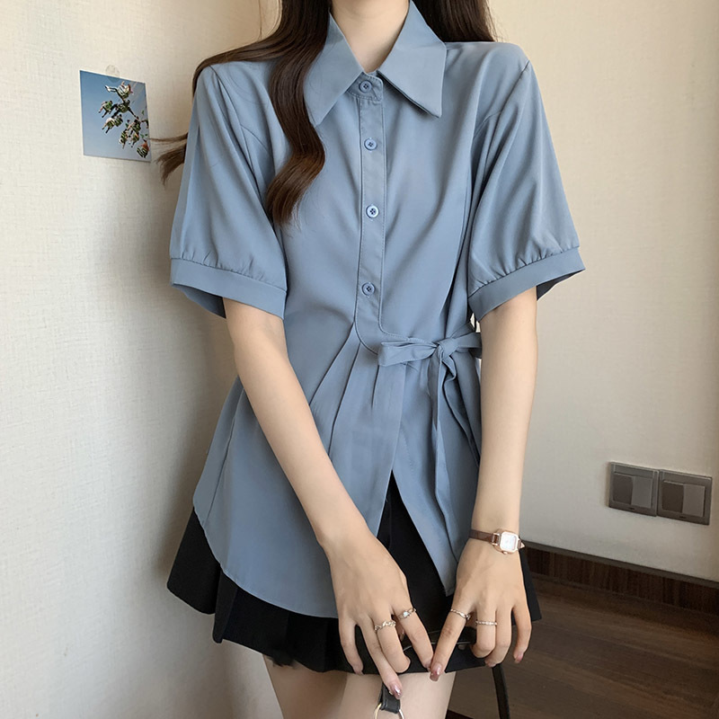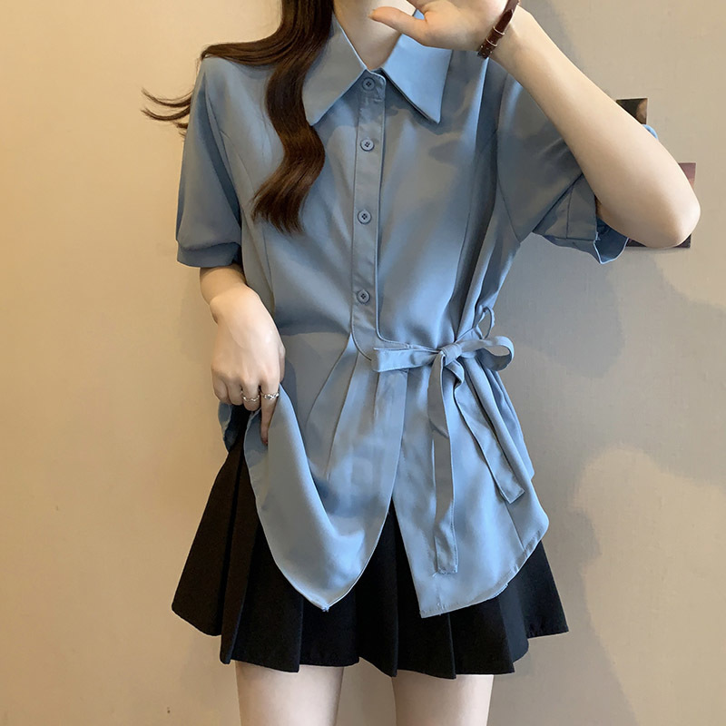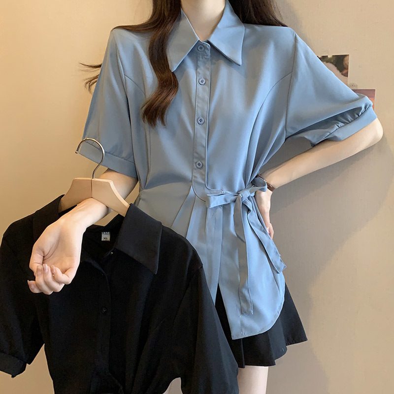 여름 프렌치 미드기장 허리 쉬폰 반팔 셔츠, 뚱뚱하고 날씬해 보이는 배를 커버해주는 반팔 탑스토어 가기