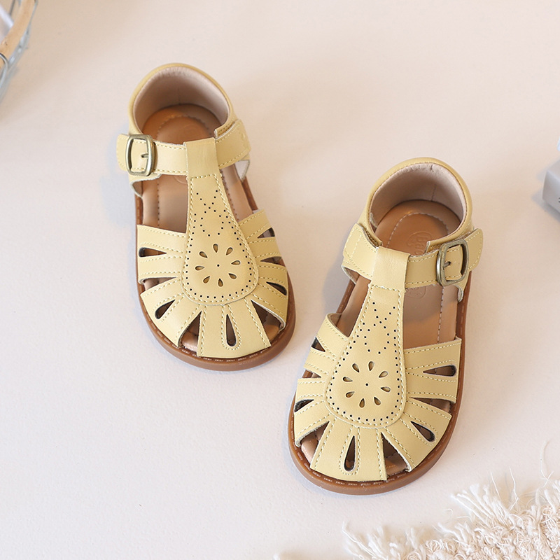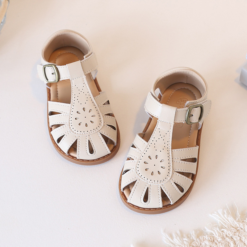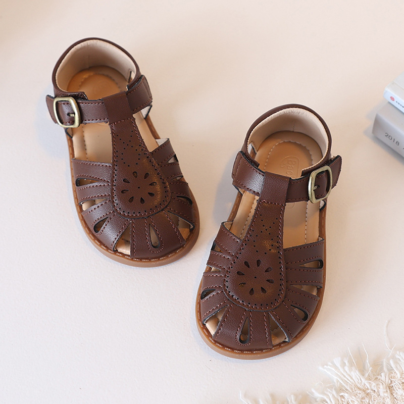 국경 간 정품 가죽 한국 어린이 샌들 여름 로리타 부드러운 바닥 아기 신발 중공 통기성 소녀 비치 샌들
