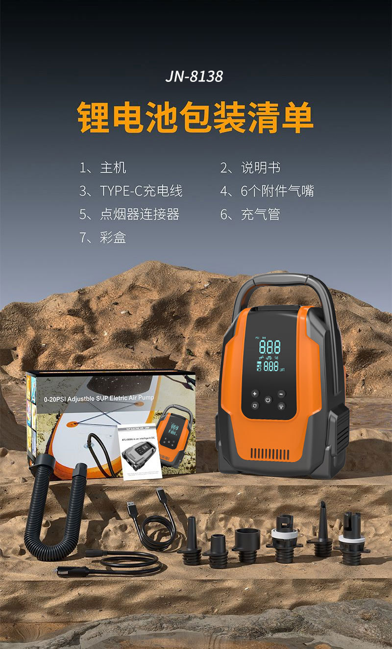 产品参数:型号:8138,名称:SUP划桨板充气泵,电线长度:3m,电流:11A,电压:12V,功率:130W,划桨板默认压力:15PSI,0-12PSI充气时间约8分钟,0-15PSI充气时间约10分钟,轮胎充气时间:205R17寸轮胎充气时间0-36psi时间约2分30秒。操作模式3种:划桨板模式、汽车模式、抽气模式(倒计时150秒),操作单位2种:PSI、Bar(默认PSI)。操作按键:5个按键,➕压按键、➖压按键,开关机按键,切换模式按键,切换单位按键。