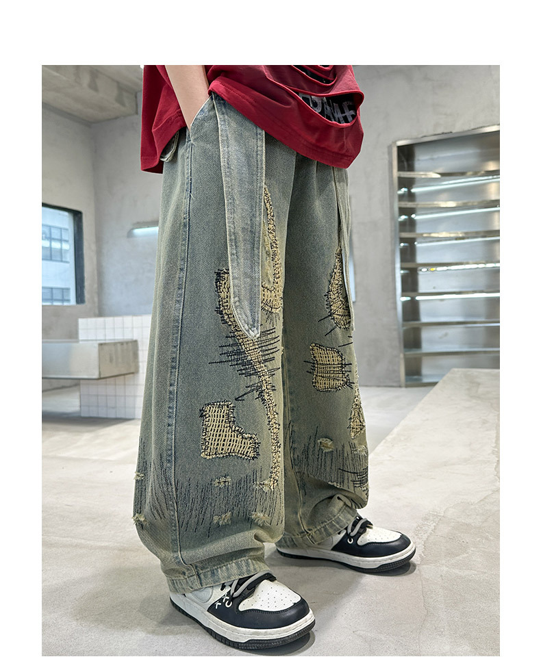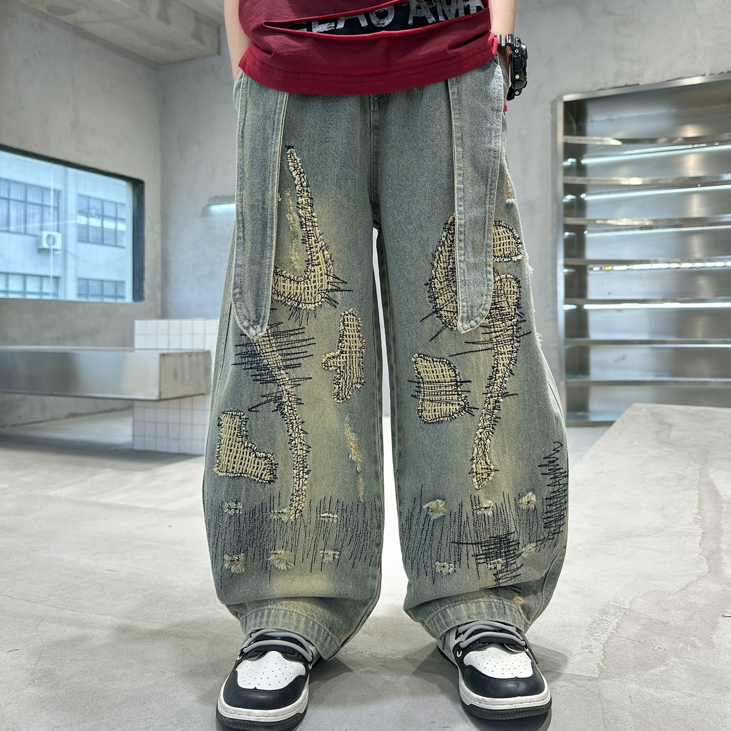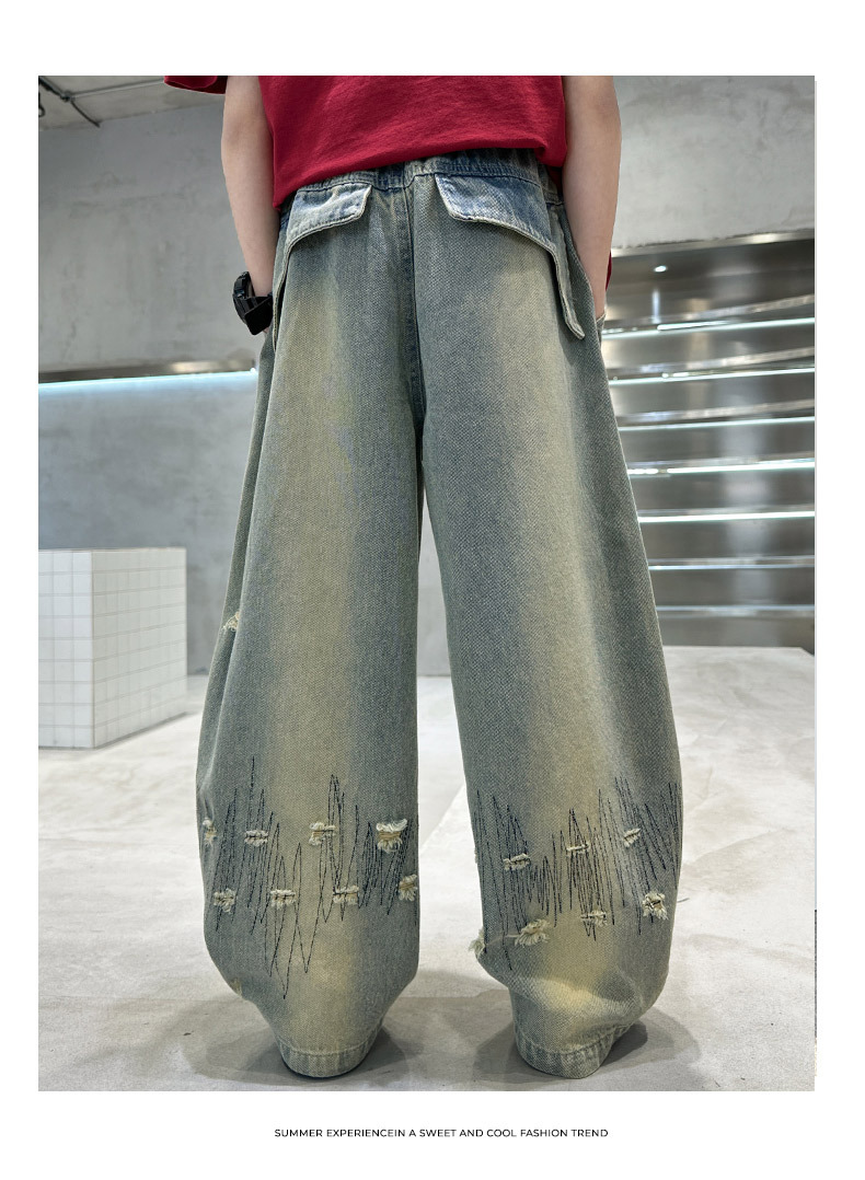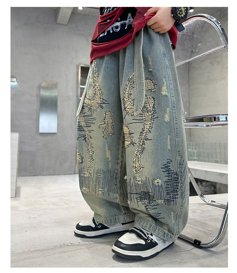남아용 자수 데님 팬츠, 사계절용 아동용 웨이브 팬츠, 중대형 아동용, 멋스럽고 패셔너블하며 부드럽고 가볍고 답답하지 않음