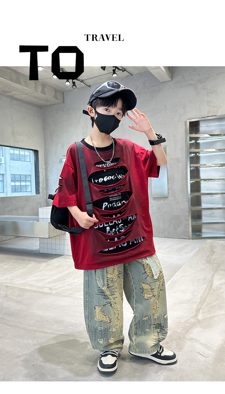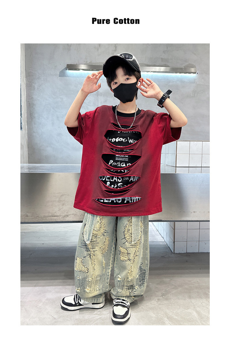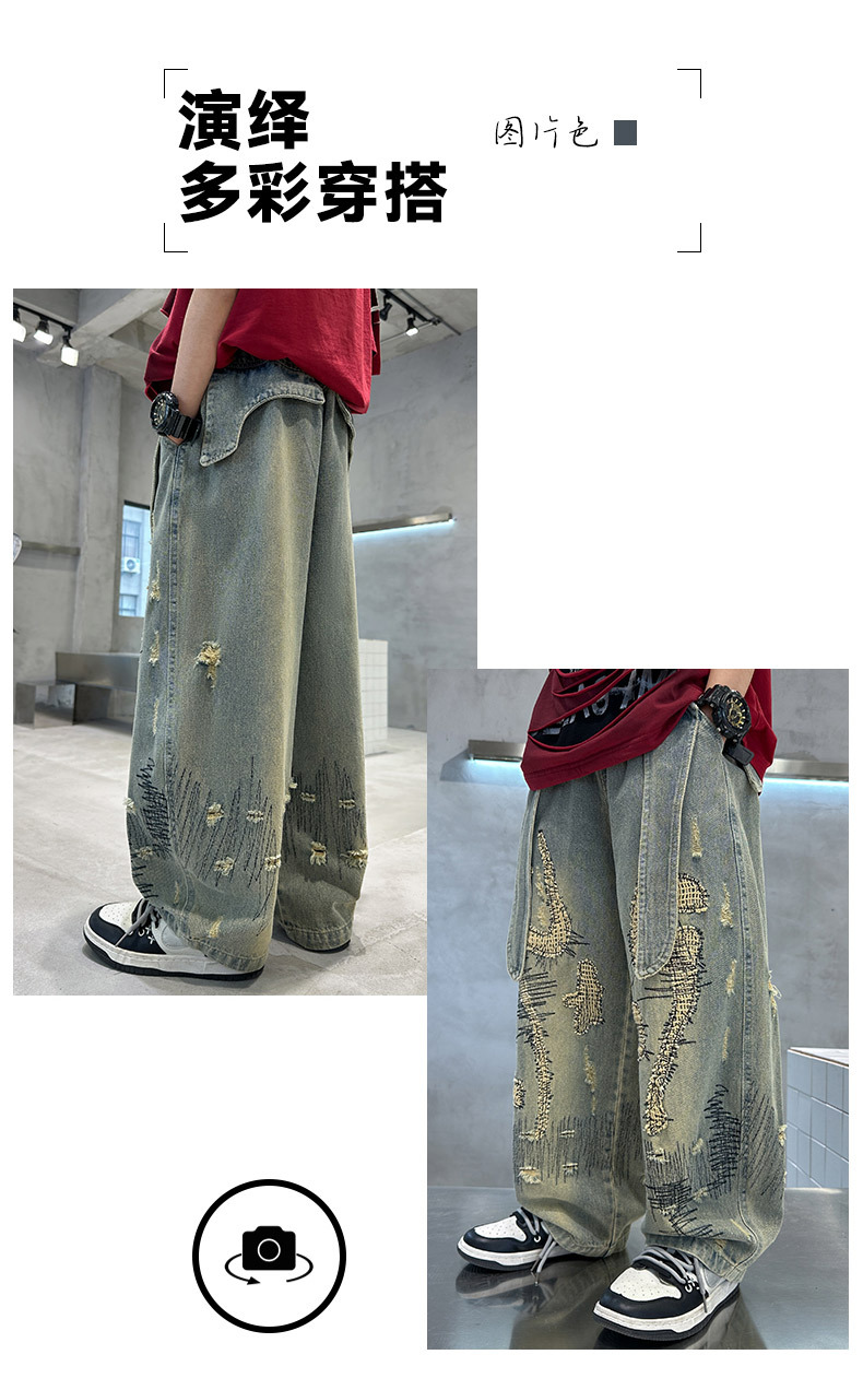 남아용 자수 데님 팬츠, 사계절용 아동용 웨이브 팬츠, 중대형 아동용, 멋스럽고 패셔너블하며 부드럽고 가볍고 답답하지 않음