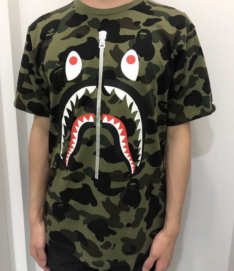 일본 트렌디 브랜드 Bape 카모플라주 상어 입 원숭이 머리 프린트 컬러 블록 야광 커플 조인트 반팔 티셔츠스토어 가기