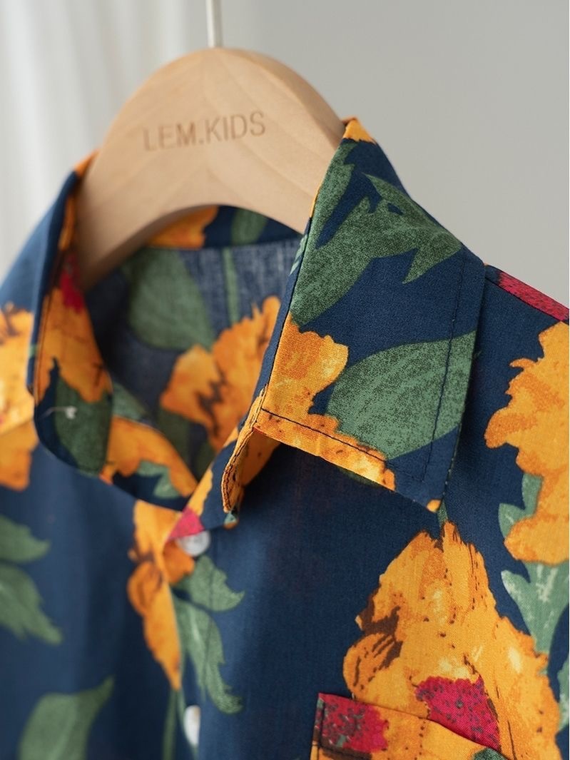 어린이 소년 셔츠 2025 어린이와 아기를위한 새로운 반팔 홍콩 스타일 꽃 셔츠 정장 투피스 여름 정장
