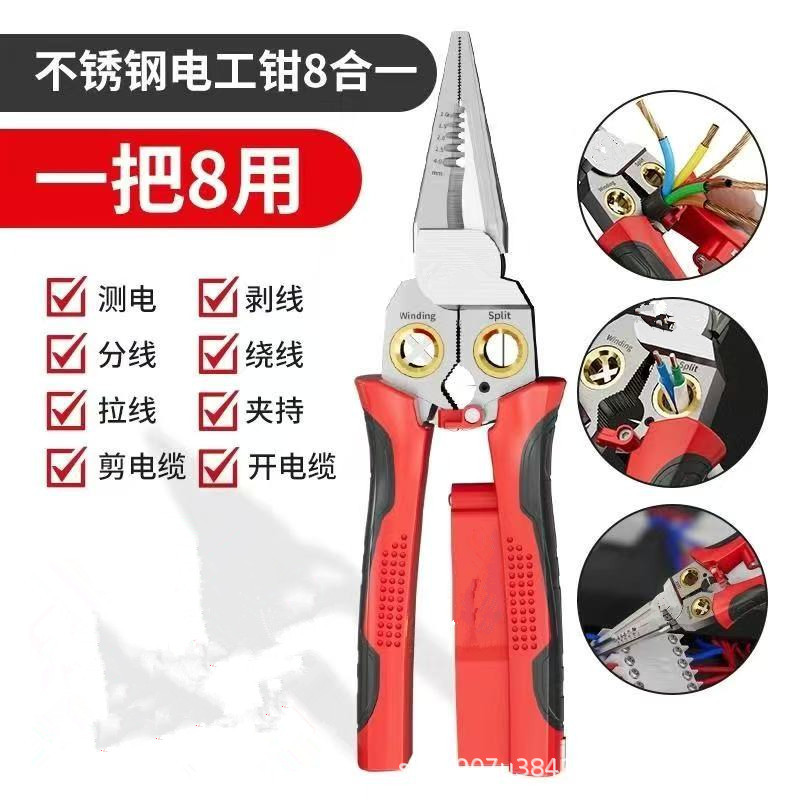 전기 테스트 펜이있는 전기 와이어 스트리핑 펜치 8-in-1 스테인레스 스틸 스트리핑 바늘 코 펜치 미끄럼 방지 다기능 와이어 스트리퍼