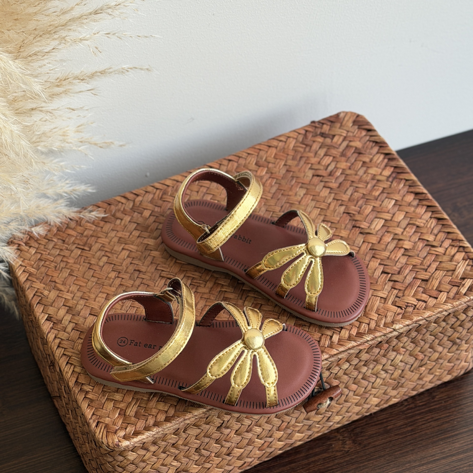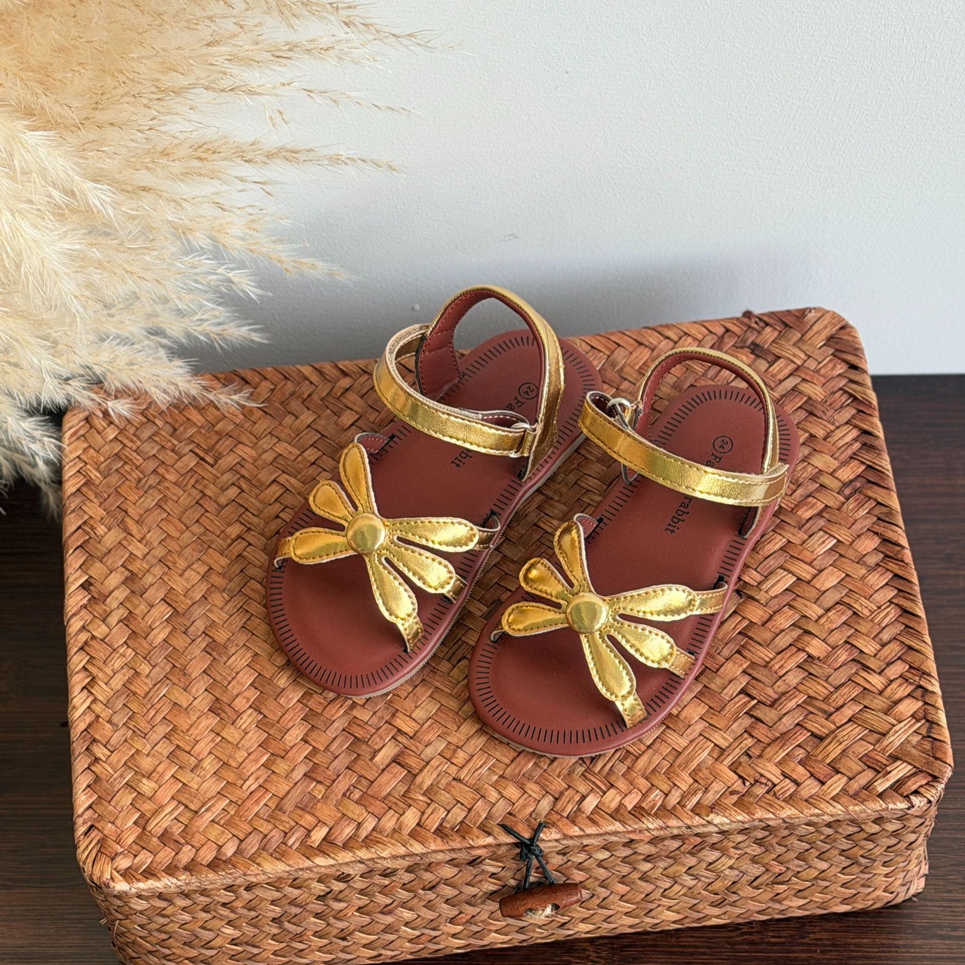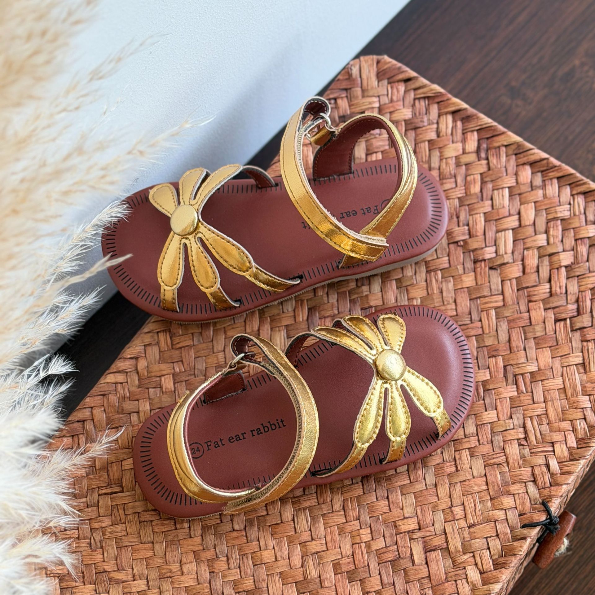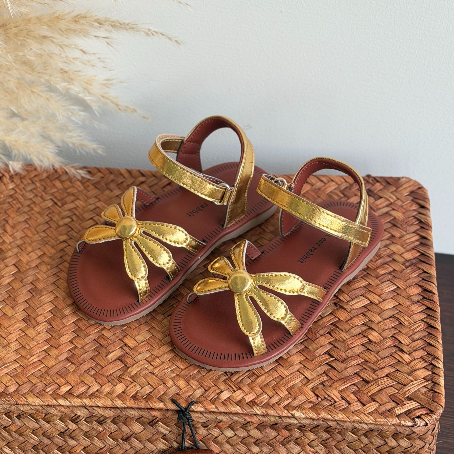 한국 스타일 소녀 샌들 황금 꽃 오픈 발가락 공주 비치 신발 부드러운 바닥 편안한 소녀 미끄럼 방지 로마 직조