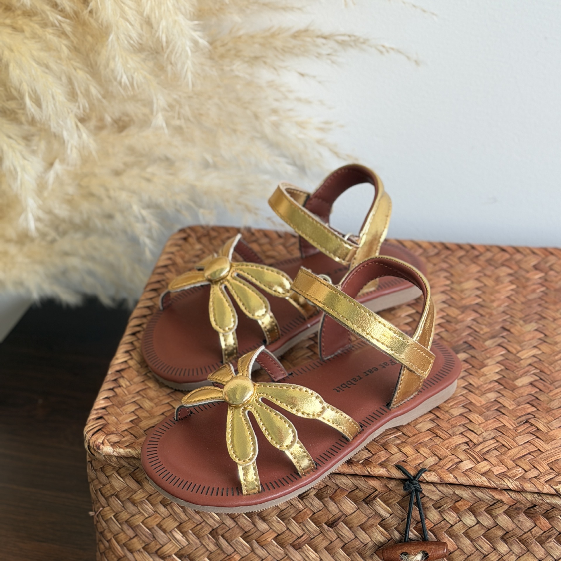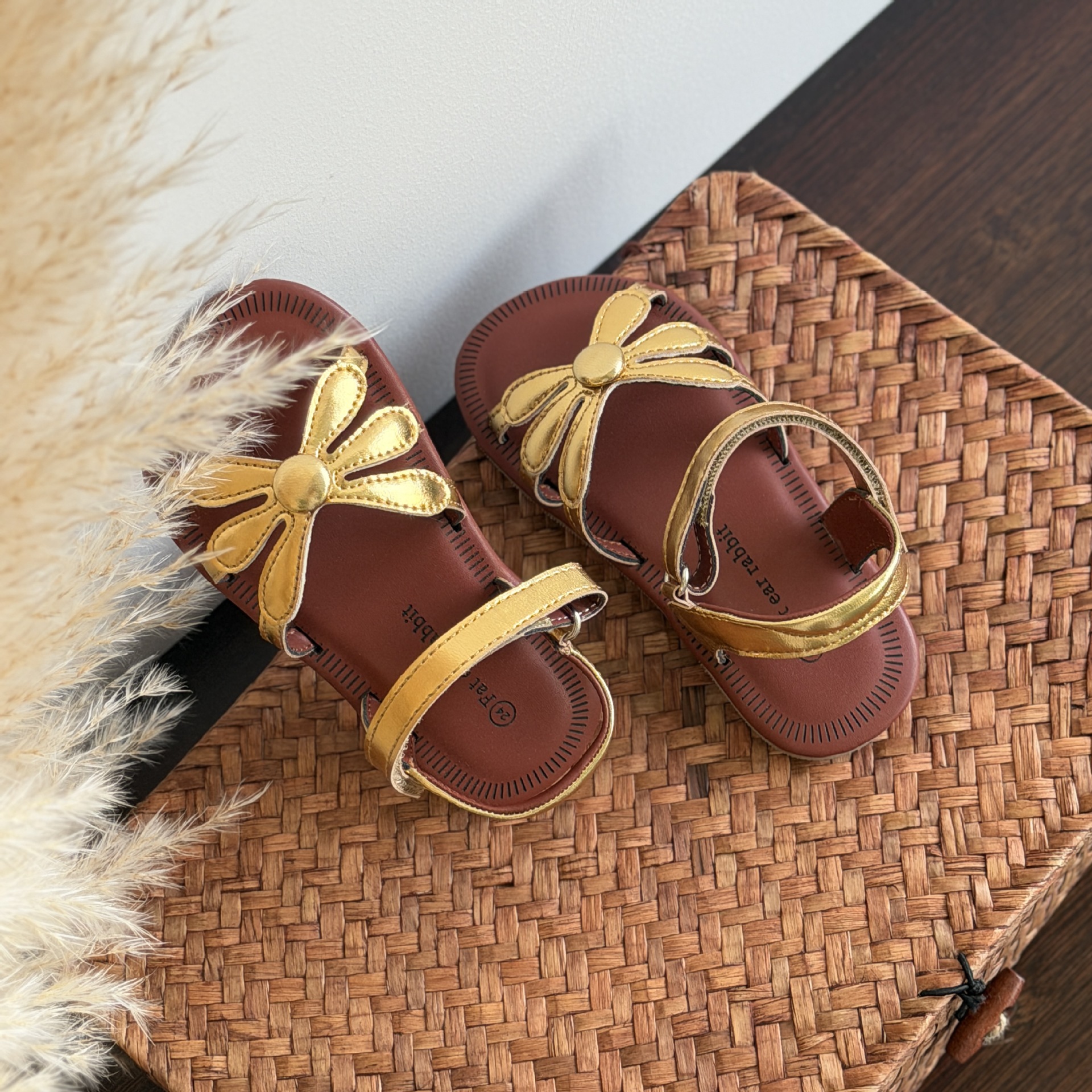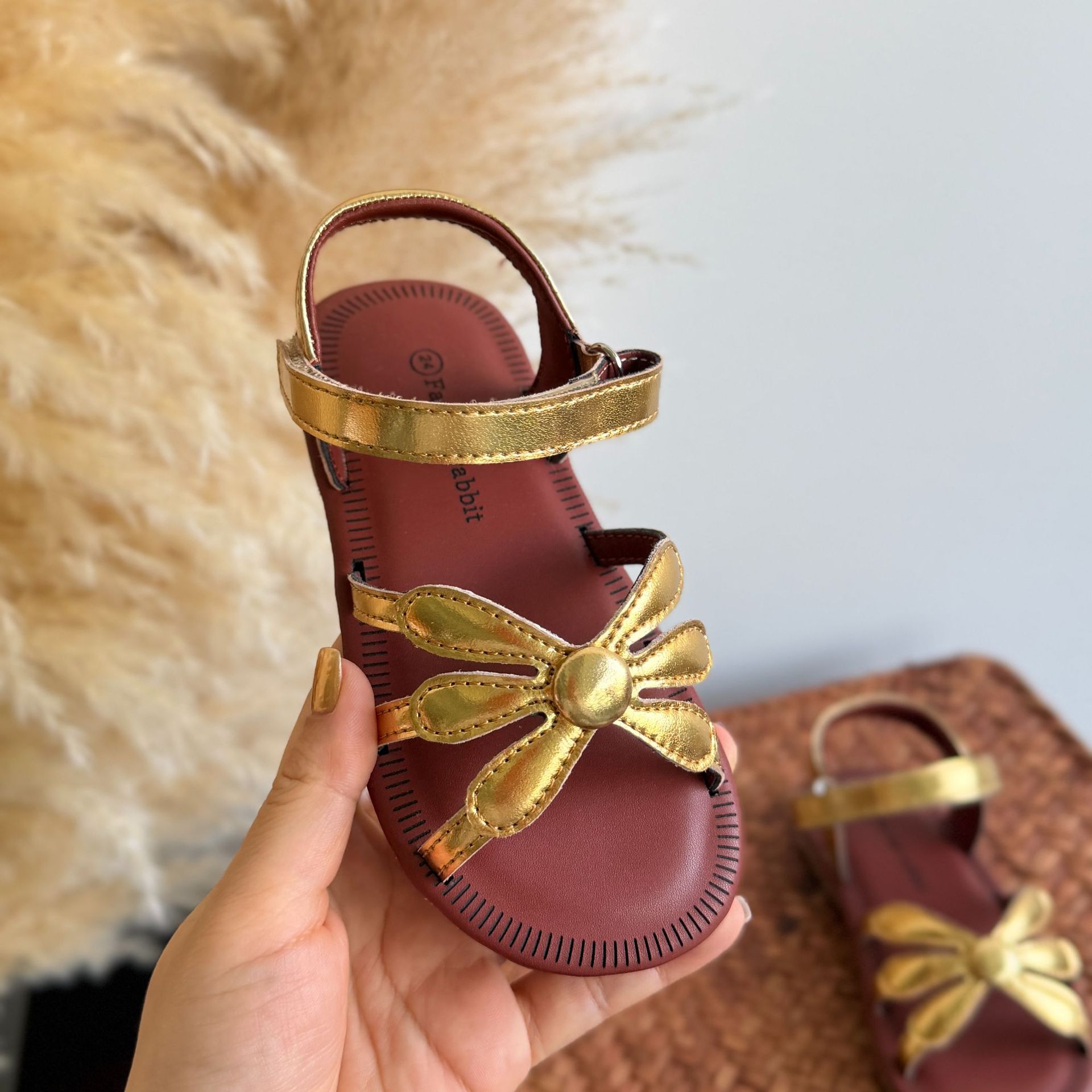 한국 스타일 소녀 샌들 황금 꽃 오픈 발가락 공주 비치 신발 부드러운 바닥 편안한 소녀 미끄럼 방지 로마 직조