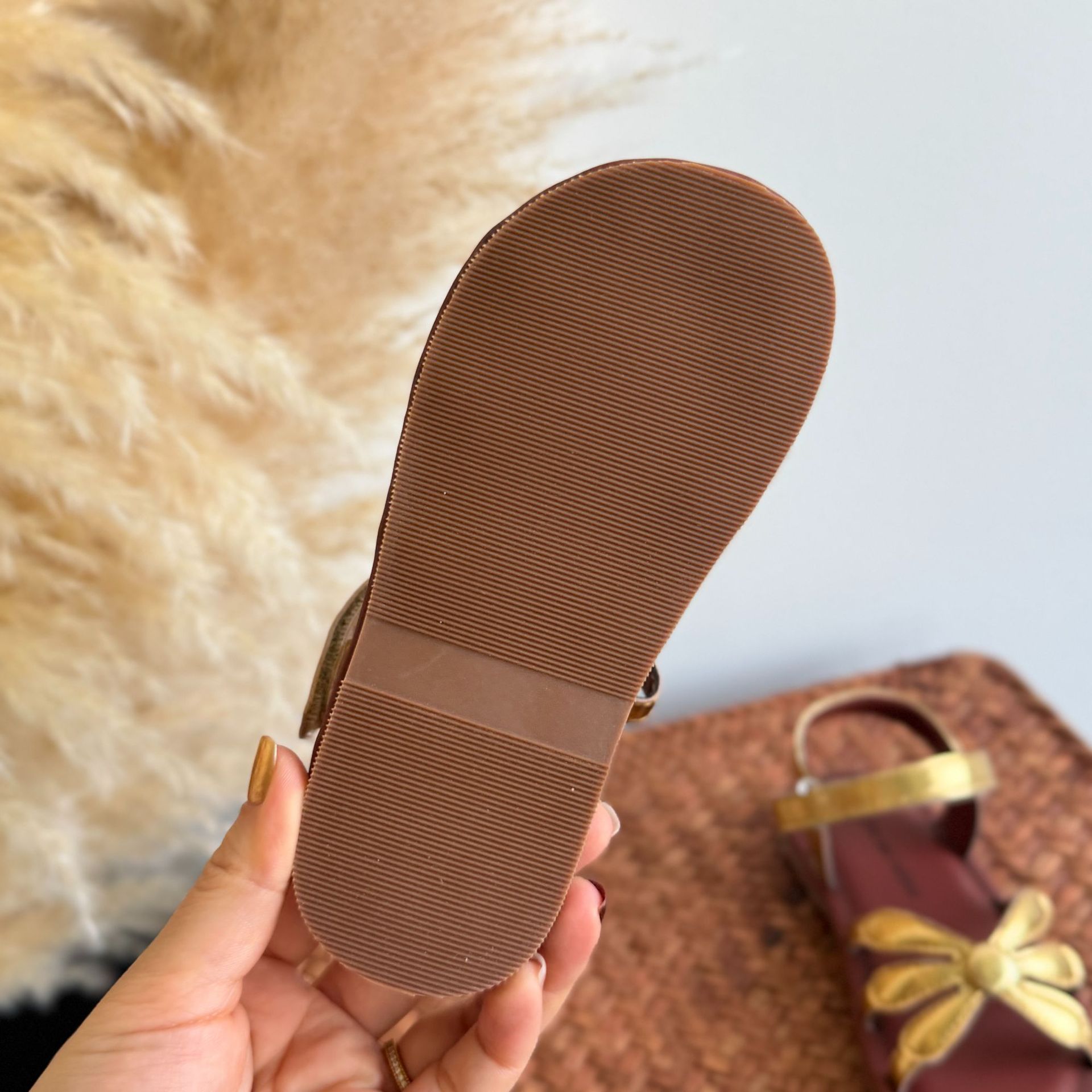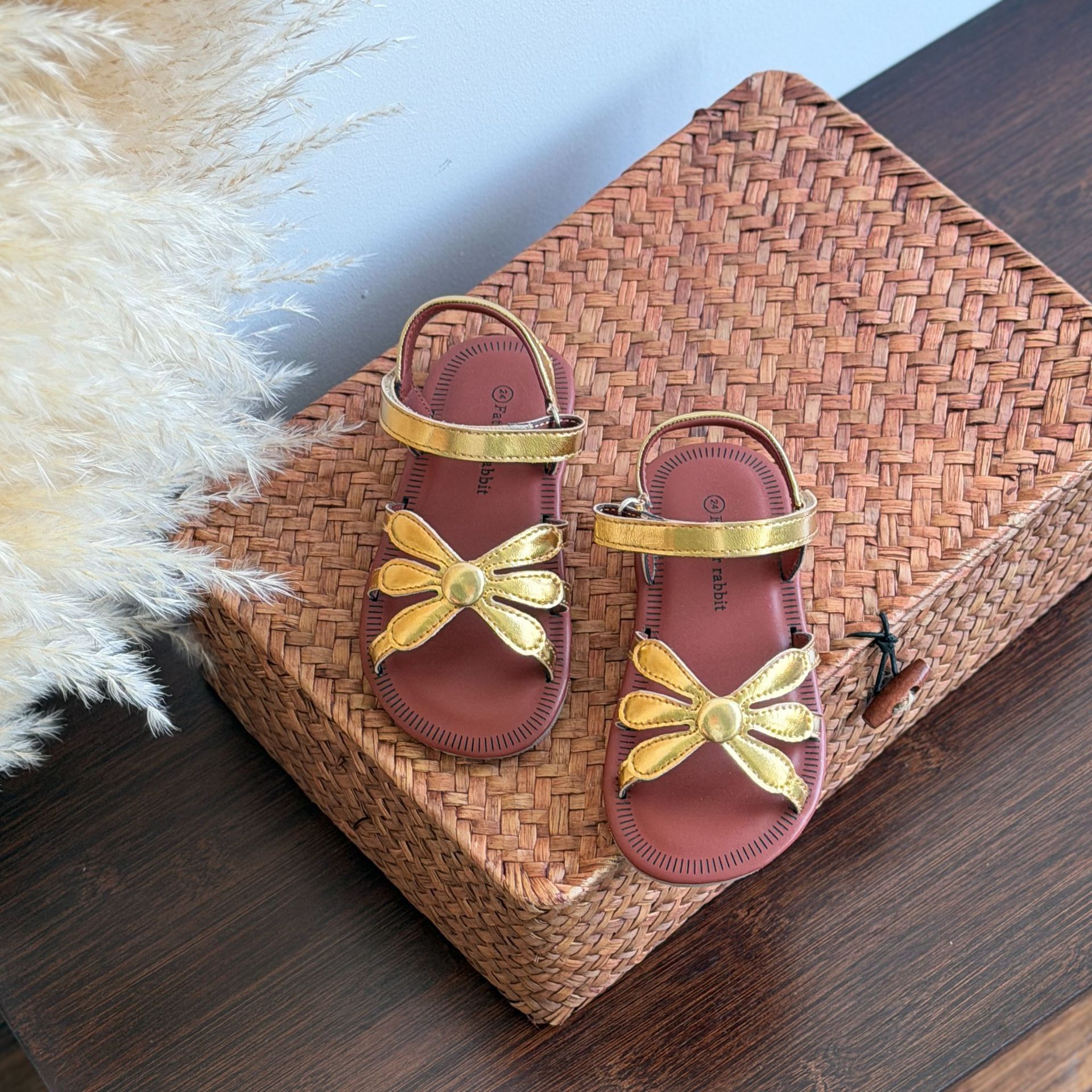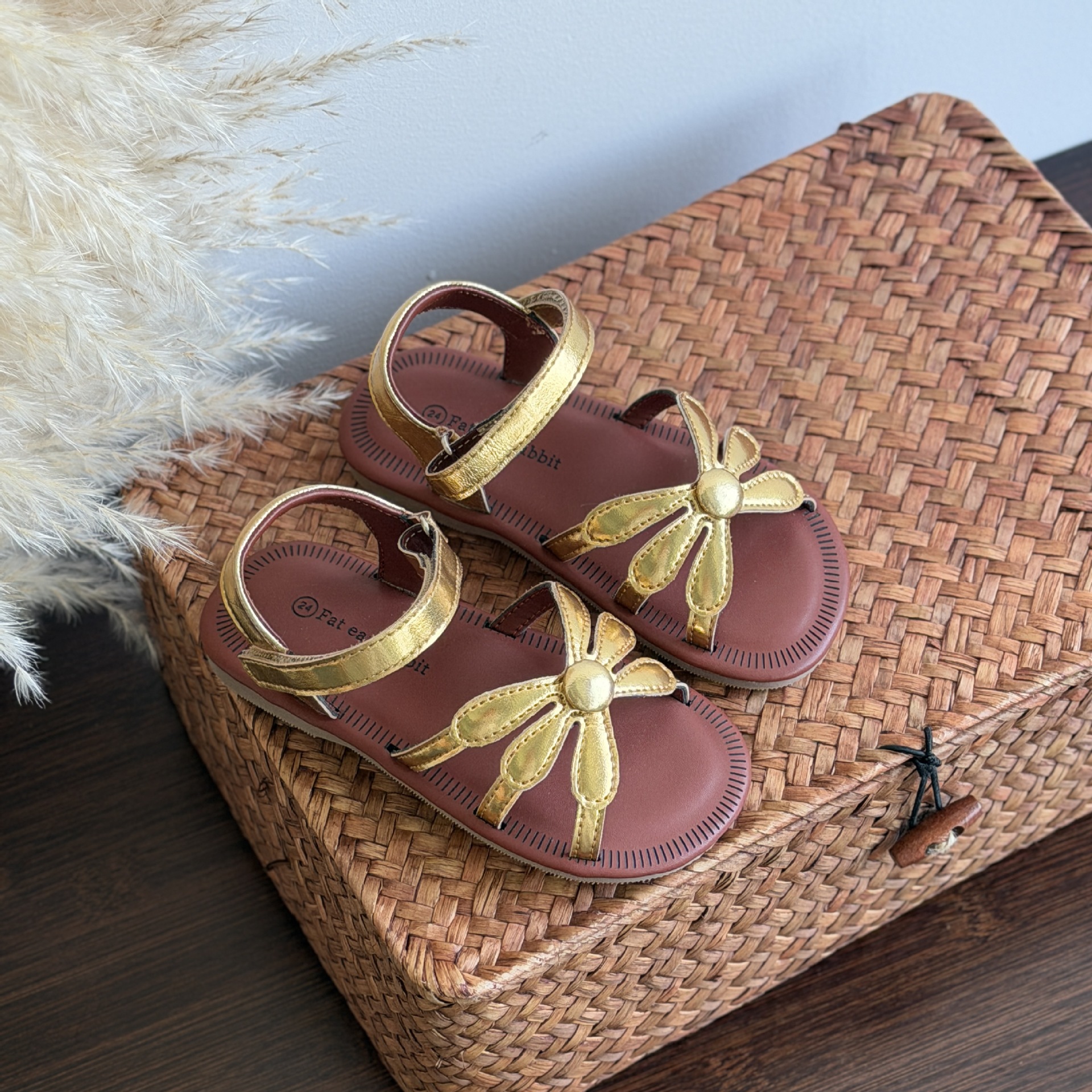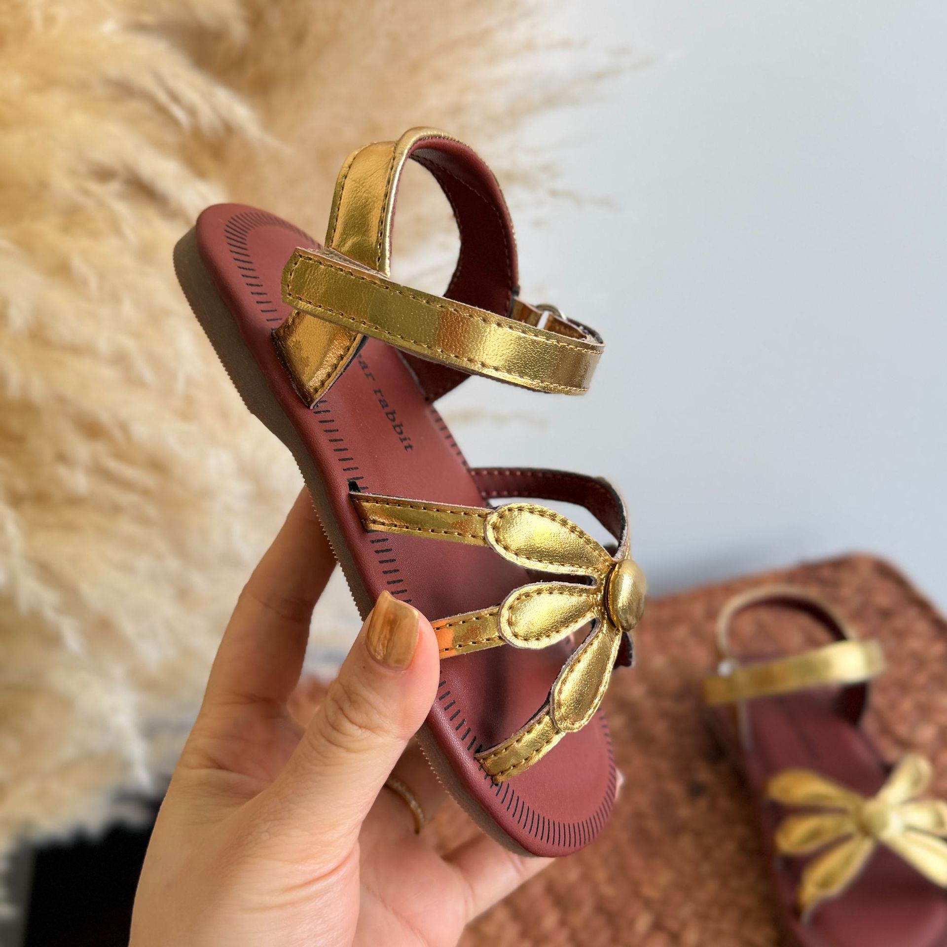 한국 스타일 소녀 샌들 황금 꽃 오픈 발가락 공주 비치 신발 부드러운 바닥 편안한 소녀 미끄럼 방지 로마 직조