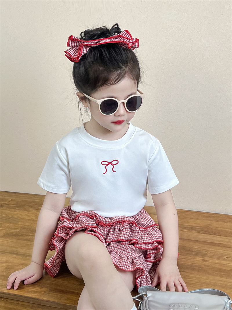 2025 새로운 여름 한국 스타일 아동 의류 소녀 달콤한 수 놓은 활 반팔 티셔츠 레드 체크 무늬 케이크 스커트