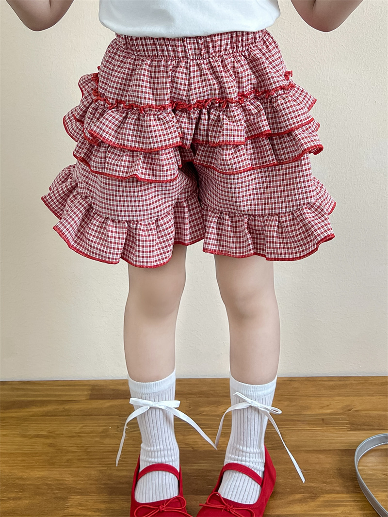 2025 새로운 여름 한국 스타일 아동 의류 소녀 달콤한 수 놓은 활 반팔 티셔츠 레드 체크 무늬 케이크 스커트스토어 가기