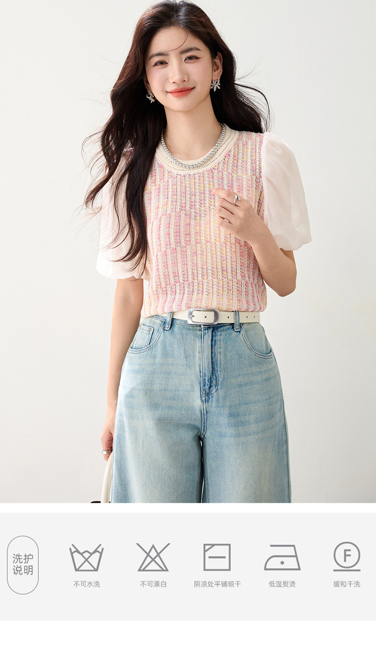 여성을위한 프렌치 퍼프 슬리브 쉬폰 스플 라이스 스웨터 2025 여름 달콤한 슬리밍 반팔 연령 감소 기질 탑스토어 가기