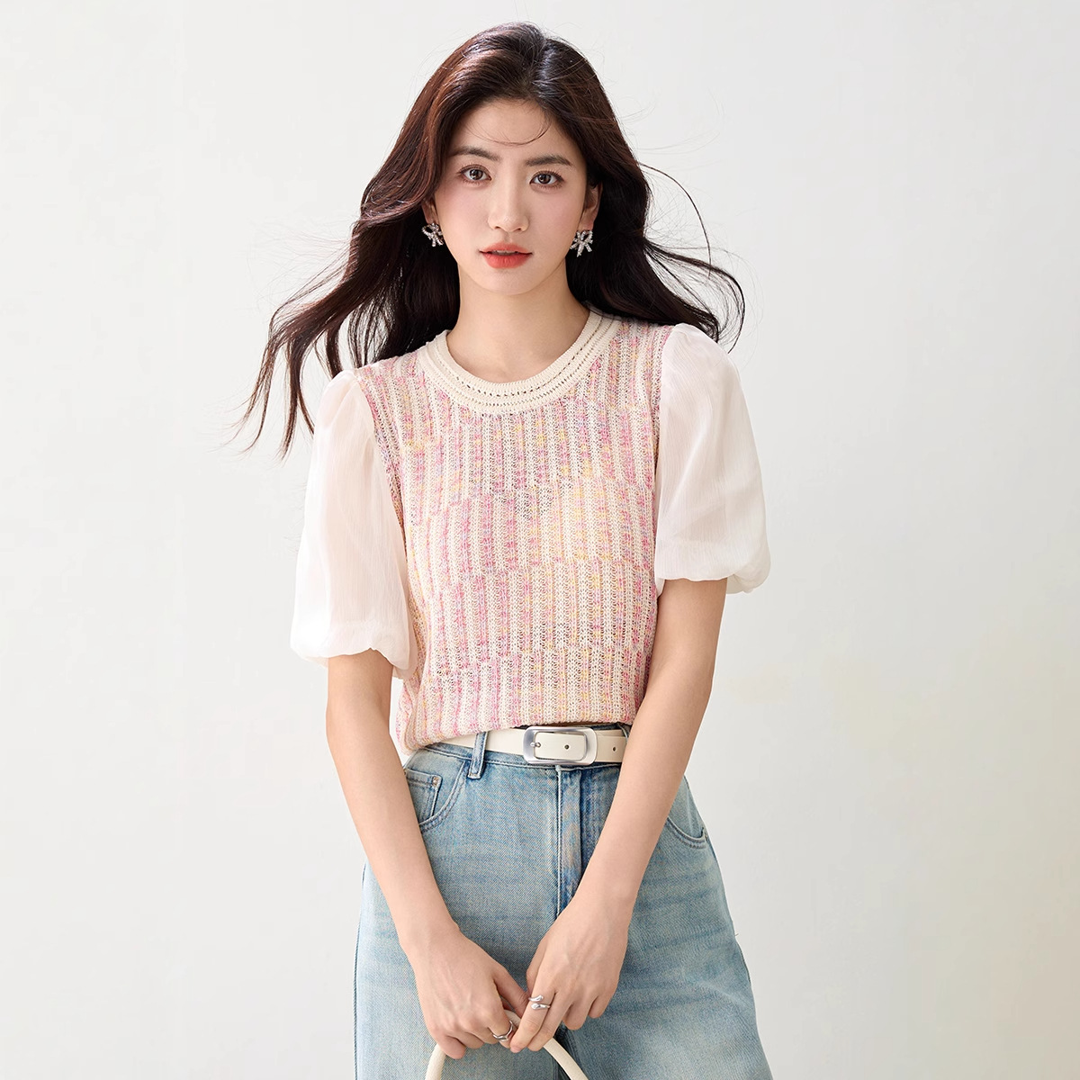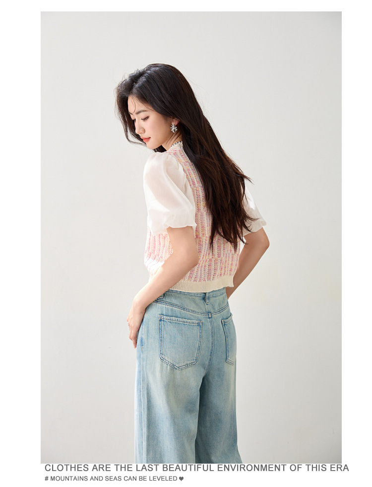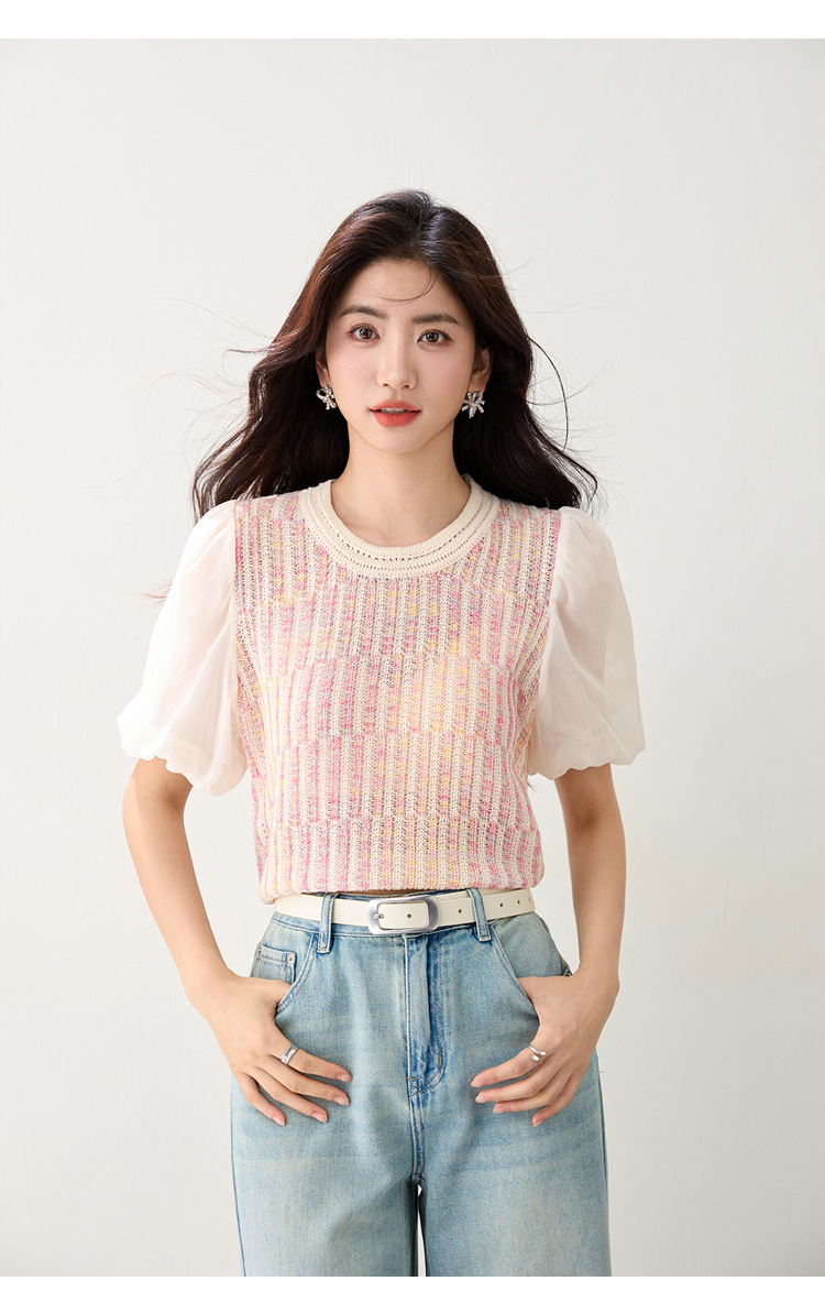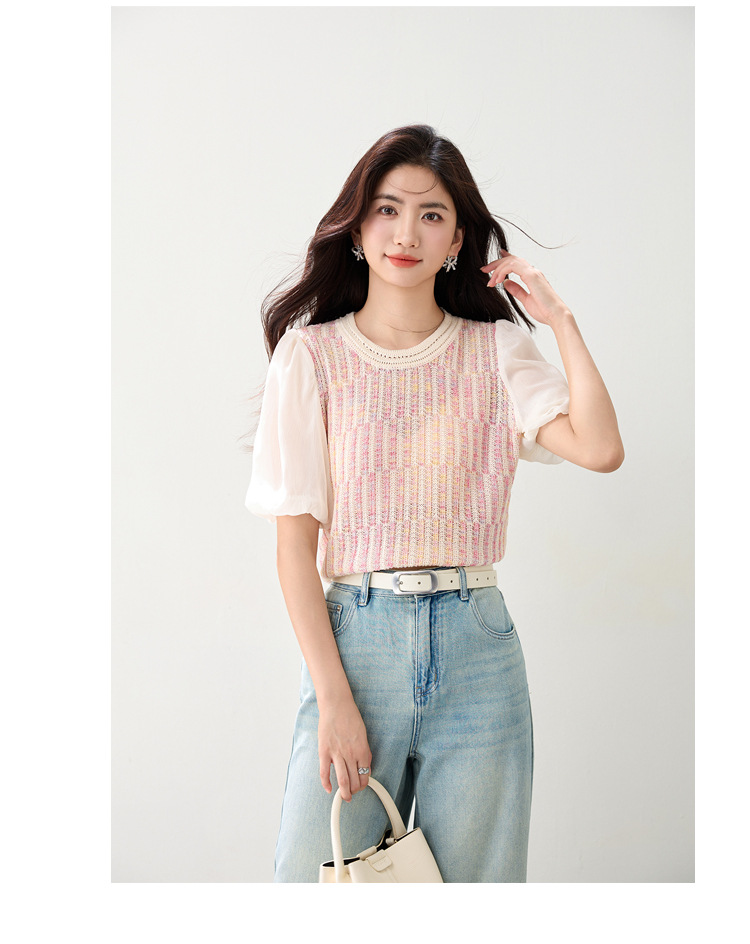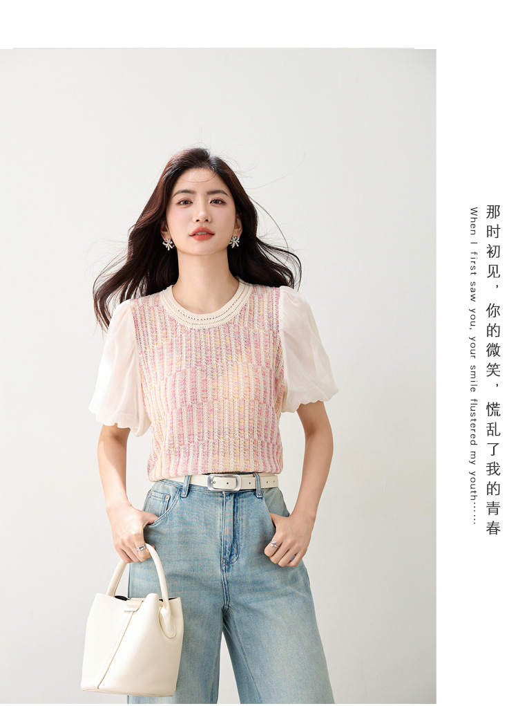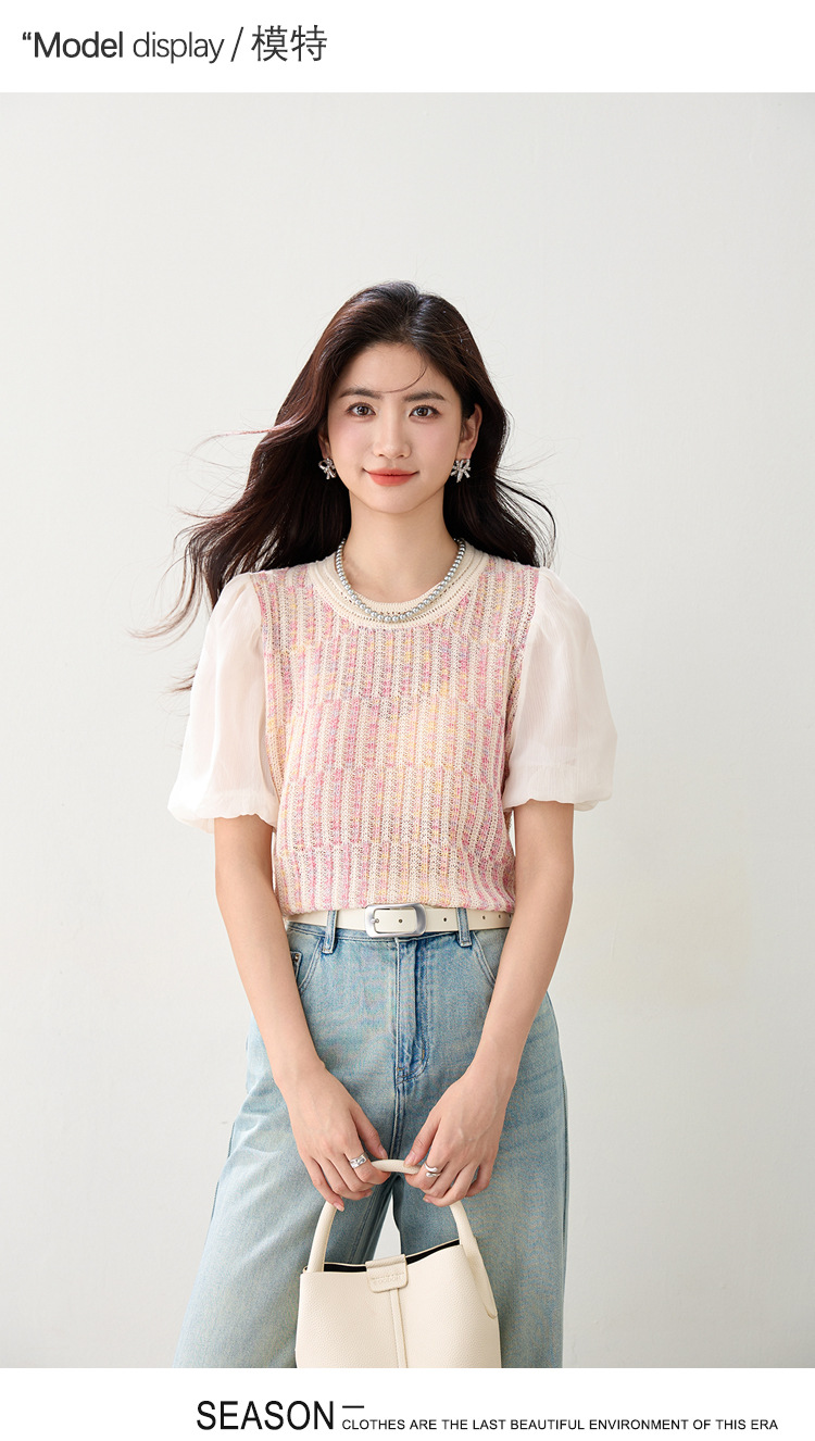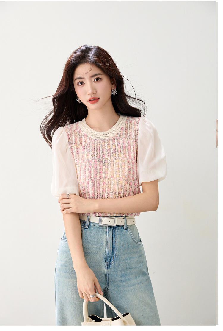 여성을위한 프렌치 퍼프 슬리브 쉬폰 스플 라이스 스웨터 2025 여름 달콤한 슬리밍 반팔 연령 감소 기질 탑
