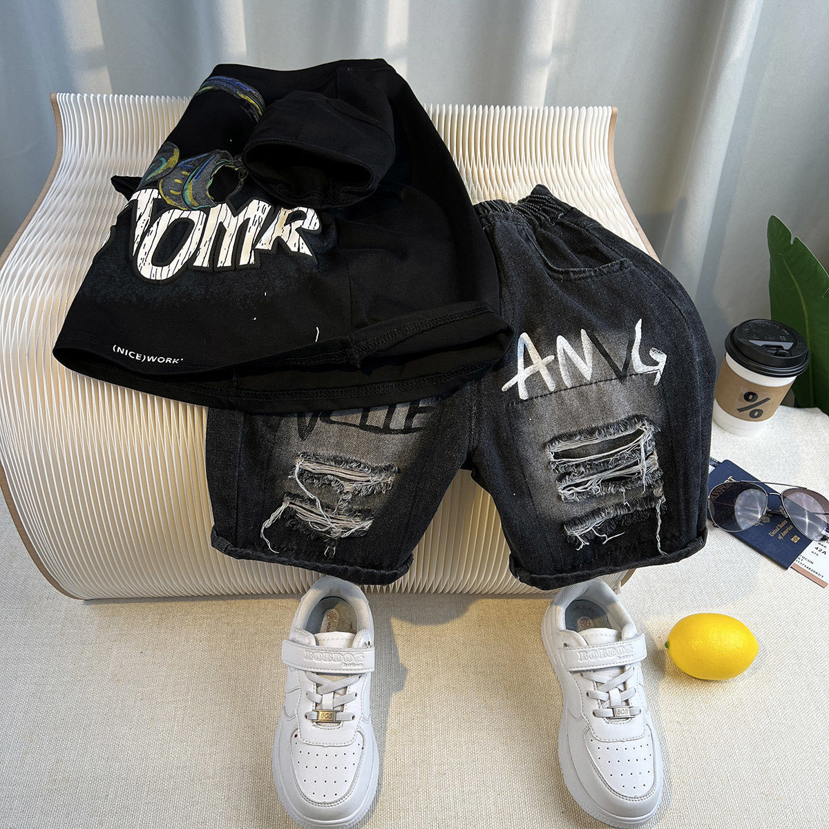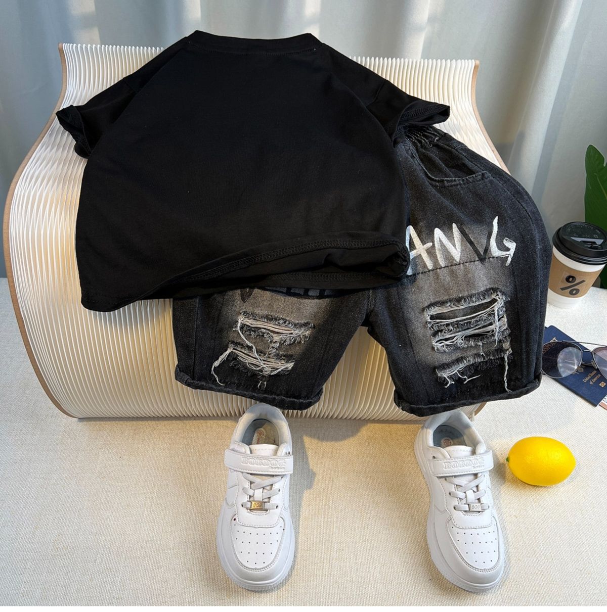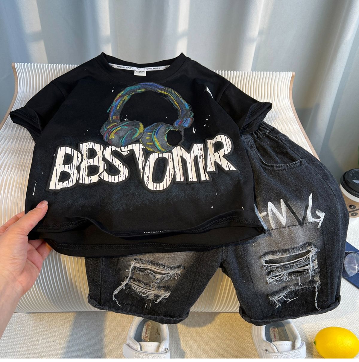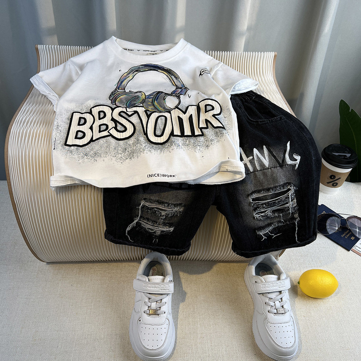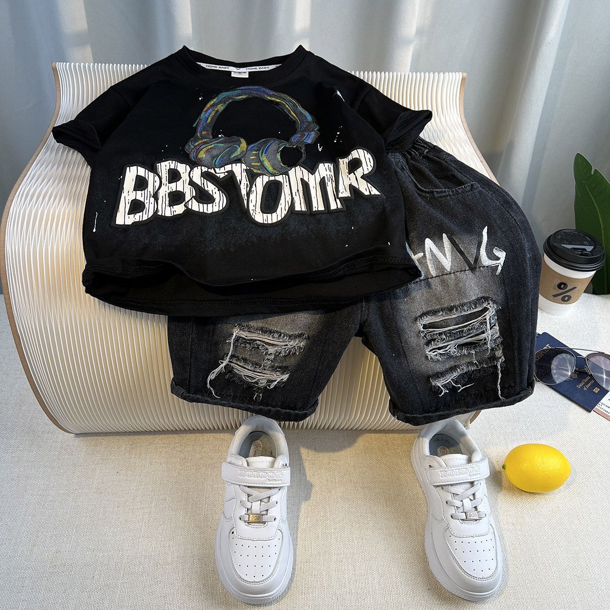 어린이 세트 소년 여름 2025 새로운 러피 잘 생긴 소년 반팔 티셔츠 투피스 아기 여름 옷 얇은스토어 가기