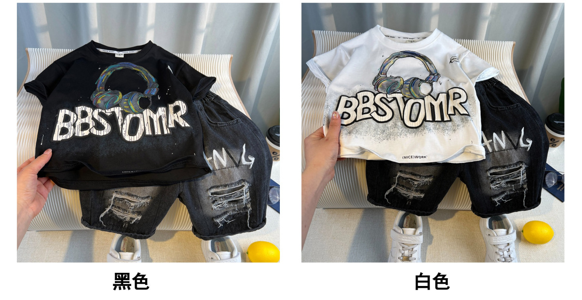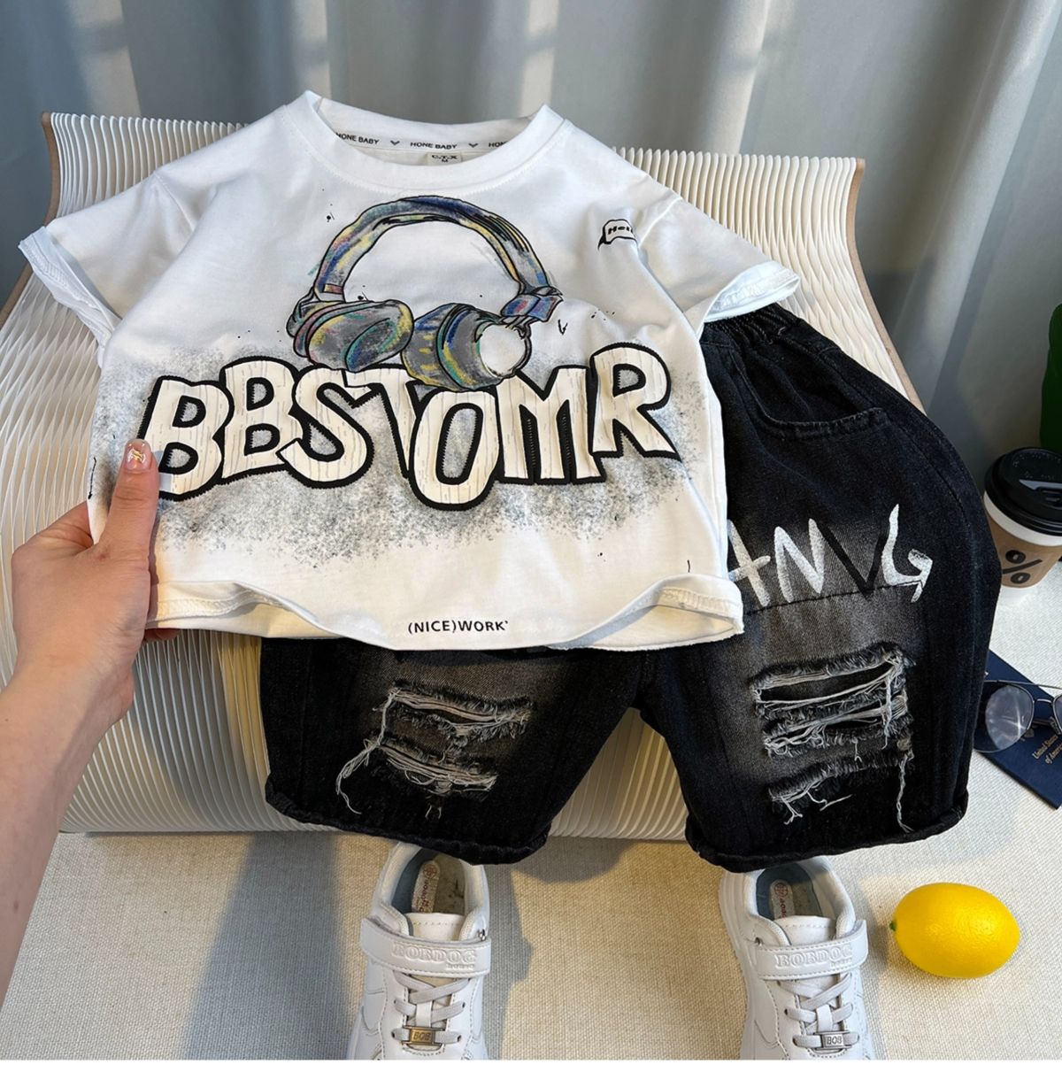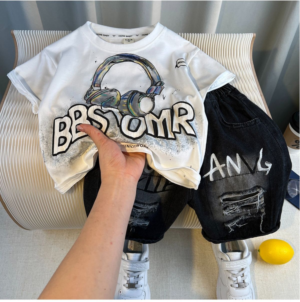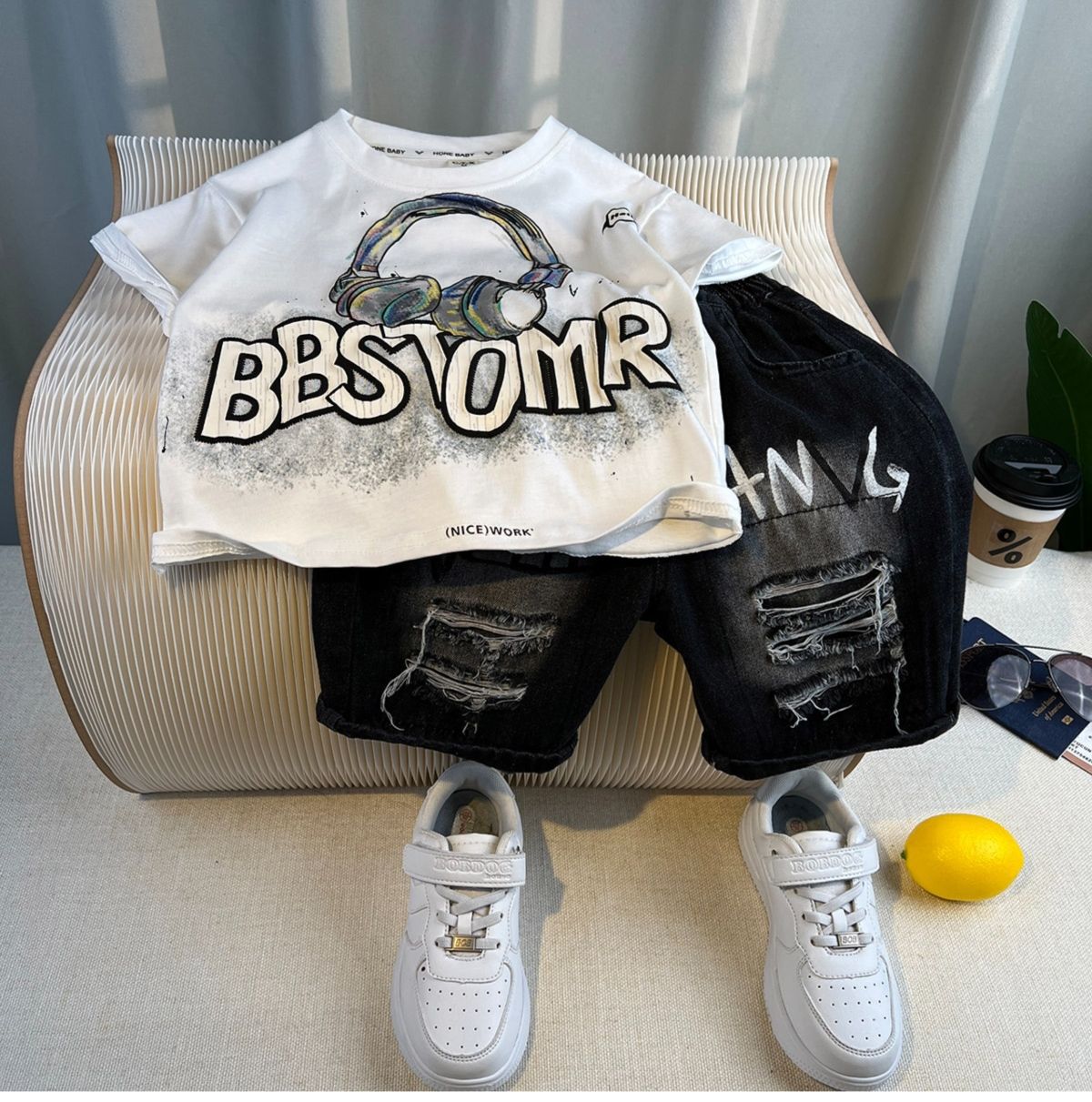 어린이 세트 소년 여름 2025 새로운 러피 잘 생긴 소년 반팔 티셔츠 투피스 아기 여름 옷 얇은스토어 가기