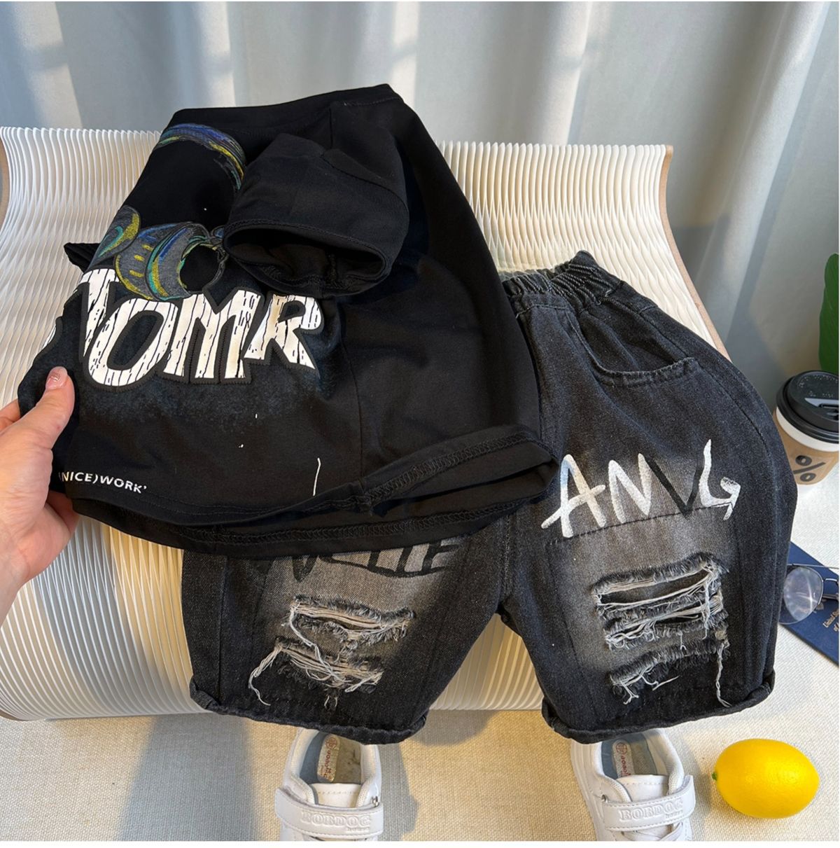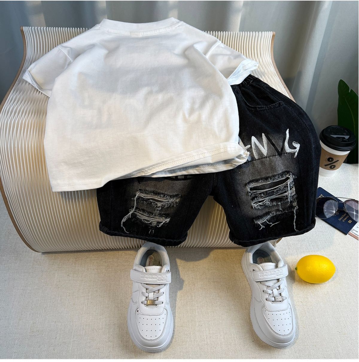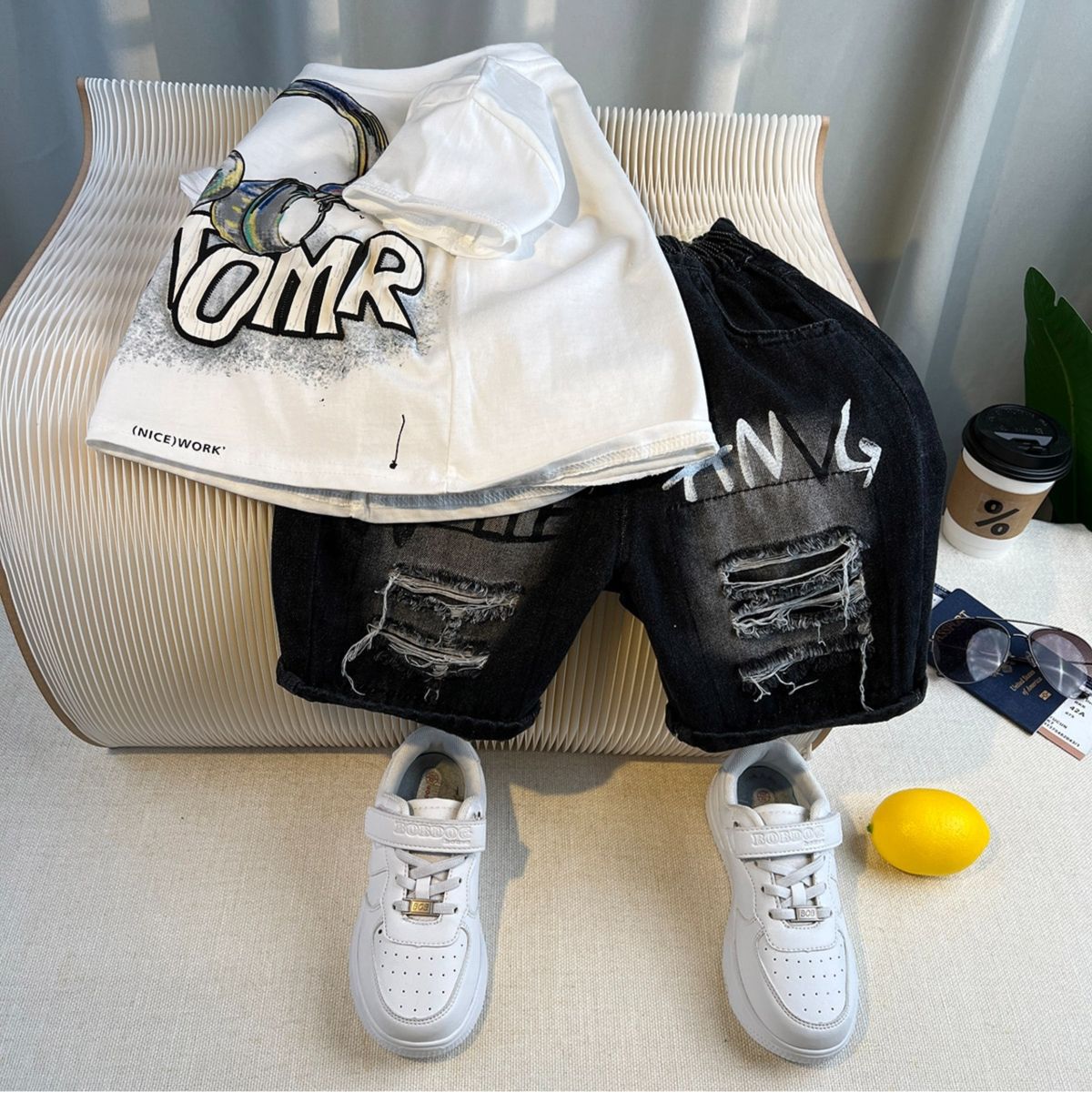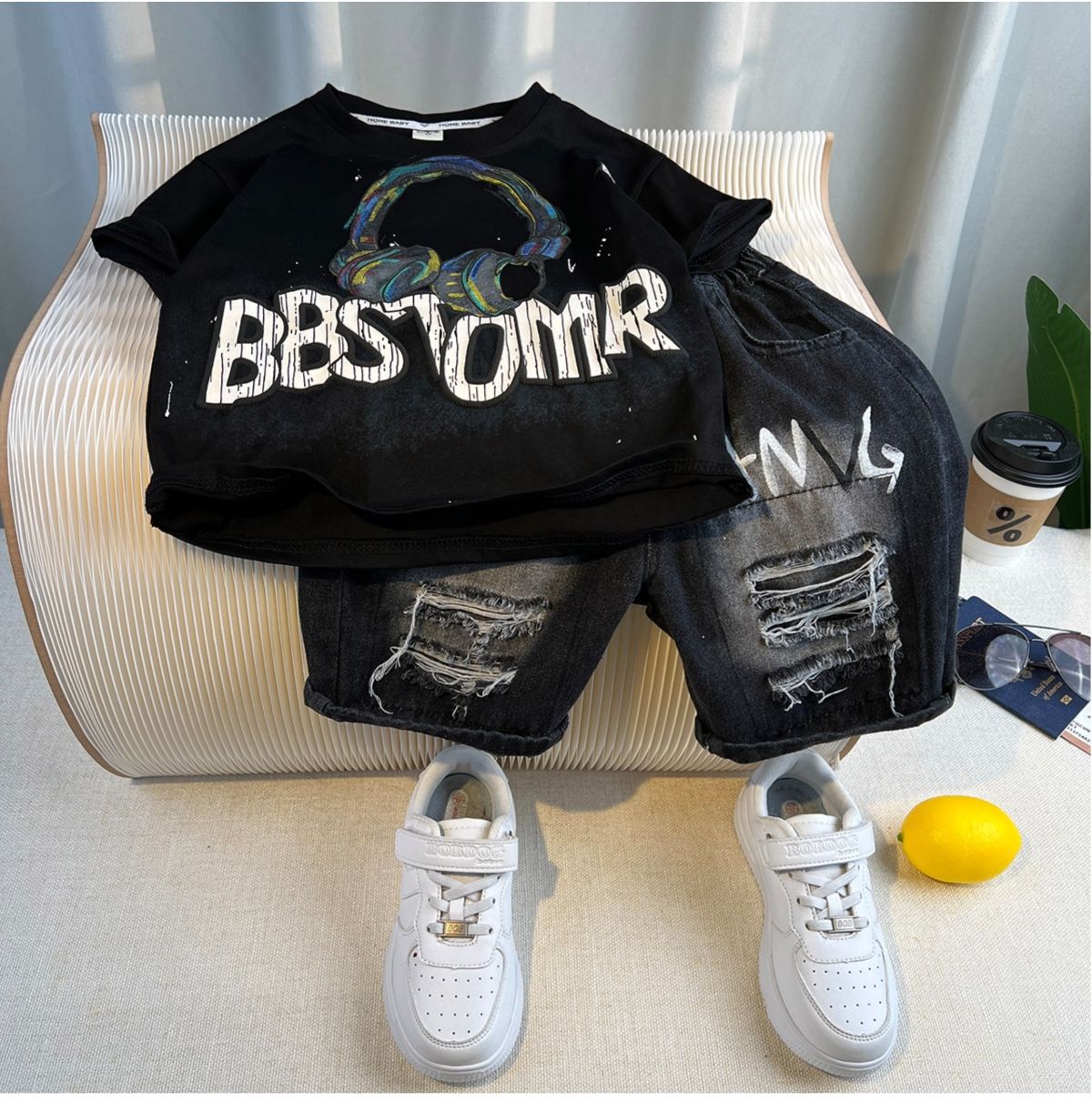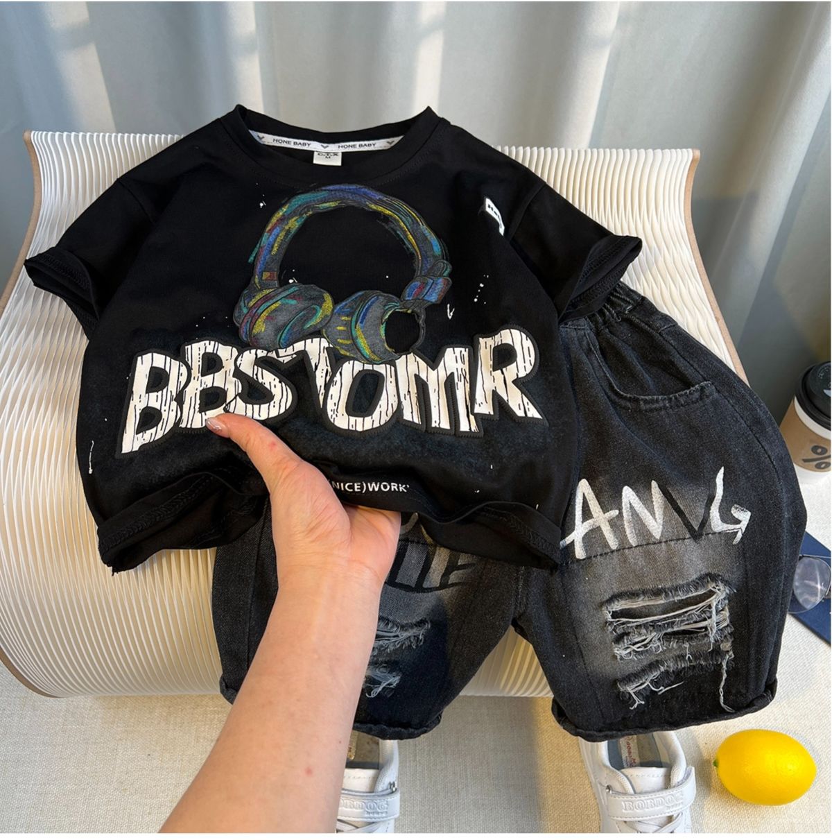 어린이 세트 소년 여름 2025 새로운 러피 잘 생긴 소년 반팔 티셔츠 투피스 아기 여름 옷 얇은스토어 가기