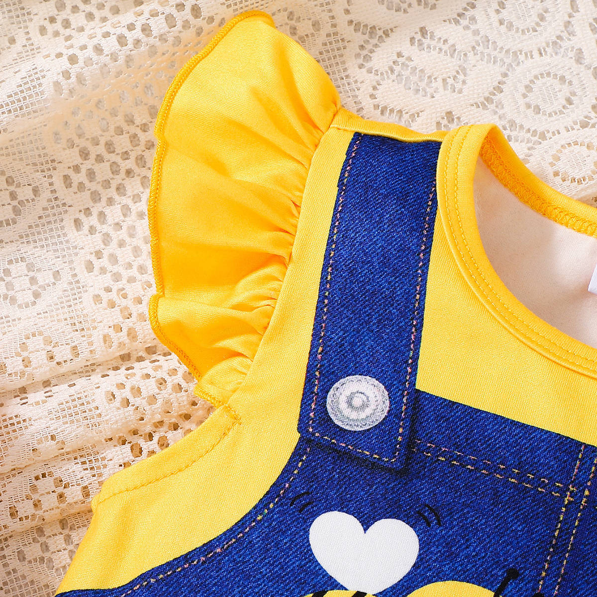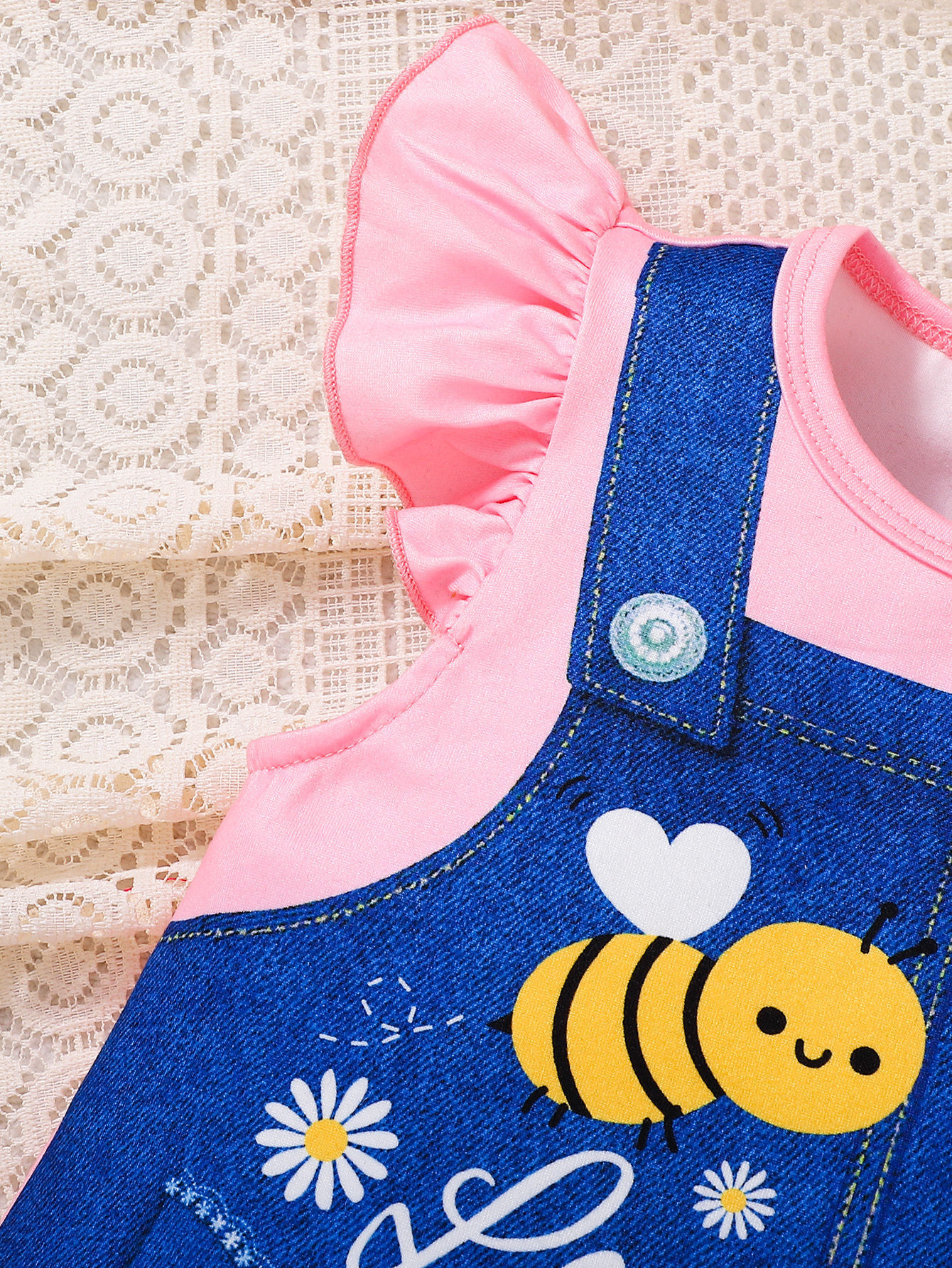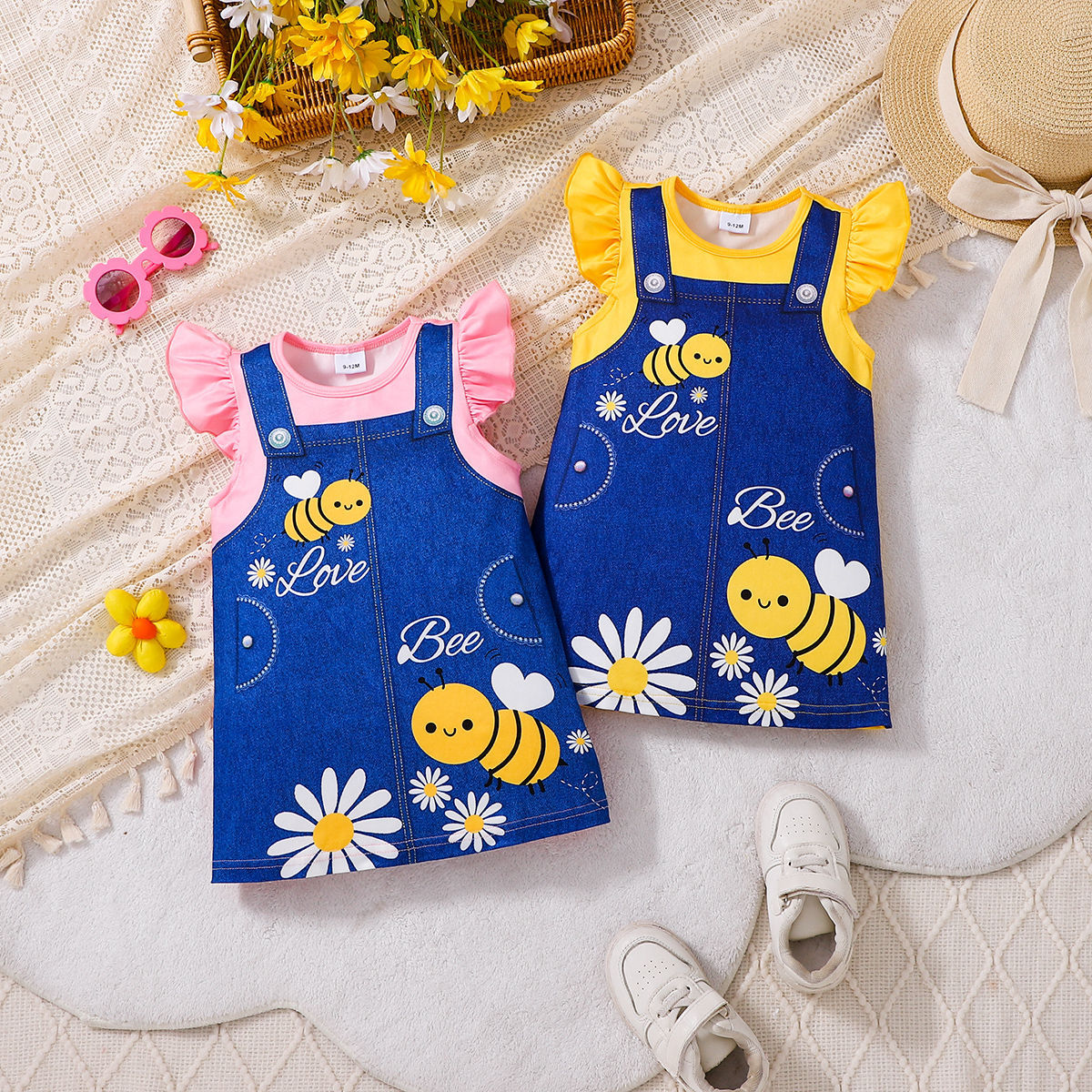 아동복 유럽과 미국 스타일의 소녀 귀여운 꿀벌 스트랩 프린트 라운드 넥 플라잉 슬리브 캐주얼 드레스 Bee Fun