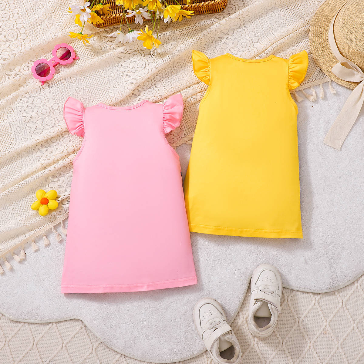 아동복 유럽과 미국 스타일의 소녀 귀여운 꿀벌 스트랩 프린트 라운드 넥 플라잉 슬리브 캐주얼 드레스 Bee Fun스토어 가기