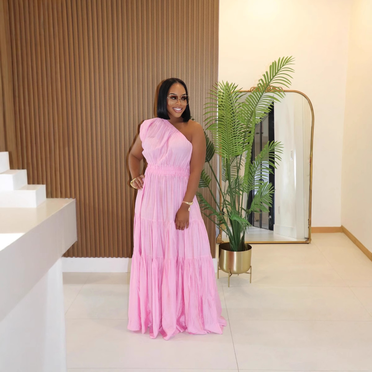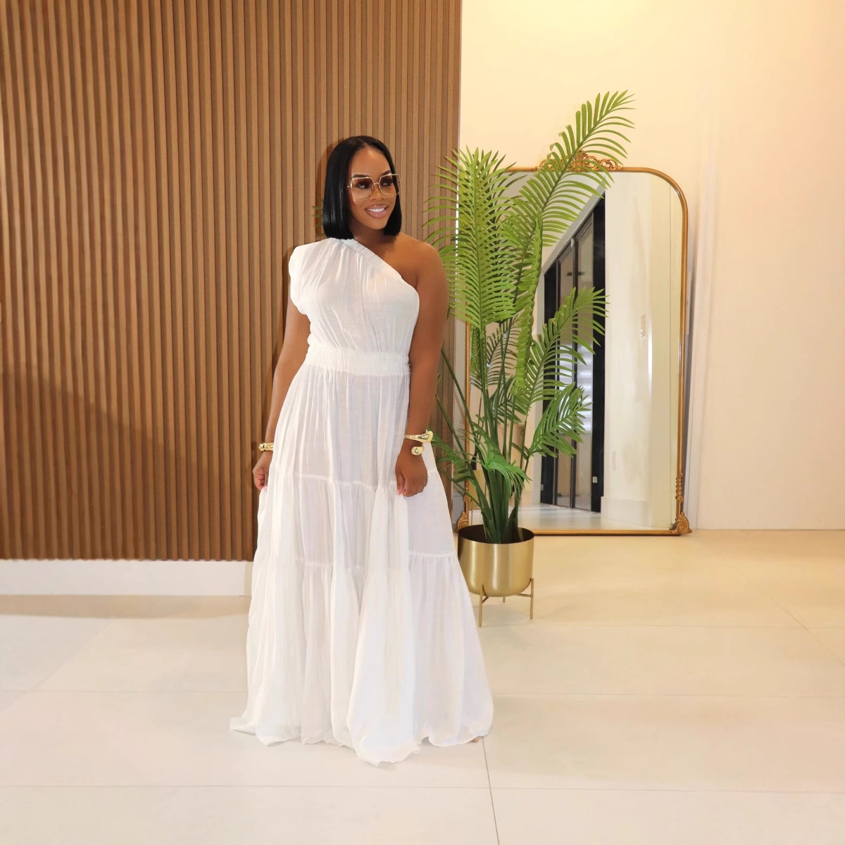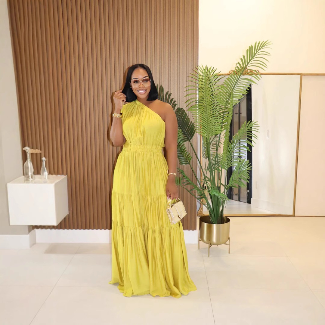 Y1337 아마존 봄과 여름 유럽과 미국의 새로운 린넨 여성 패션 기질 단색 어깨 긴 원피스