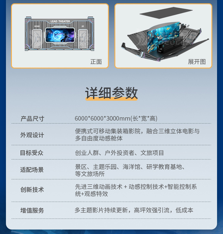 9D 플라이오버 시어터 편리한 이동식 컨테이너 대형 무안경식 행잉 7D 트랙 시네마 구형 스크린 시네마스토어 가기
